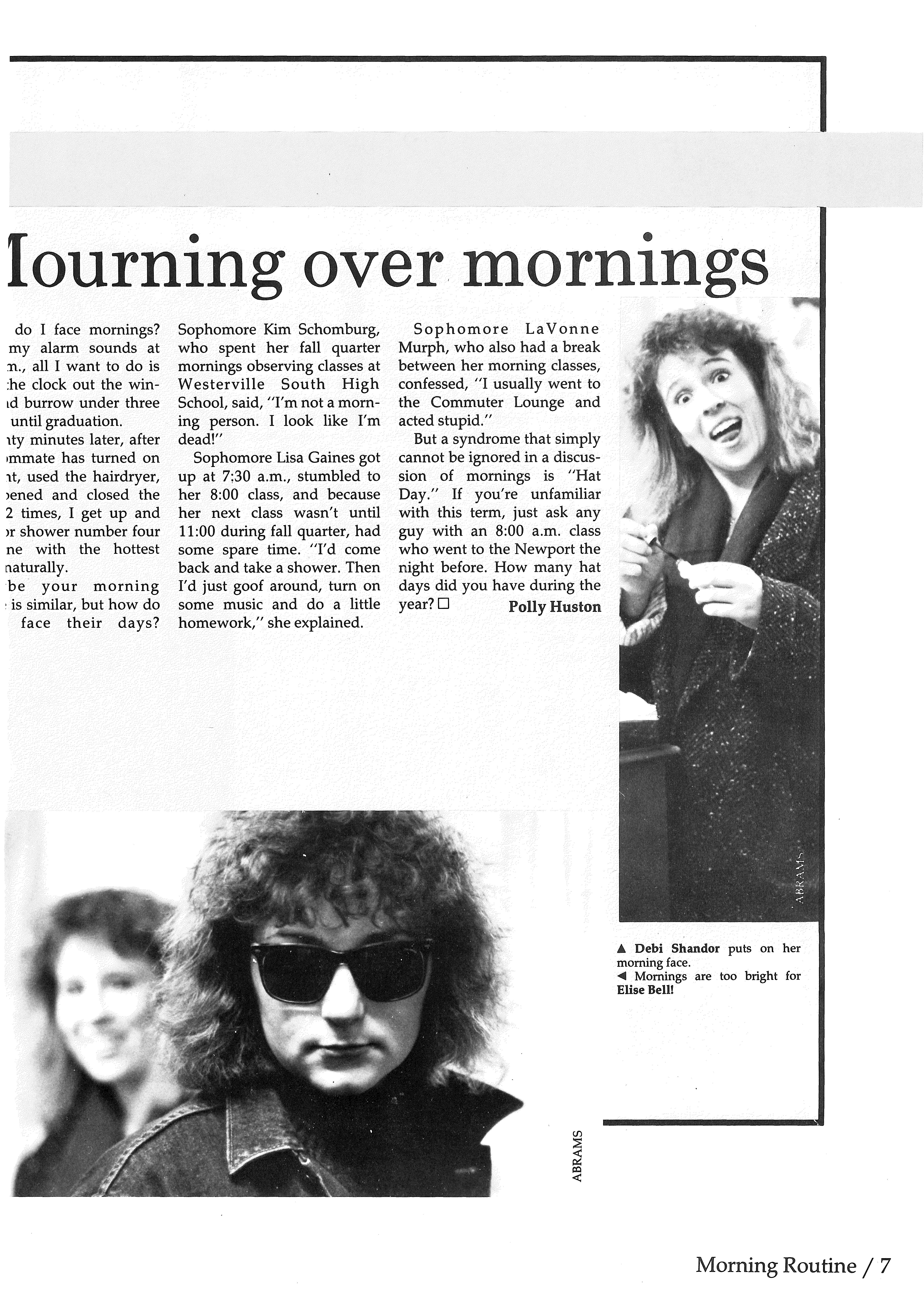 But a syndrome that simply cannot be ignored in a discussion of mornings is "Hat Day." If · you're unfamiliar with this term, just ask any guy with an 8:00 a.m. class who went to the Newport the night before. How many hat days did you have during the year? D Polly Huston