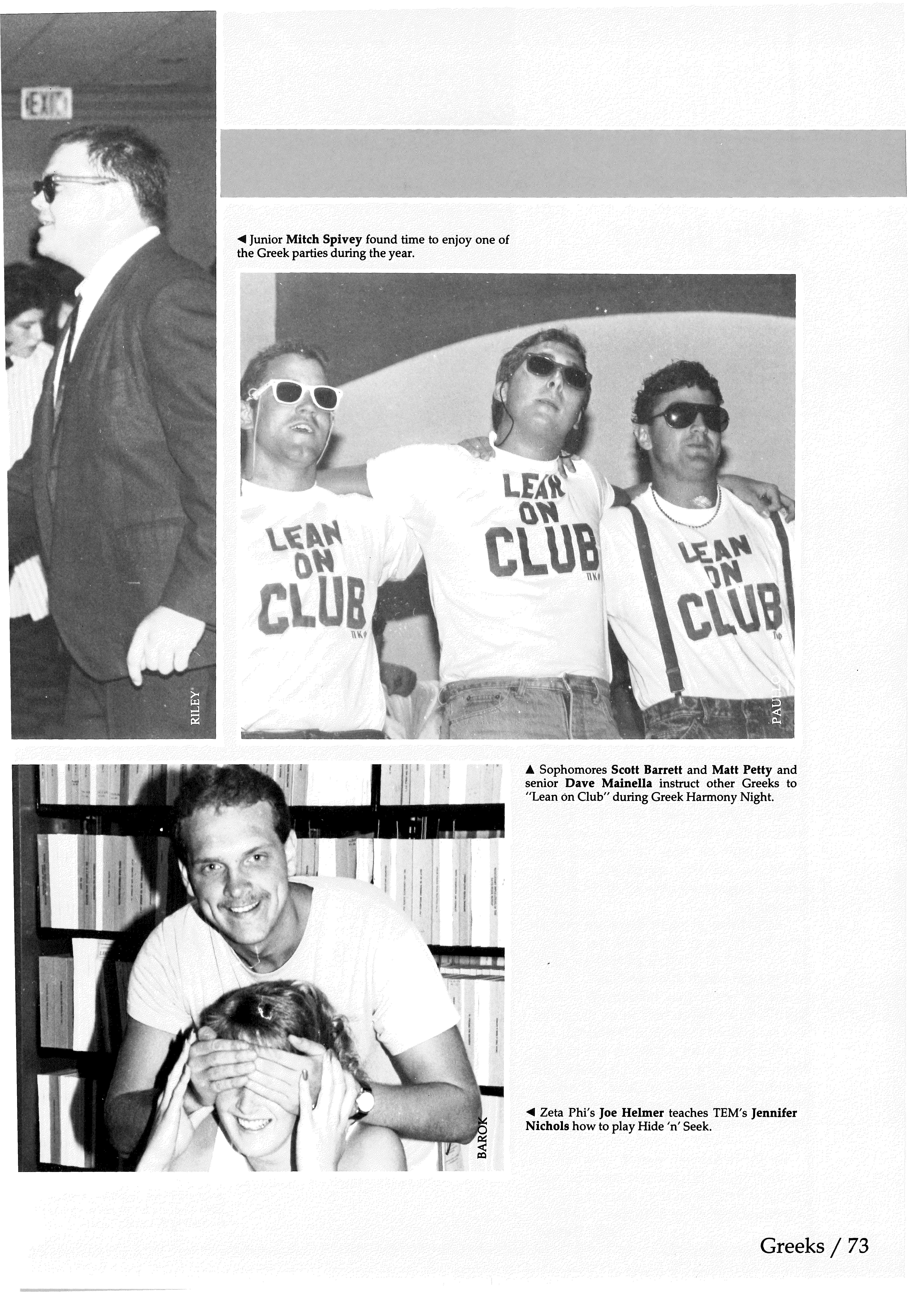 A Sophomores Scott Barrett and Matt Petty and senior Dave Mainella instruct other Greeks to "Lean on Club" during Greek Harmony Night.