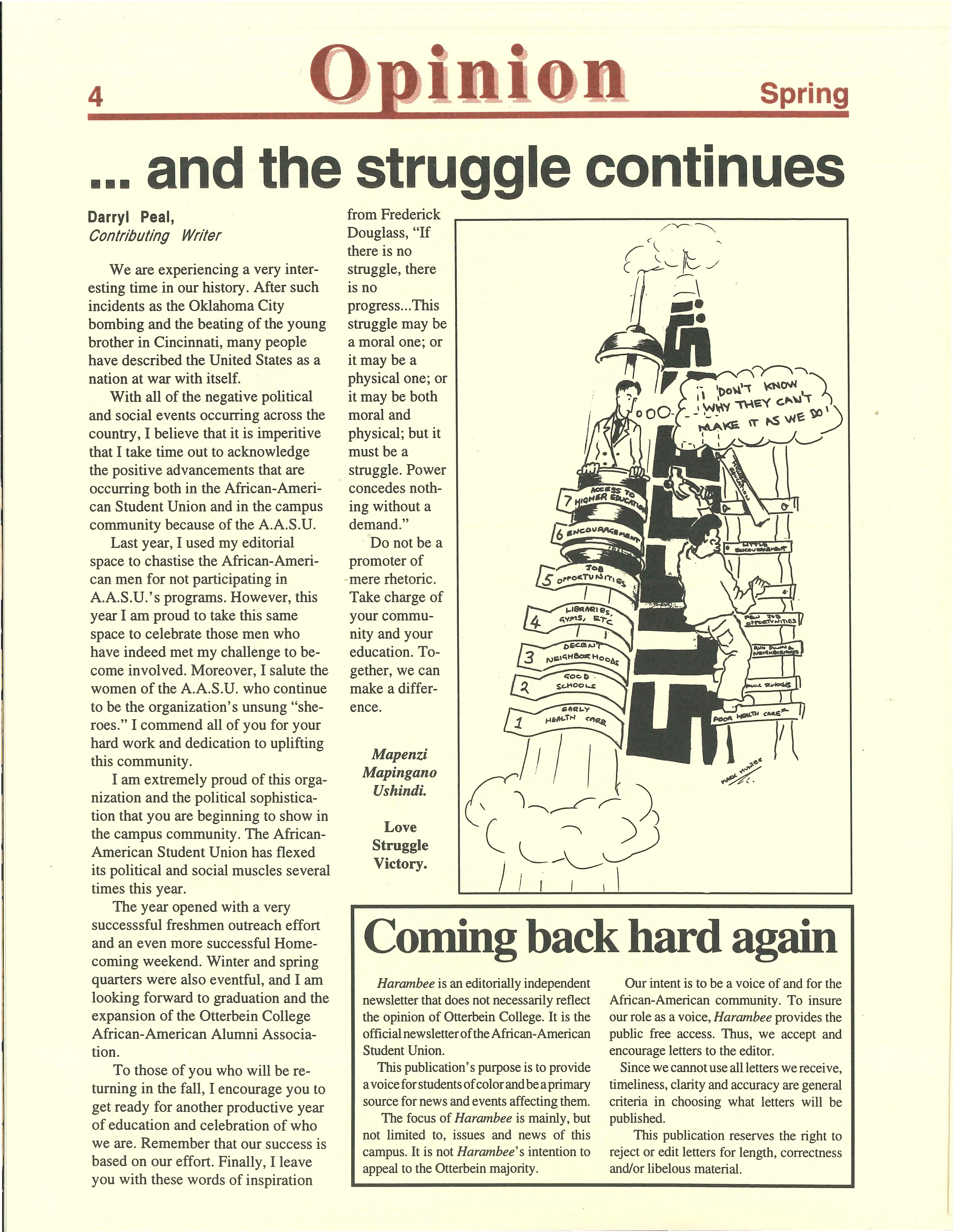 Harambee is an editorially independent newsletter that does not necessarily reflect the opinion of Otterbein College It is the official newsletterof the African-American Student Union.