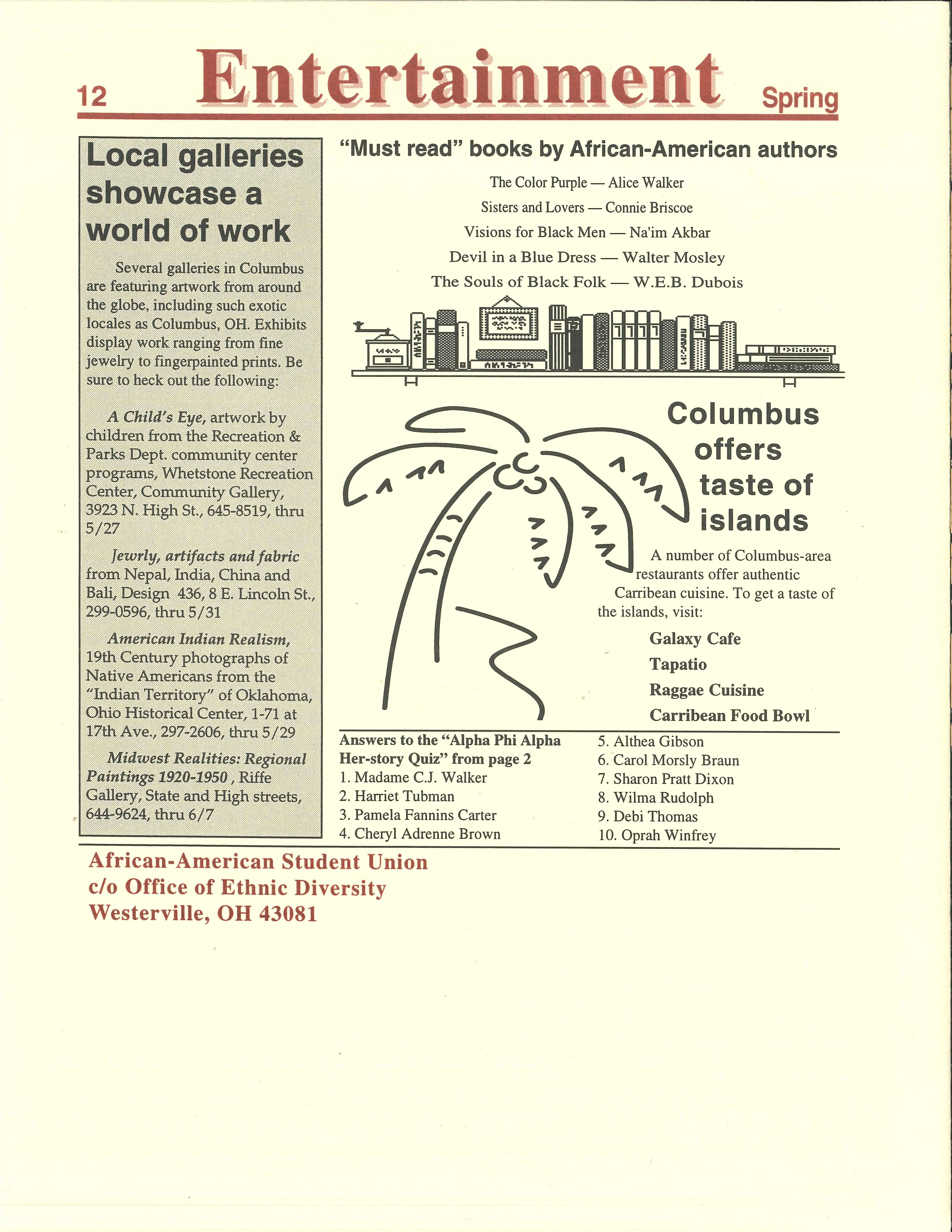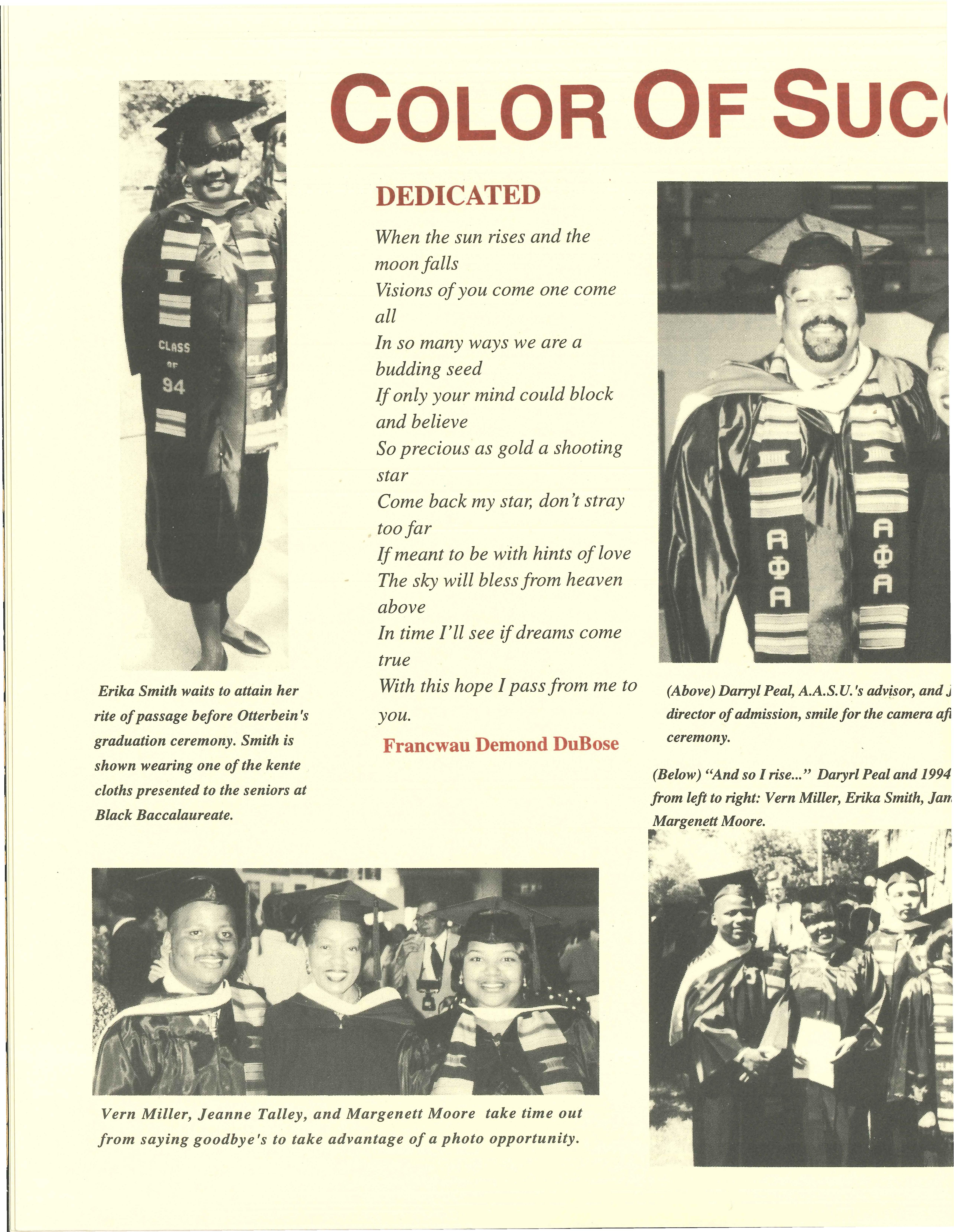The year opened with a very successsful freshmen outreach effort and an even more successful Homecoming weekend. Winter and spring quarters were also eventful, and I am looking forward to graduation and the expansion of the Otterbein College African-American Alumni Association.