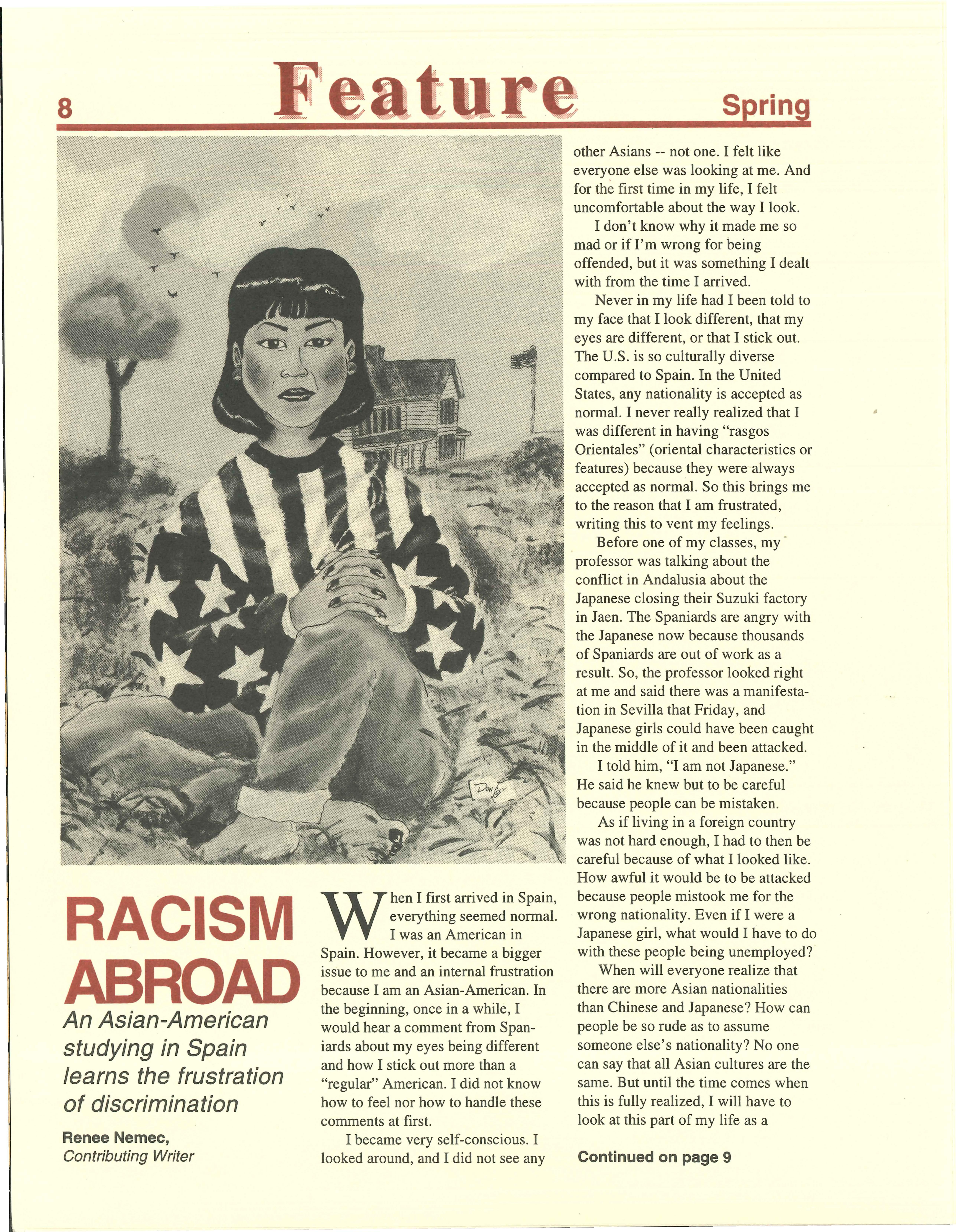 When I first arrived in Spain, everything seemed normal. I was an American in Spain. However, it became a bigger issue to me and an internal frustration because I am an Asian-American. In the beginning, once in a while, I would hear a comment from Spaniards about my eyes being different and how I stick out more than a "regular" American I did not know how to feel nor how to handle these comments at first.