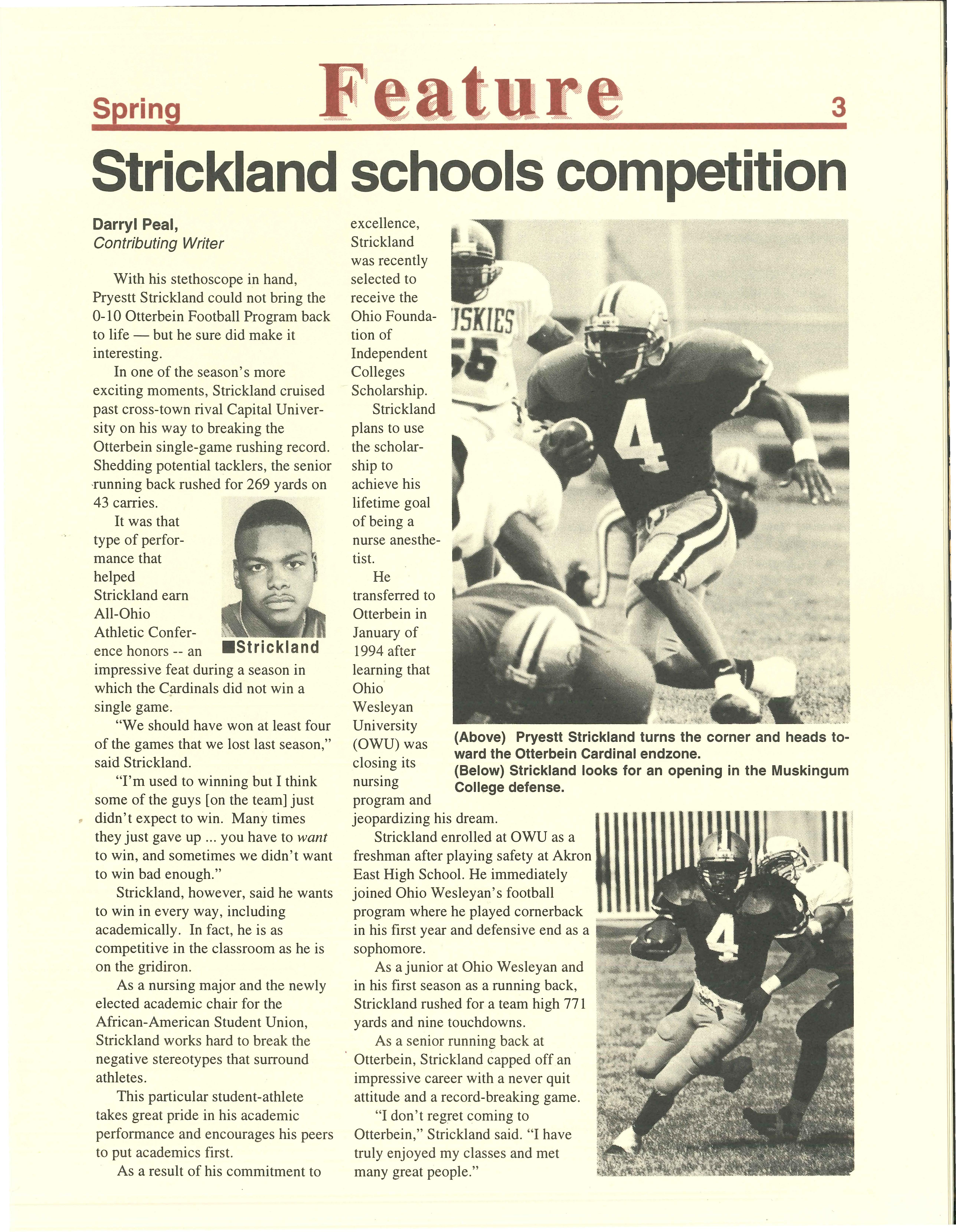 In one of the season's more exciting moments, Strickland cruised past cross-town rival Capital University on his way to breaking the Otterbein single-game rushing record. Shedding potential tacklers, the senior running back rushed for 269 yards on 43 carries.