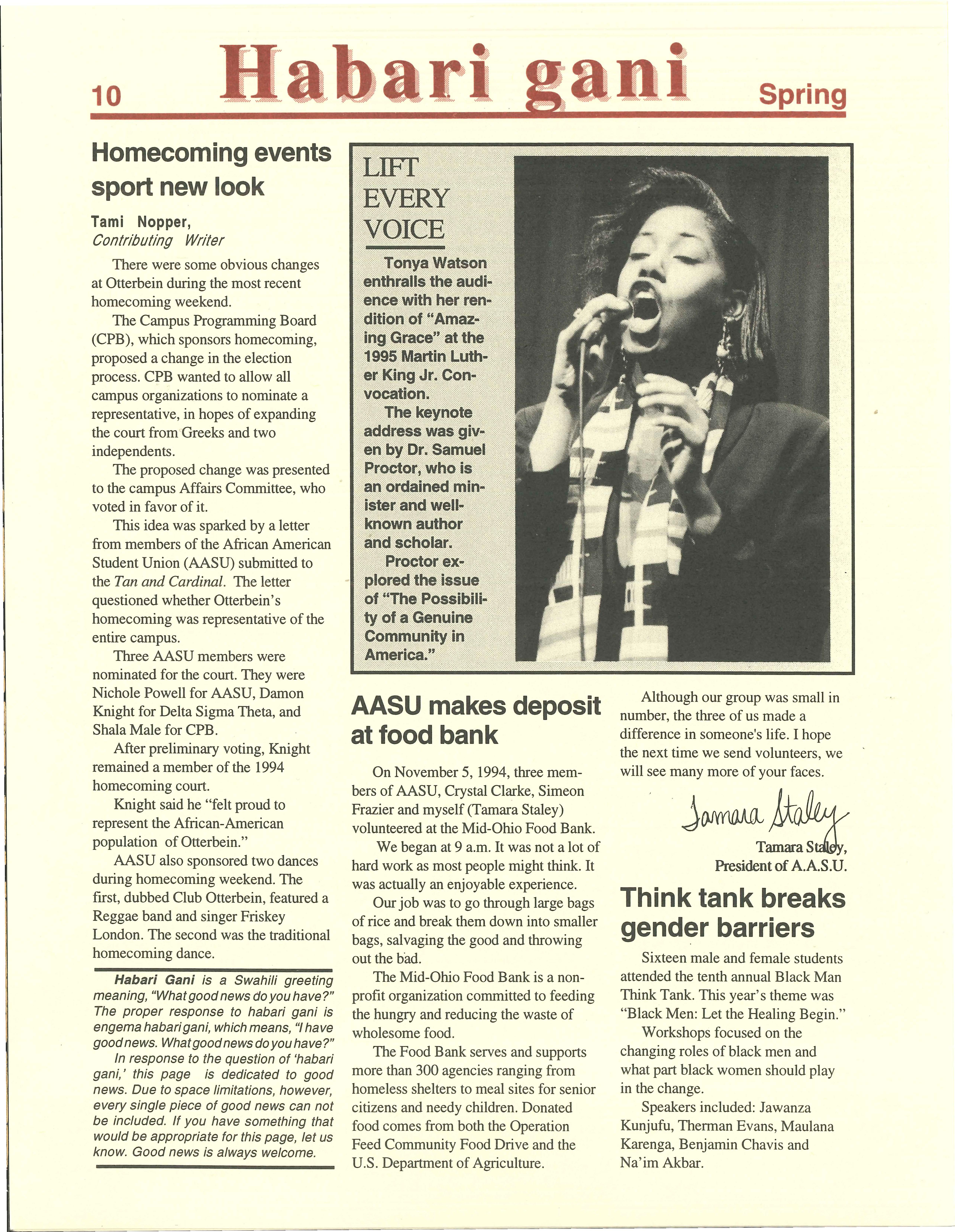 This idea was sparked by a letter from members of the African American Student Union (AASU) submitted to the Tan and Cardinal . The letter questioned whether Otterbein's homecoming was representative of the entire campus.