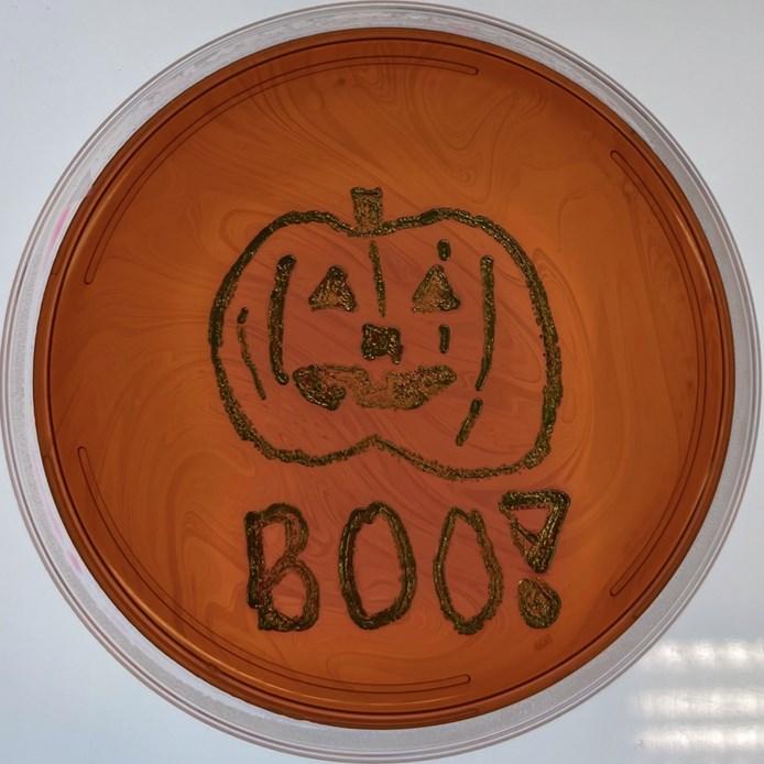 In early October we held our second annual Agar Art Workshop designed as a service learning project for students in my microbiology course, the American Society for Microbiology student chapter, and my research lab to volunteer and offer the information that they have learned about various microbes to participants at Otterbein. Our theme was “Creepy Cultures” keeping with a Halloween theme since we held the event Monday through Friday during the first week of October. Participants could learn about the bacteria that they were using to "paint tiny agar canvases". They worked with safe strains of bacteria, using sterile toothpicks to apply the microbes to different types of agar which contained the nutrients needed by the bacteria for growth. The works of art were then incubated overnight and checked the next day for the images that would be created by the bacteria continually dividing until they were