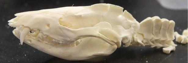 A geriatric Virginia Opossum skull with the beginning of the vertebrae starting to be attached.