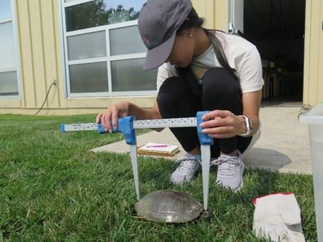 study of Otterbein Lake turtles. She trapped turtles all summer and into the fall to determine the number of species present and their abundance. She also developed a technique for collecting turtle feces. You might ask why Kim was so fascinated with poop? She is currently extracting DNA to help determine what the turtles are eating and if red-eared sliders have a competitive edge in the turtle community. You can also learn her findings at the Senior Research Symposium.
