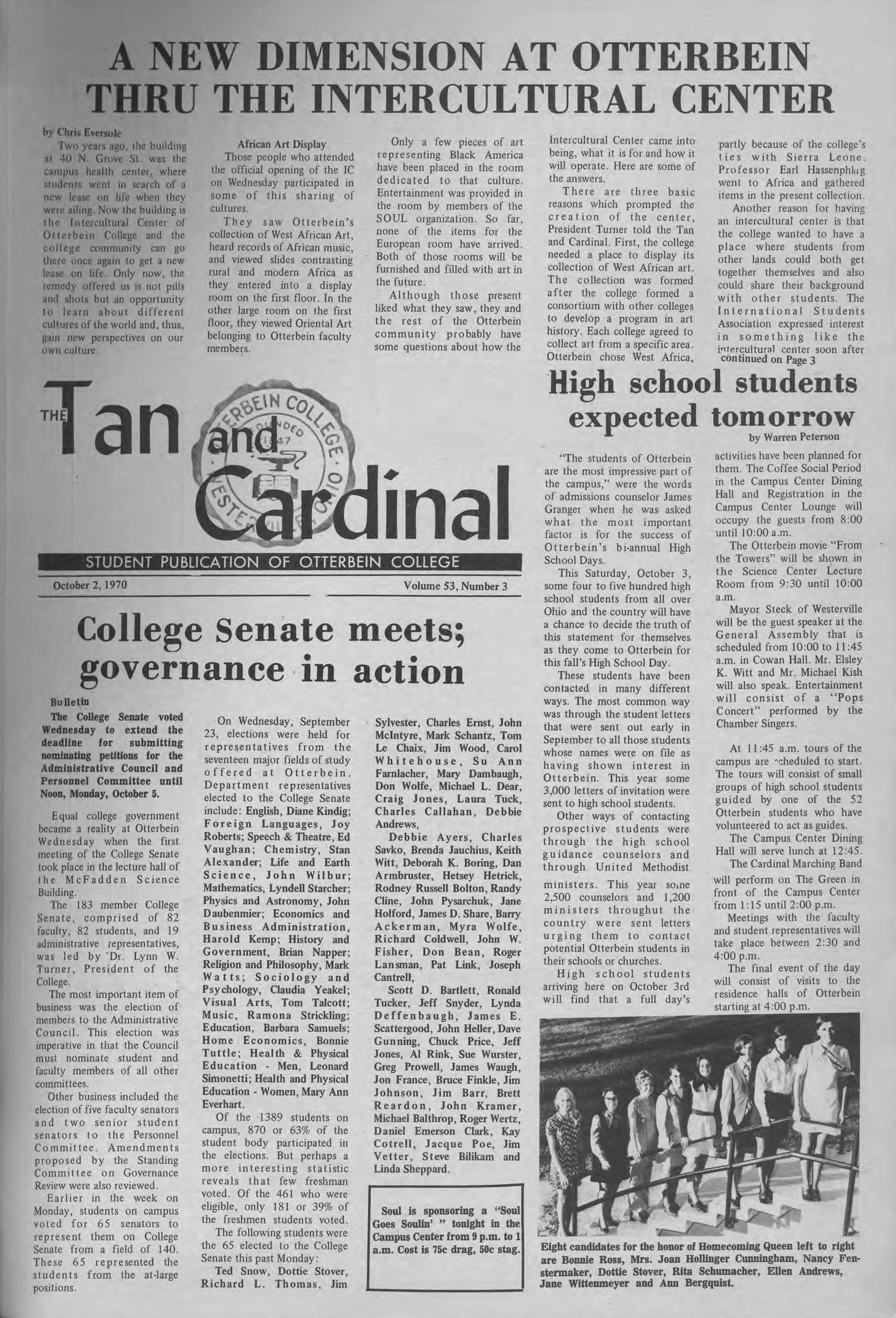 There are three basic items in the present collection reasons which prompted the Another reason for havin gcreation of the center , an intercultural center is that President Turner told the Tan the college wanted to have a and Cardinal. First, the college place where students from needed a place to display its other lands could both getcollection of West African art. together themselves and also The collection was formed could share their background a ft er the college formed a with other students The consortium with other colJeges International Students to develop a program in art Association expressed interest history. Each college agreed to in something like the collect art from a specific area. i11terculturnl center soon after Otterbein chose West Africa, continued on Page 3