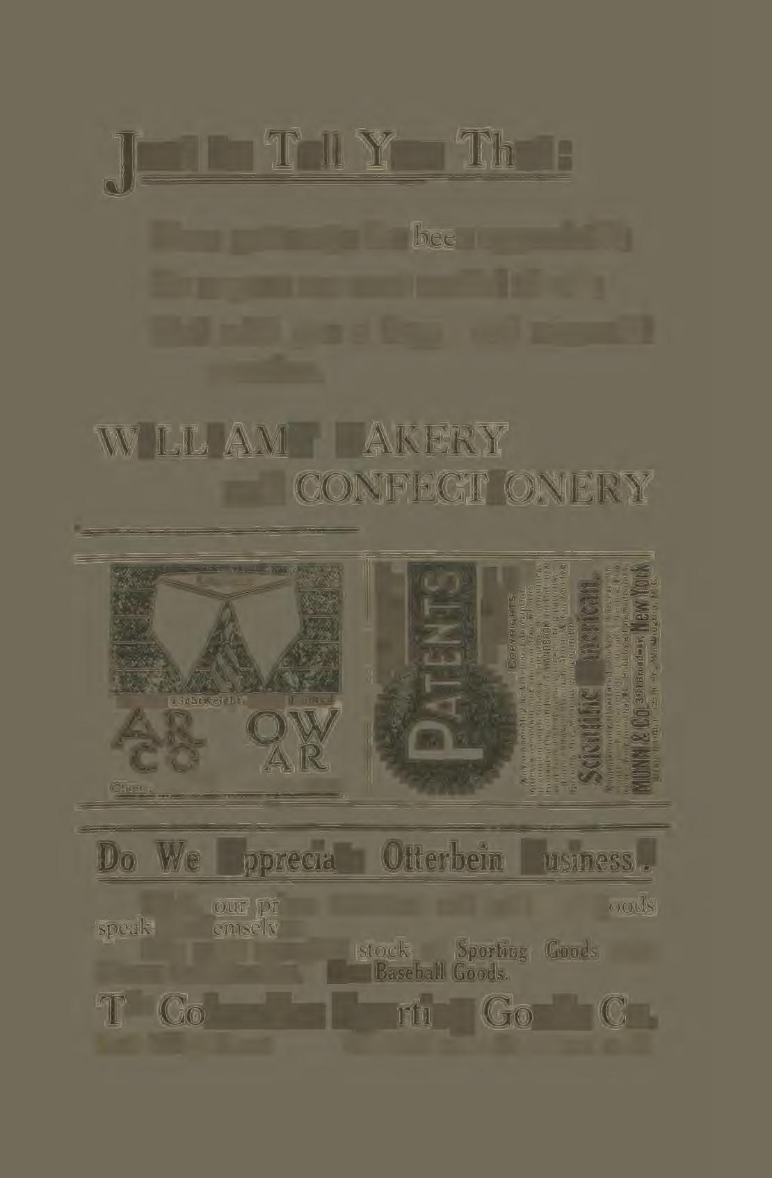 Just to Tell You That: Your patronage has been appreciated; To express our most cordial thanks; And wish you a happy and successful vacation. WILLIAMS' BAKERY and CONFECTIONERY l ARROW COLLAR 2for 25 Cents Cluett,PeBbody & Co. ArrowShirts DoWeAppreciateOtterbeinBusiness ? Well, our prices, treatment and quality of goods speak for themselves. The most complete stock of SportingGoods ever shown in Columbus. NewBaseballGoods. The Columbus Sporting Goods Co. Just off High Street 16 East Chestnut St., Columbus, 0.
