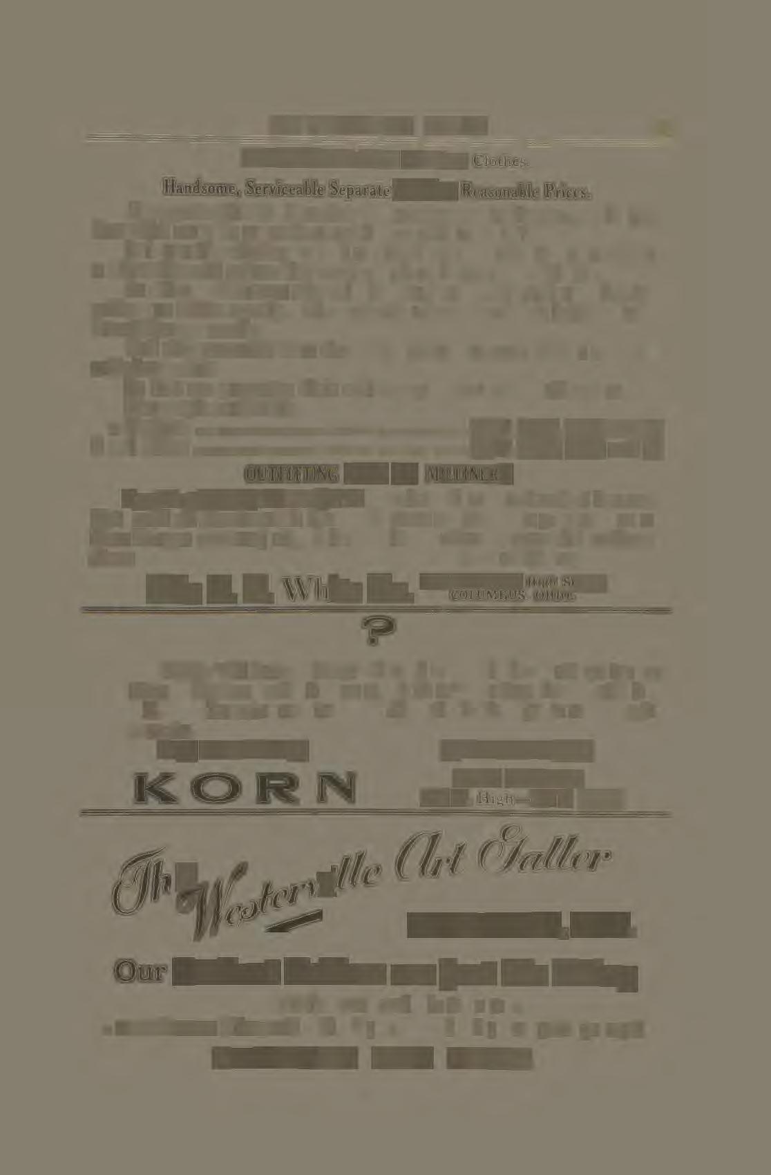 TTERBEIN .iEGIS ( 9 Johnson Furniture Co. VISIT Has a full line of up-to-da tc FURNITURE AND WALL PAPER. always on hand. Irwin's Shoe Store Picture framing done to order at lowest po ible price . ALSO A FULL LINE OF POST CARDS. SHOES AND GENTS' FURNISHINGS South State Street How About That Straw AN EXCLUSIVE LINE $2.00 TO 5.00 PANAMAS and BANGKOKS 6.00 TO $10.00 SHIRTS FOR SUMMER $ .•50 AND UP. C. lVI. Sherman The Vogue Shop F. G. Vance Chittenden Hotel Bldg. Columbus, 0. ESTABLISHED 1834. The United Brethren Publishing House Specialists in Graphic Arts. COMMERCIAL PHOTOGRAPHY, ENGRAVING, ELECTROTYPING, DESIGNING, BINDING, PRINTING, LITHOGRAPHING, BOOK, STATIONERY and PHOTOGRAPHIC SUPPLIES. "TIIE OTT.ERBEI1T PRE " W. R. FUNK, Agent The Columbus Railway & Light Co. \Ve terville Daily Time Card. LV. SPRJ. •G & HIGH, COL. LEAVE WE TERYILI,E A.)[. P. )1 4.30 .A. ~I. P. :\L 5.30 5.30 12.30 5.30 5 0 12.30 6.30 6.30 1.30 6.30 6.30 1.30 7.30 7.30 2.30 7.30 7.30 2.30 , .30 .30 3.30 .30 ,30 3.30 9.~o 9.30 9.30 9.30 4.30 10.30 10.30 10.30 10.30 11.30 11.30 11.30 11.30 FARE-Round trip, between Columbu~ and \Y :--tL'rville, 25c. Baggage 'ar I a\·es Town and High ,·tr •Pl:, 9:25 u. m. and 4:05 p. m daily ex(.;ept 'unday.