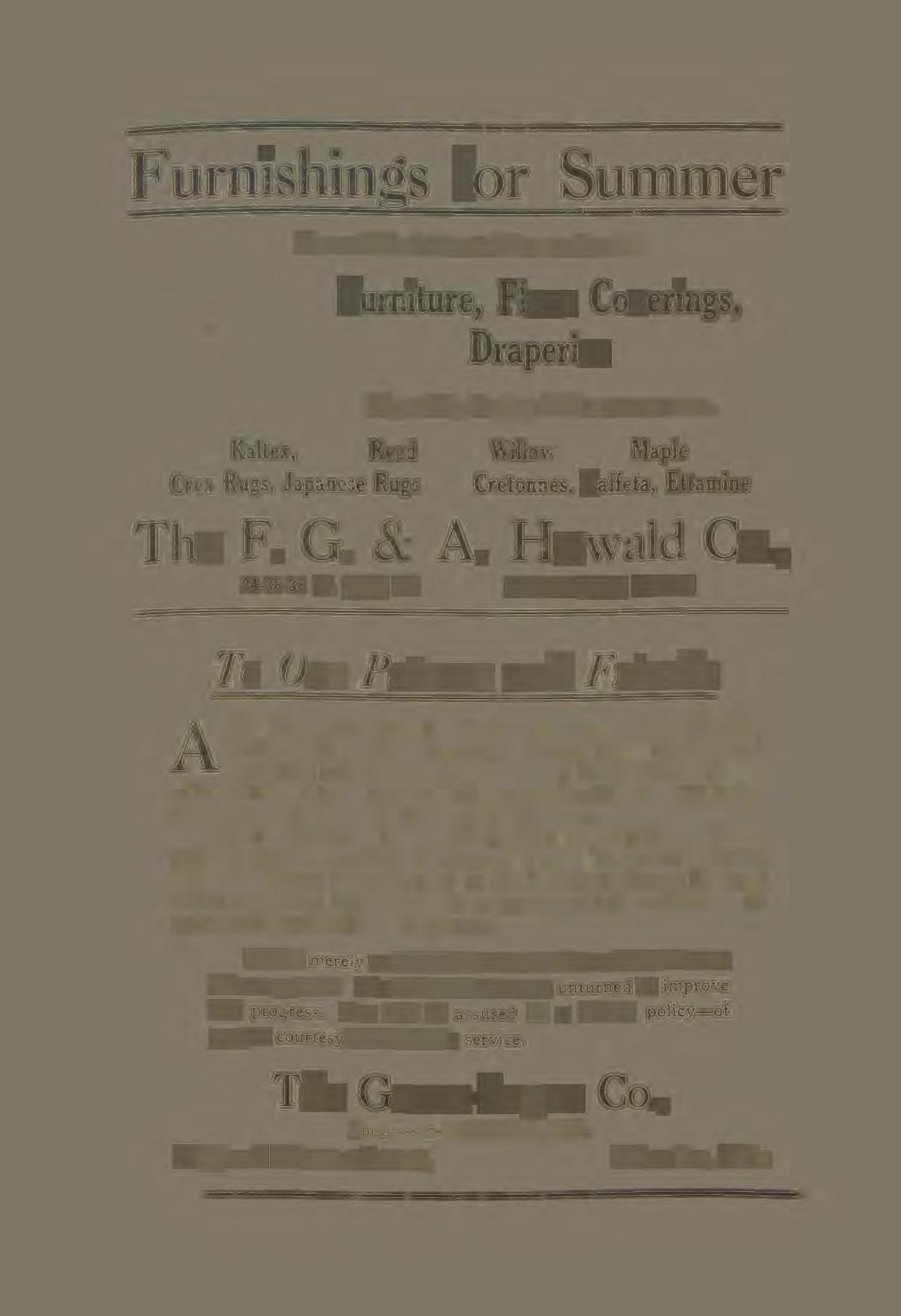 You will be interested in our line of Furniture,FloorCoverings, Draperies Especially des igned for summer use. Kaltex,ReedWillowMaple CrexRugs,JapaneseRugsCretonnes,Taffeta,Ettamine The F. G. & A. HowaldCo., M-38-38N.HighSt.COLUMBUS,OHIO.