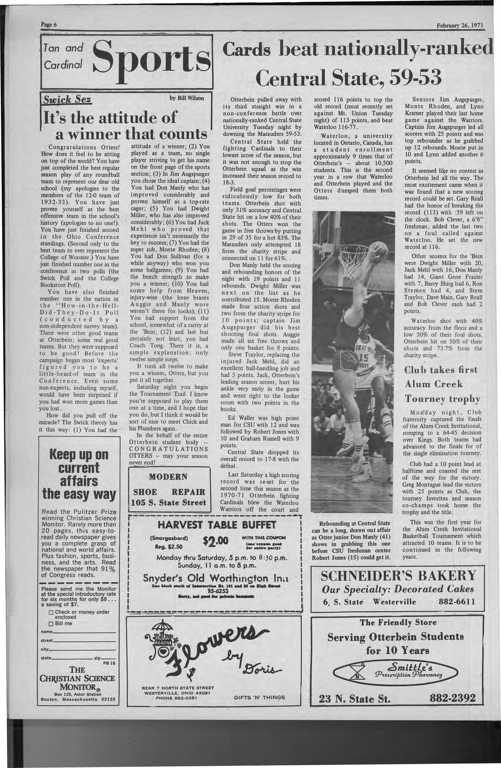 Invitational as Otter junior Don Manly (41) Basketball Tournament which shows in grabbing this one attracted 10 teams It is to be before CSU freshman center continued in the following Robert Jones (1S) could get it. years. SCHNEIDER'S BAKERY Our Specialty: Decorated Cake~ 6. S. State Westerville 882-661 l The Friendly Store Serving Otterbein Students for 10 Years 23 N. State St. 882-2392 \.