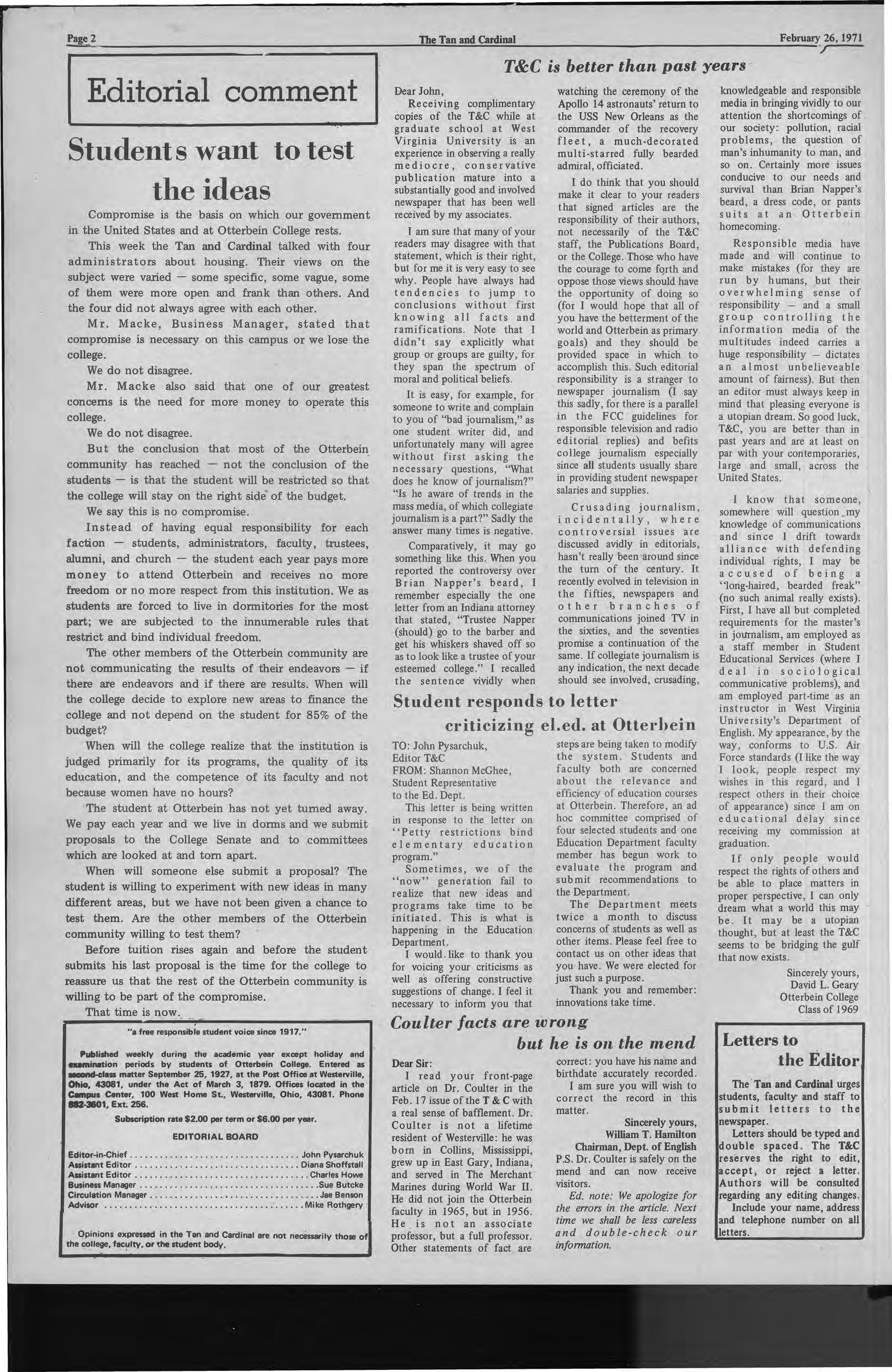 I do think that you should make it clear to your readers that signed articles are the responsibility of their authors, not necessarily of the T&C staff, the Publications Board, or the College.Those who have the courage to come fqrth and oppose those views should have the opportunity of doing so (for I would hope that all of you have the betterment of the world and Otterbein as primary goals) and they should be provided space in which to accomplish this Such editorial responsibility is a stranger to ·newspaper journalism (I say this sadly, for there is a parallel in the FCC guidelines for responsible television and radio editorial replies) and befits college journalism especially since all students usually share in providing student newspaper salaries and supplies