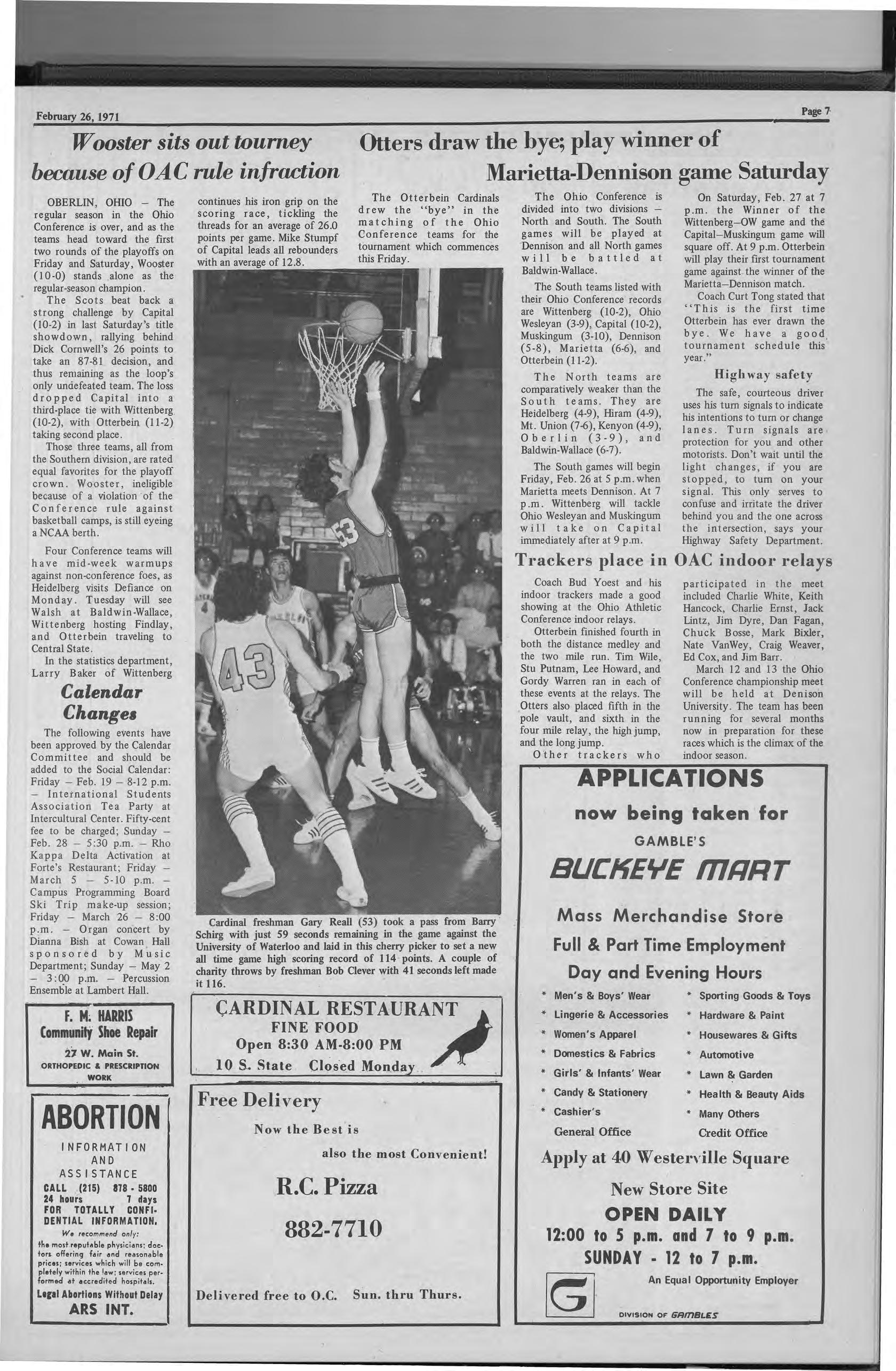 with just 59 seconds remaining in the game against the University of Waterloo and laid in this cherry picker to set a new all time game high scoring record of 114 points. A couple of charity throws by freshman Bob Clever with 41 seconds left made it 116. CARDINA-L RESTAURANT FINE FOOD ;tiOpen 8:30 AM-8:00 PM 10 S. State Clos·e d Mon.day · · Free Delivery Now the Best is also the most Convenient! R.C. Pizza 882-7710 Delivered free to O.C. Sun. thru Thurs.