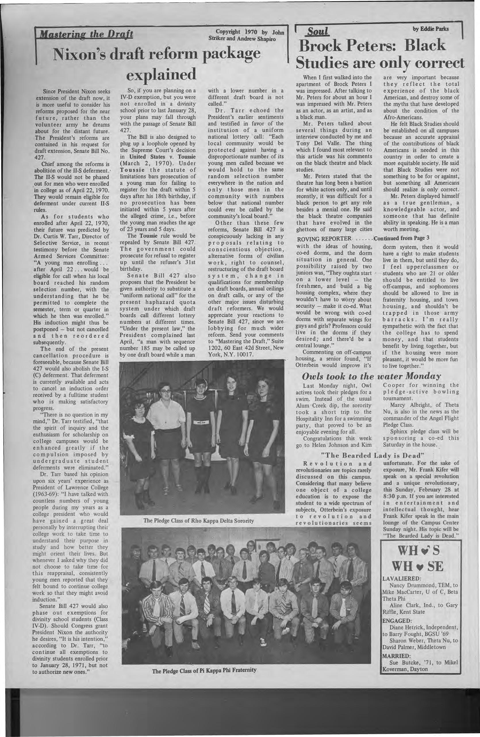 Diane Hetrick, Independent, to Barry Fought, BGSU '69 Sharon Weber, Theta Nu, to David Palmer, Middletown