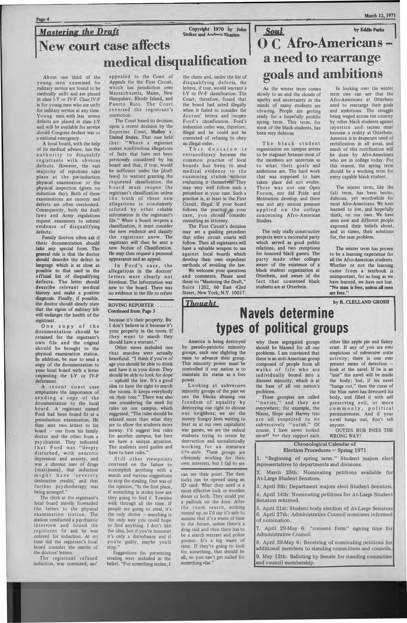 H an inaf ' , TU D Er,; 1 F , ' fl ' I ( A TI O N O F O TTE Rf\ EI N CC LL EC, E ,"a free responsible student voice since 1917." Published weekly duriny the academic year except holiday and examination periods by students of Otterbein College. Entered as second-class matter September 25, 1927, at the Post Office at Westerville, Ohio, 43081, under the Act of March 3, 1879. Offices located in the Campus Center, 10(. '-<t Home 'St., Westerville, Ohio, 43081. Phone 882-3601, Ext. 256. Subscriptio' rate $2.00 per term or $6.00 per year. EDITORIAL BOARD Editor-in-Chief John Pysarchuk Assistant Editor Diana Shoffstall Assistant Editor Charles Howe Business Manager .............................•...... Sue Butcke , Circulation Manager Jae Benson ' Advisor ,, Mike Rothgery , Writers and Staff Members Darlene Dinwiddie Maria Marchi Robert C Grosh ,Charlie Ernst Warren Peterson Carol Whitehouse ;t< athy Fox Kathy Pratt Tony Del' Valle .Becky Hattie Tom Schock Mark Savage Benita Heath Linda Vasitas, Keith Smith Shelley Jacob~ Ed Park;; Bill Wilson Mark Watts Dan Budd Steve Bender Tom Tilton Bonnie LeMay Duffy Oelberg Chris Eversole Gar Vance Pat Cole Debbie Miller, ,lnfin Mulkie Jim Viney Opinions expressed in the-Tan and Cardinal are not necessarily tnose or !h,e.zollege, facultv. Qf_ ~student body;