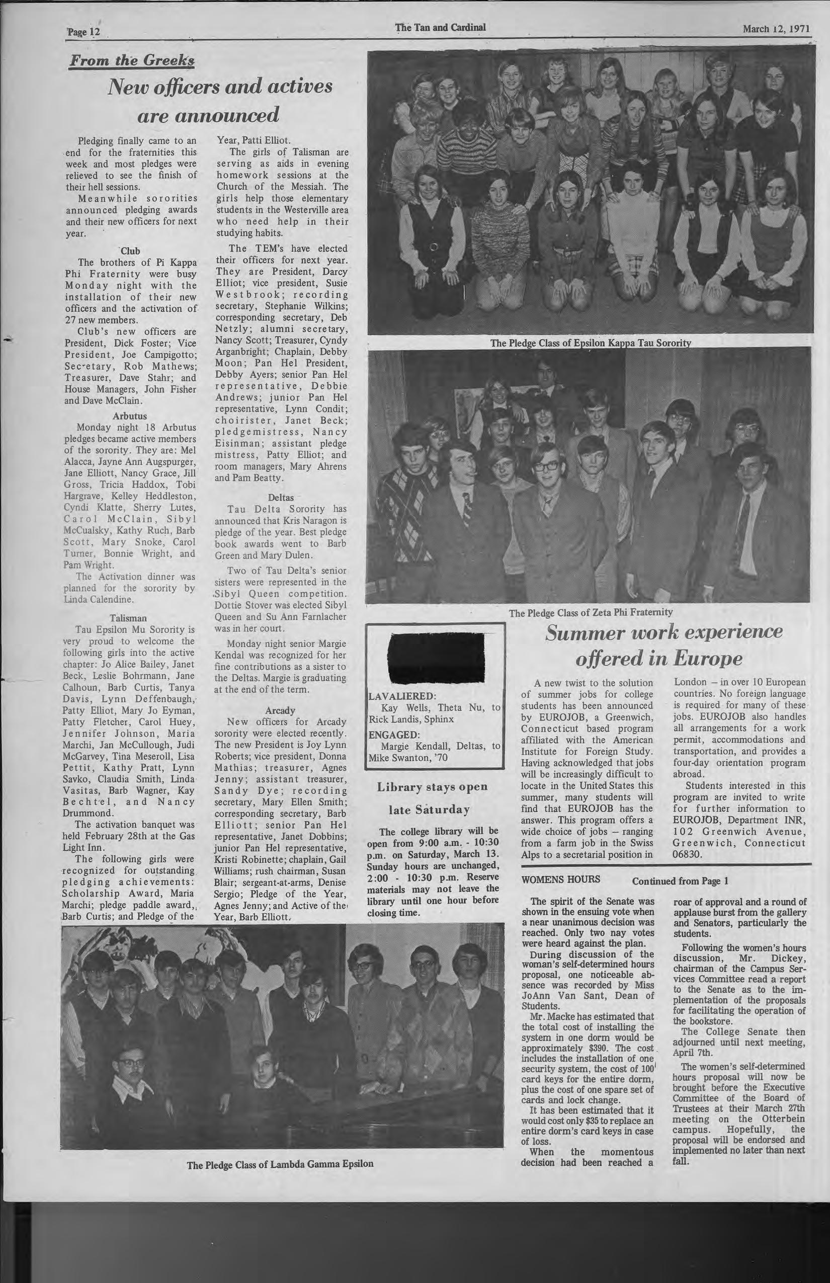 For the second consecutive system proposal was first hundred visitors were present parable in size to Otterbein made to the woman's dorm card year, a proposal to change the created by an ad hoc committee to view the actions of the Senate which reportedly favored the key system proposal during the present college policy con headed by Su Ann Farnlacher. on this very important matter. self-determined hours policy. ensuing debate and discussion. cerning women's hours was Other committee members The meeting began with the The present women's hours Section B, part 2, which passed by the college com included Bob Baldridge, Wanda Senate considering three proposal is based on a plan used concerns itself with time in munity late Wednesday af Boykin, Kay Cottrell, and Dick r ecommendations of the at Redlands College i n which a resident is to notify her t ernoon as the College Senate Coldwell The ad hoc committee Campus Regulations Com Californ i a It was at t he head resident of the dorm of her passed th e women's dorm card h as b een wo r king on the mittee. To facilita t e matters , suggestion of Dean Van Sant , inability t o return a key , was k e y sy s t e rri b y a n ea r proposal for th e p ast eight Miss JoAn n Tyl er of the th e Dean of St udents, that the changed from th e proposed 8-10 un animous de cision~ weeks women ' s physical ed u cat i on Campus Reg ul a ti ons Com a.m to 9-11 a m. It was felt tha t departmen t yi elded the fl oor to .mit tee d ec id e d u po n th e since the desk per sonnel ar e not senior Chris E versole, ch a ir Redlands pl a n whi ch, it was on duty t o r ec eiv e an y incom ing m an of th e Campus Re gulations felt, c ould be ea sily a da pt ed t o dor m ph one calls befor e 9 a .m., Committe e. This move was Otterb ein Colleg e it wa s s enseless to stipulate that a ccepte d by the Senate in order The pr esent proposal is based a re sident must notify her head that discussion could flow more on the original Re dlands ver r es ident of the desk personnel freely. sion. It has been revised and beginning at 8 a.m In so doing, Sharing the podium with edited with much h elp by Bill the time by which a card key President Lynn Turner, Mr utterback of the Public must re returned was changed Eversole was then able to direct Relations department to to 11 a.m. th e discussion and answer any eliminate unclear and am Section B , part 5 was questions of the Senate bigious phrasing and to correct amended so that the last senSt udent h a ndboo k chang es we akn es ses contained in the tence read, "She will be m a de ne ces s ar y by th e soror ity or.i gin a l pl an allowed until 3 p.m. to find her housing pr oposal adopted la st Thre e ammendm ent s were card key." week an d th e fr a t erni t y h ousin g