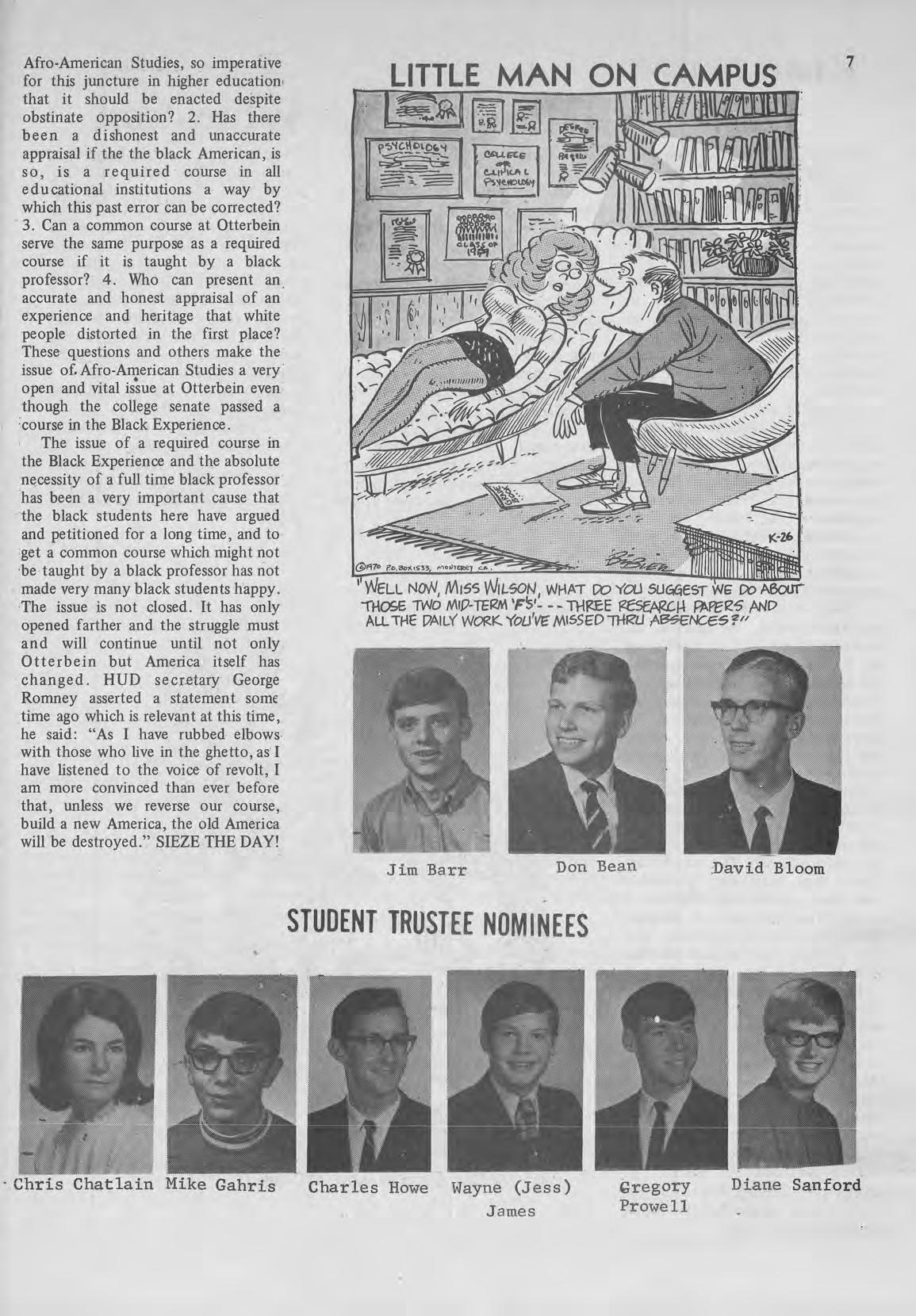 The issue of a required course in the Black Experience and the absolute necessity of a full time black professor has been a very important cause that the black students here have argued and petitioned for a long time, and to • get a common course which might not ·be taught by a black professor has riot made very many black students happy. ·The issue is not closed. It has only opened farther and the struggle must and will continue until not only Otterbein but America itself has changed. HUD secr.etary George Romney asserted a statement some time ago which is relevant at this time, he said: "As I have rubbed elbows with those who live in the ghetto, as ' I have listened to the voice of revolt, I am more convinced than ever before that, unless we reverse our course, build a new America, the old America will be destroyed." SIEZE THE DAY!