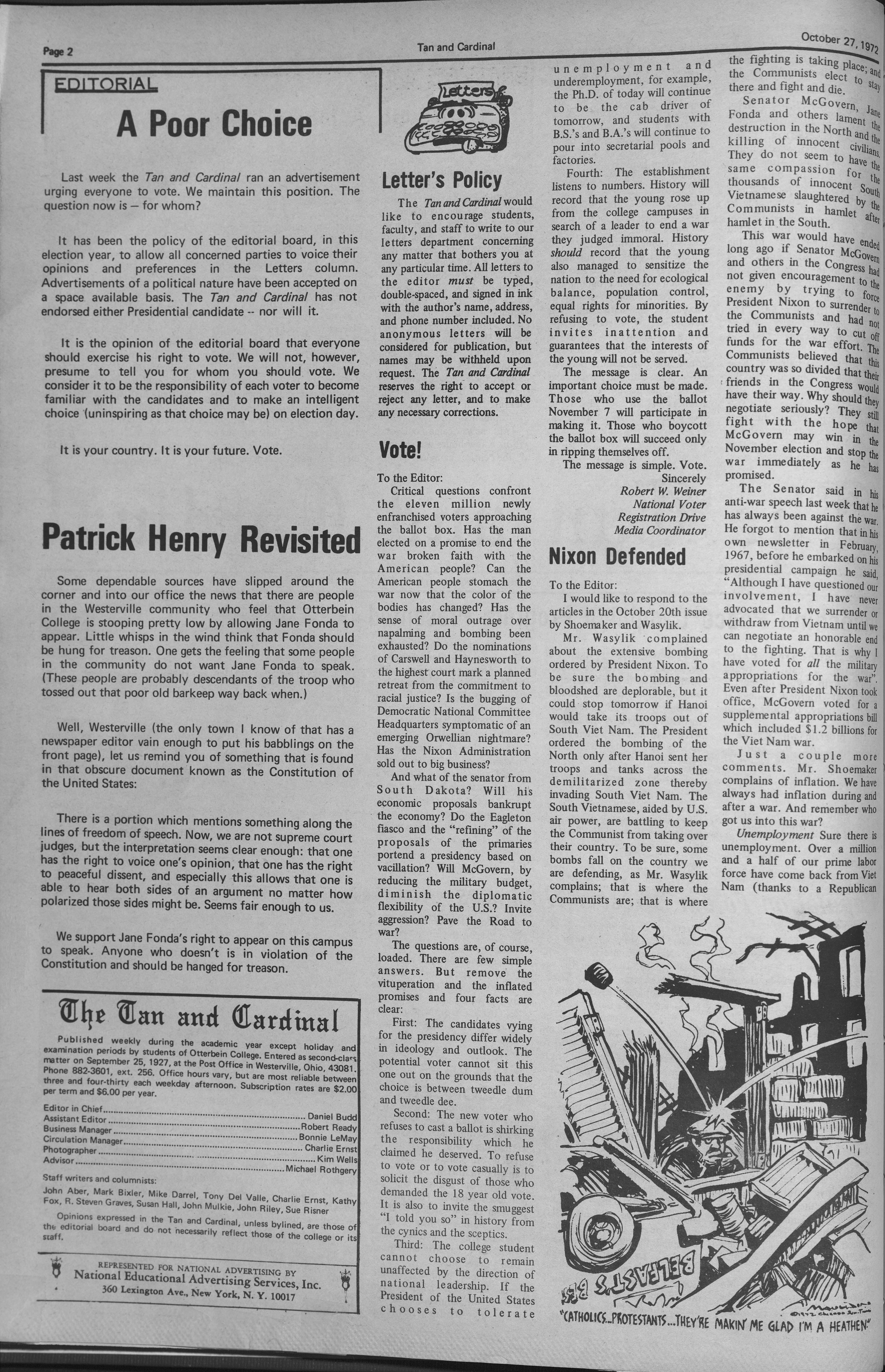 each weekday aft S e een per term and $6 00 ernoon. ubscription rates are $2 00 per year. · Editor in Chief Assistant Editor ·······Daniel Budd Business Manager........... · ················································Robert Ready Circulation Manager ······ Bonnie LeMay Photographer ····· ········ · ·· •··· Chari ie Ernst Advisor .·························:::::::::::::::::::::.::::::::::::::::::::::::::::::::::·M· i~h~~·I ~:::~ Staff writers and columnists: John Aber, Mark Bixler, Mike Darrel Ton D Fox, R. Steven Graves, Susan Hall Joh' M 1Yk. eJI Valle'. Charlie Ernst, Kathy • n u ie, ohn Riley, Sue Risner Opinions expressed in the Tan and Ca d. th1: editorial board and do not n .1 r inal, unless bylined, are those of staff. ecessari Y reflect those of the college or its 'er .REPRESENTED FOR NATIONAL ADVERTISING B Nauonal Educational Advertising Service: I 360 Le ' nc. xangton Ave., New York, N. Y. 10017 TanandCardinal