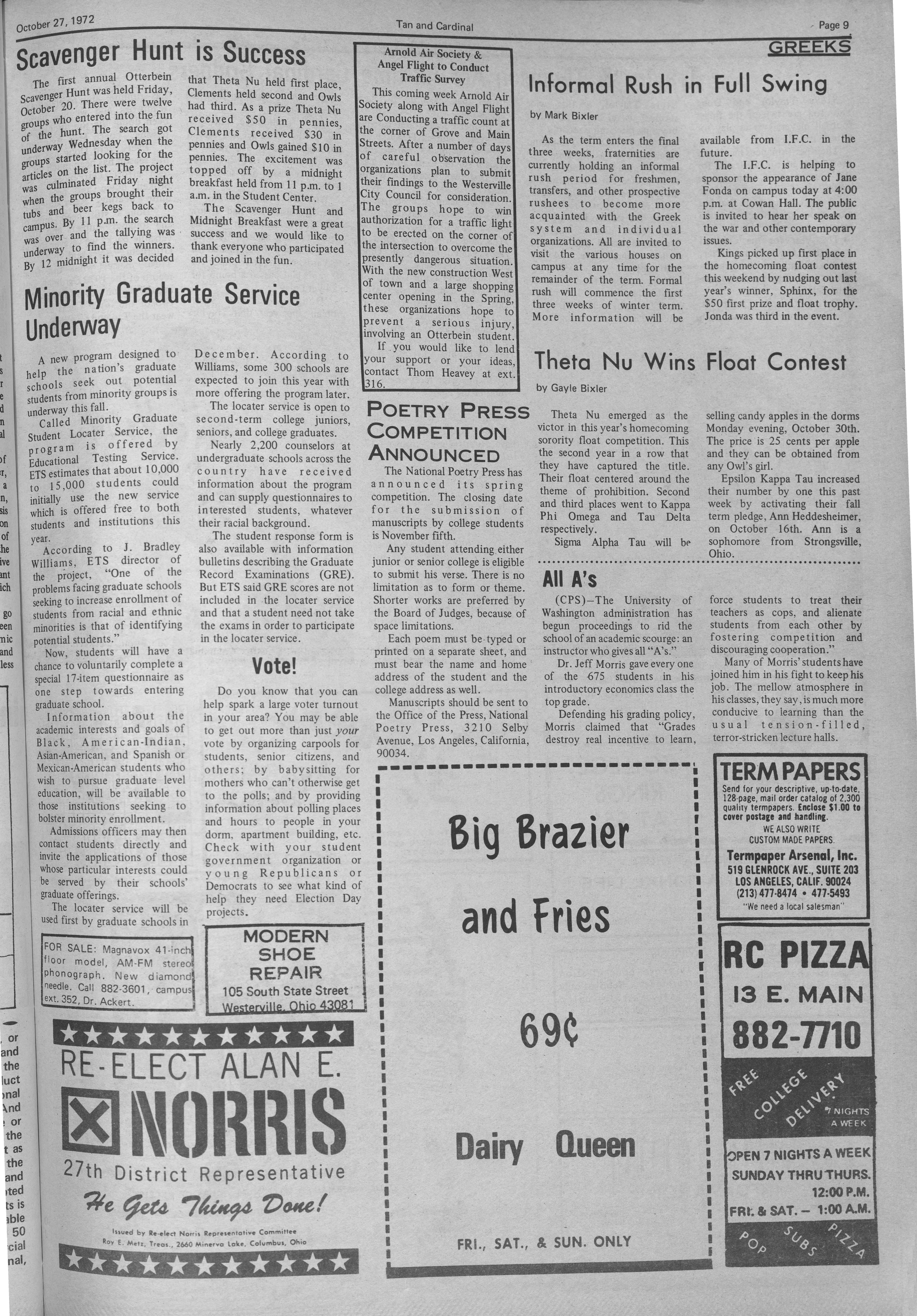 Is it a yellow tornado? Is against two of the toughest night not for the students or It is eight a.m. The water pipe But you hear nothing. What is Westerville on fire? Have the teams in the Ohio Conference: C9ach Agler, but for themselves. gurgles sleepily. The bathroom 1t? What's happened? Is there m Martians landed?!? Denison and Ohio Wesleyan. They have to prove to door slams open and shut. You truth no pitter-patter on the Gasp! Gasp again while ,, However, the Allegheny game themselves that they still have crawl out of bed, get dressed, roof mingling with the vacuum you're thinking of something to will definitely be the biggest pride and can go get the job and open your eyes. It is cleaner and the alarm clock is think. i, game of the year. It has been done. If they accomplish this, morning. chorus? Upon refle~tion it has a said by many students that then they will not only gain Morning at the 'Bein. You peek out the door. Yes, certain familiarity to it. "Pardon II Coach Moe Agler doesn't care respect for their coach, but for Another day, another yawn. there they are, the familiar me," you ask a passerby, "is that that much about winning since each and every one of their And what will the weather be knee-deep puddles, the greedy, by chance the moon up there?" ll he has so many other interests teammates as well. like today, fans?!? · slurping mud, and the grass "Sorry. I don't know," he ve 9 Yesterday it rained. The day 1d which usually resembles replies. "I'm from out of town. before that it poured. The day over-cooked spinach. But there's I'm only a student here."