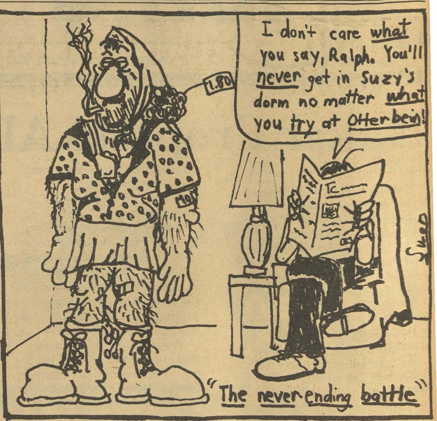 Conti·ibutors: Susan Berg, Jeff Boehm, Dave Callahan, Christine Cover, Denise Dankhoff, Chris Ellertson, Rob Engelbach, Eric Hall, John Hulkenberg, Lynn Kirch, Dan McCoy, Janette McDonald, Tim McMasters, Chris Mills, Cindy Prochaska, Desiree Shannon, Steve Spangler, Darlene Steven, Fred Swan, Natalie Wymer, Dave Yaussy. Opinions expressed herein are those of the staff and do not necessarily reflect the views of the school or of its administration. Published every Friday during the school year, holidays excepted. Offices in the basement of the Campus Center. Mailing address: The Tan and Cardinal. Otterbein College, Westerville, Ohio Kim Fippin