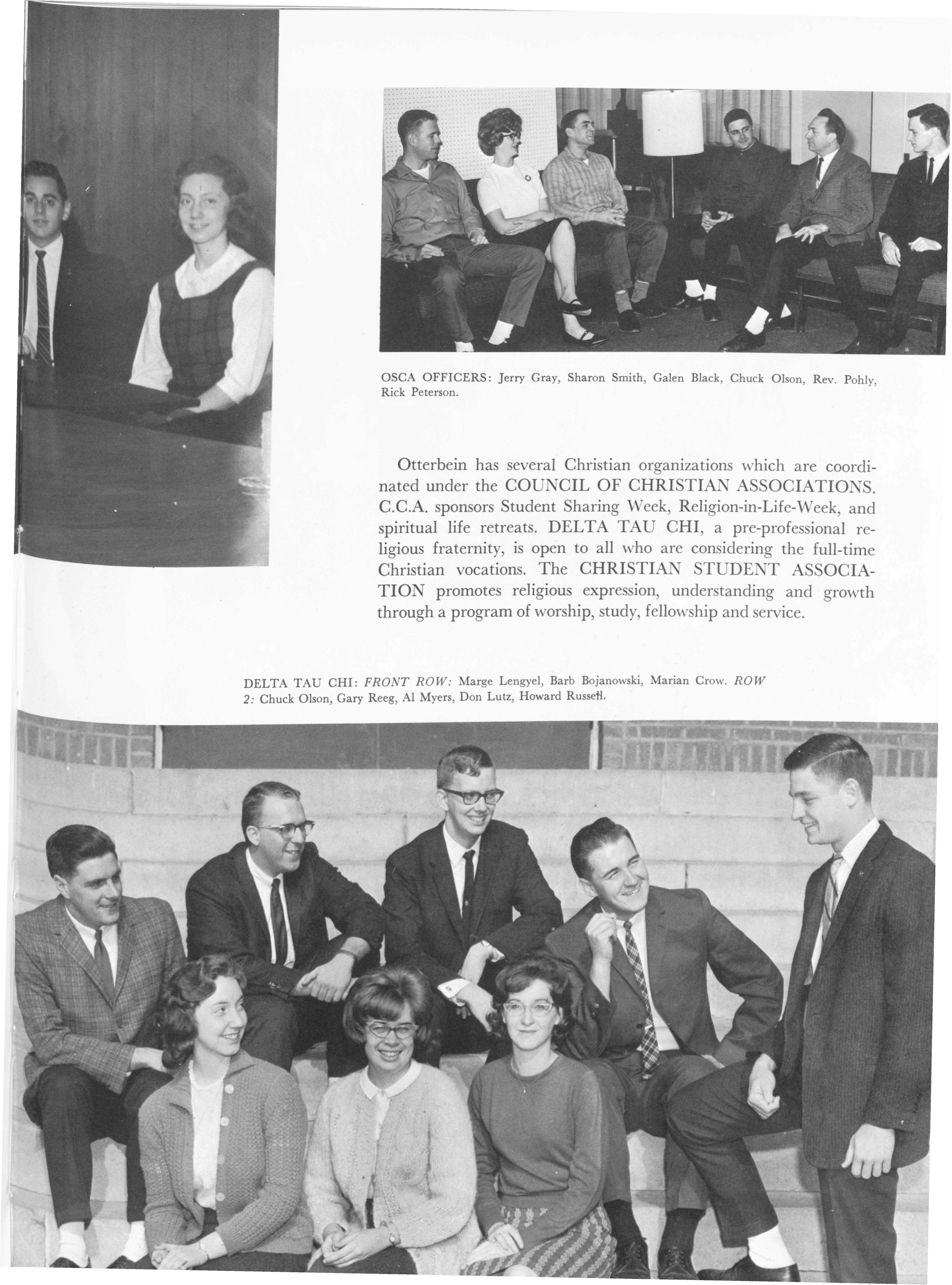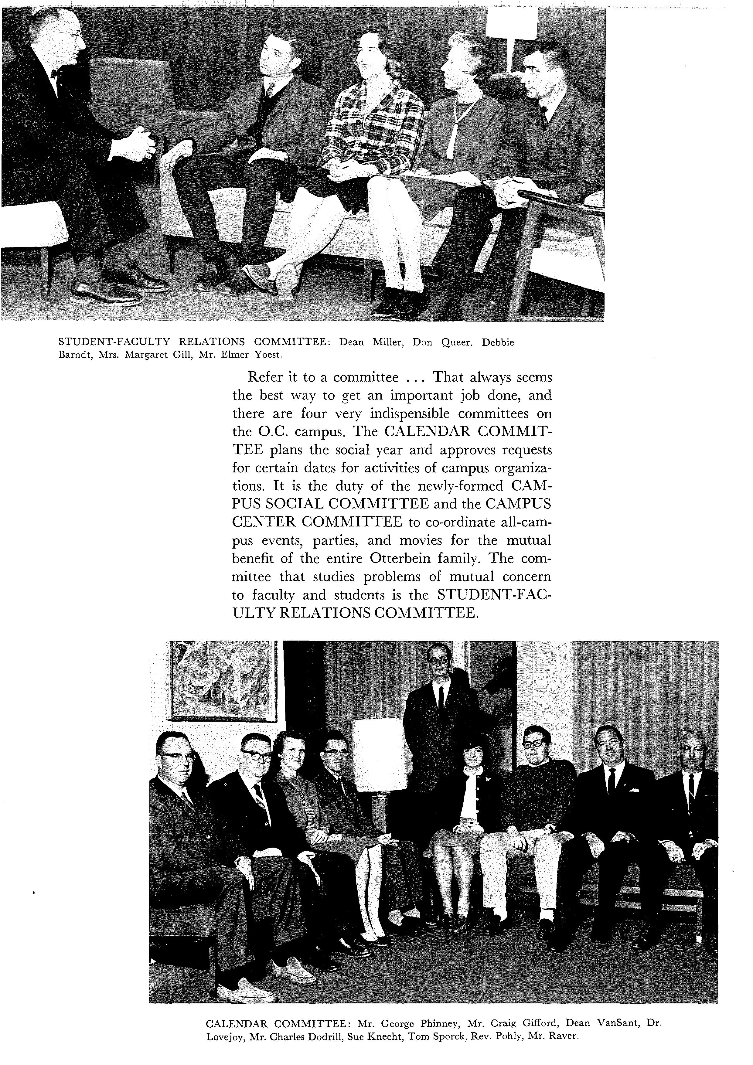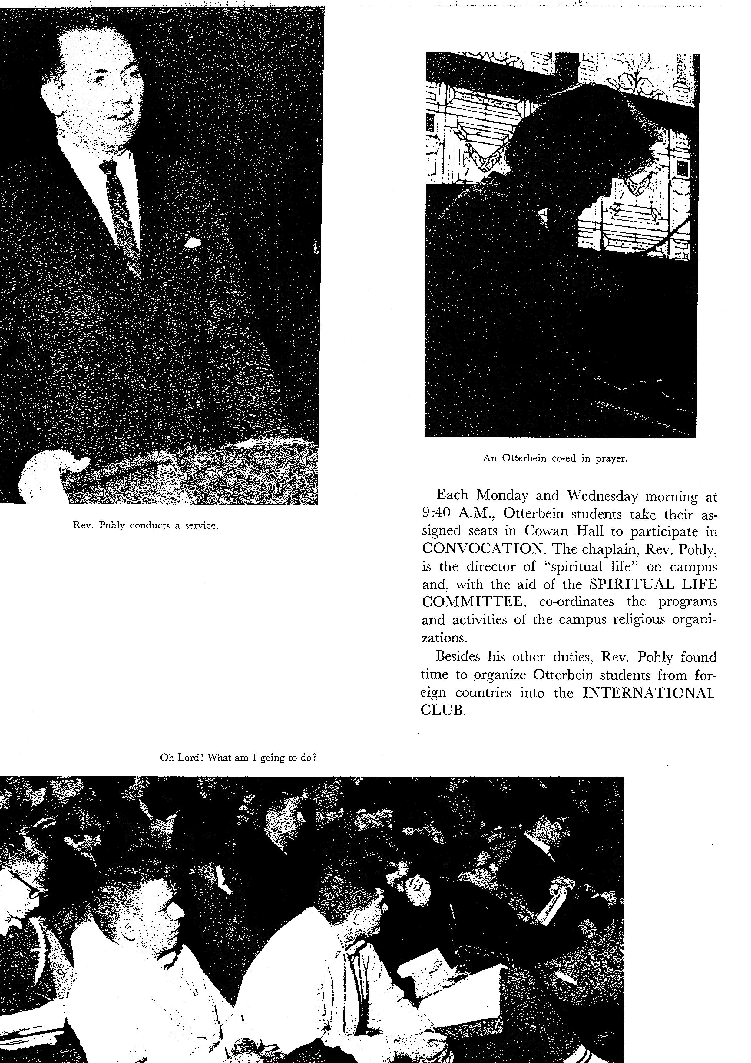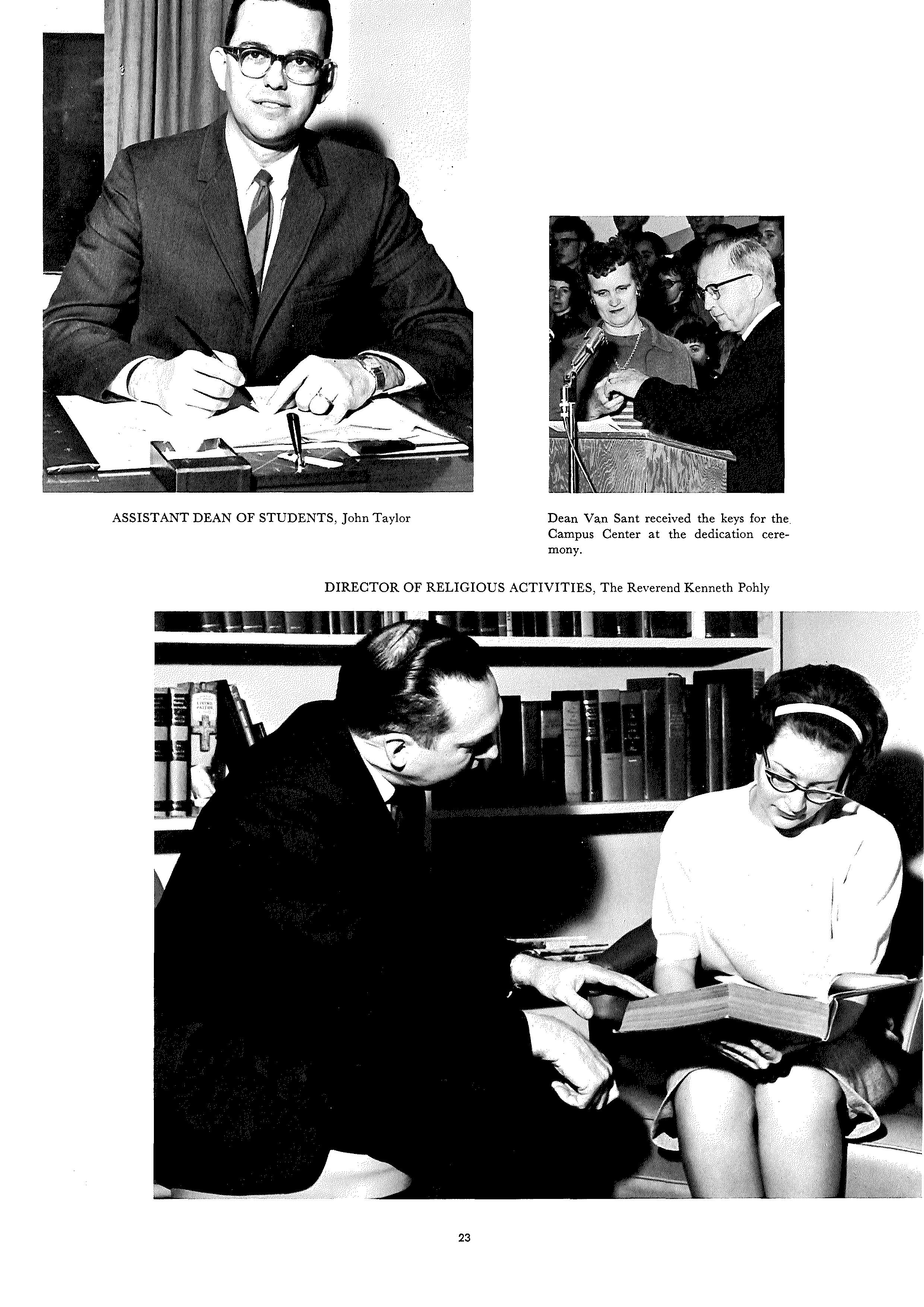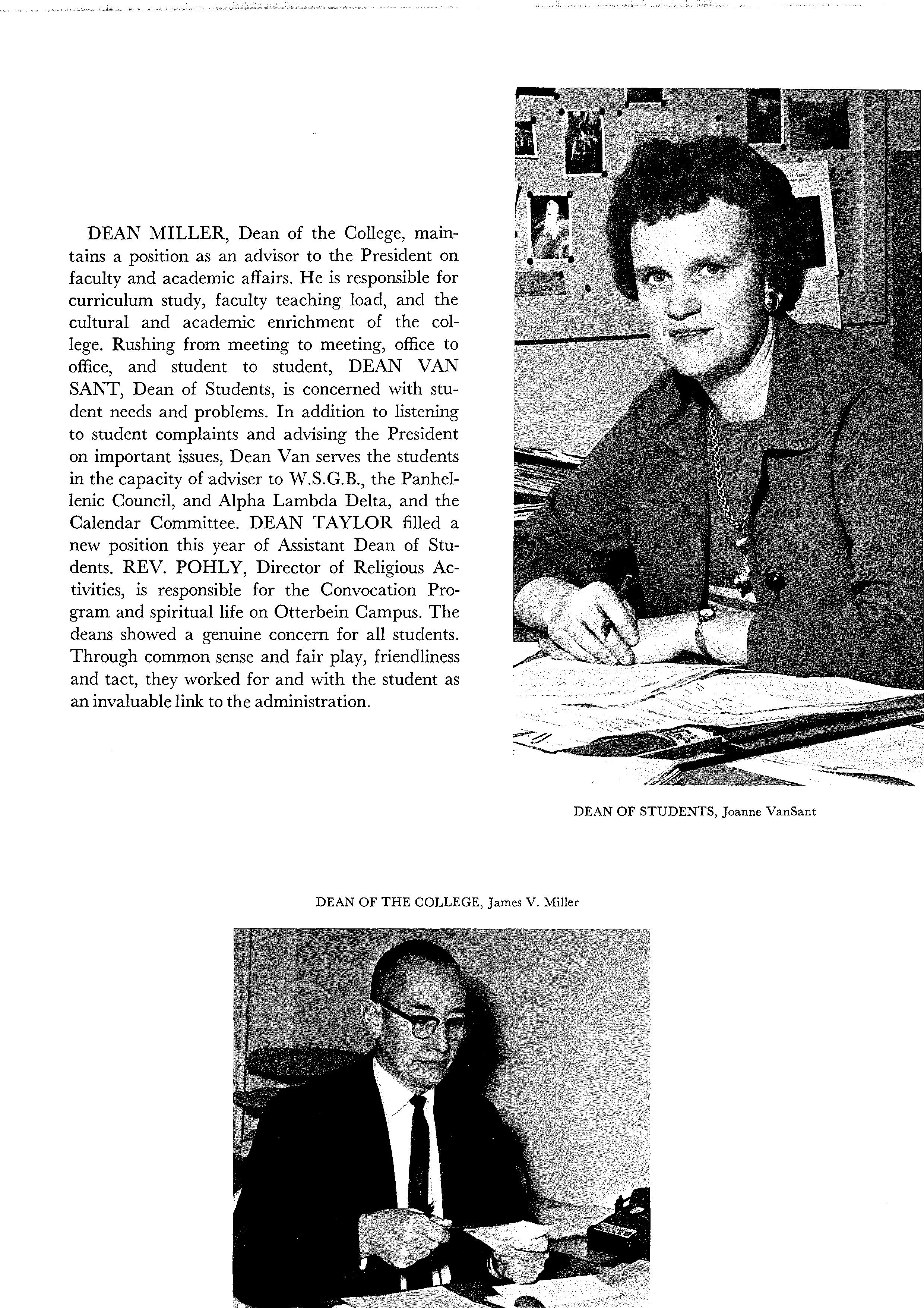 DEAN MILLER, Dean of the College, maintains a position as an advisor to the President on faculty and academic affairs. He is responsible for curriculum study, faculty teaching load, and the cultural and academic enrichment of the college. Rushing from meeting to meeting, office to office, and student to student, DEAN VAN SANT, Dean of Students, is concerned with student needs and problems. In addition to listening to student complaints and advising the President on important issues, Dean Van serves the students in the capacity of adviser to W.S.G.B., the Panhellenic Council, and Alpha Lambda Delta, and the Calendar Committee. DEAN TAYLOR filled a new position this year of Assistant Dean of Students. REV. POHL Y, Director of Religious Activities, is responsible for the Convocation Program and spiritual life on Otterbein Campus. The deans showed a genuine concern for all students. Through common sense and fair play, friendliness and tact, they worked for and with the student as an invaluable link to the administration.