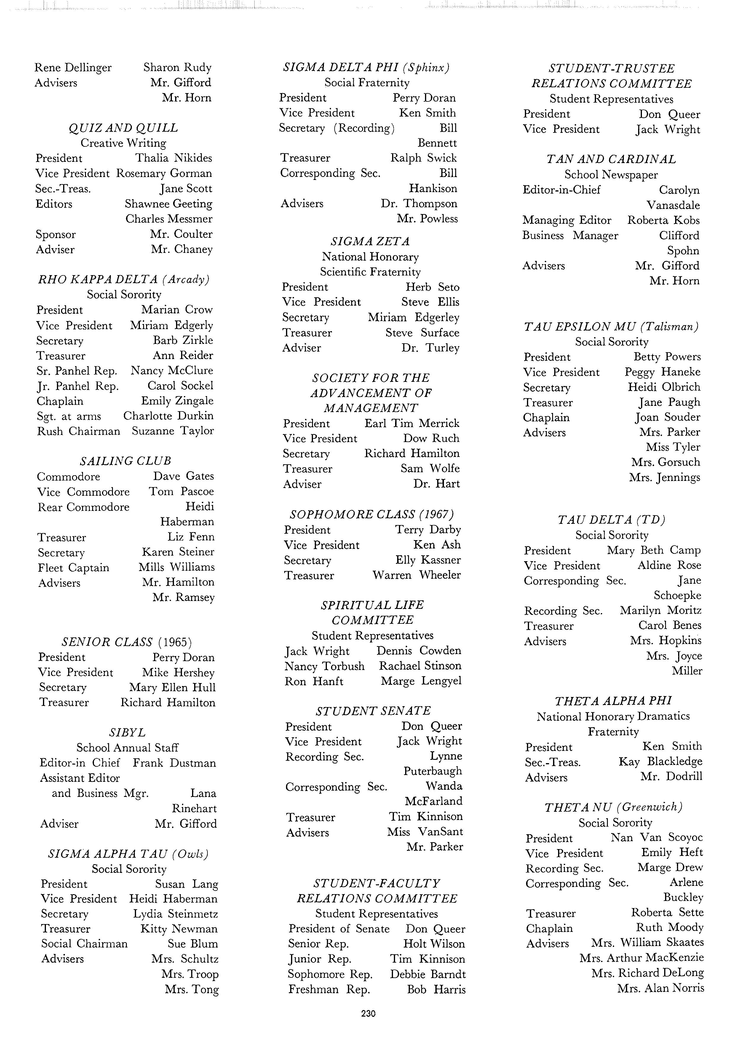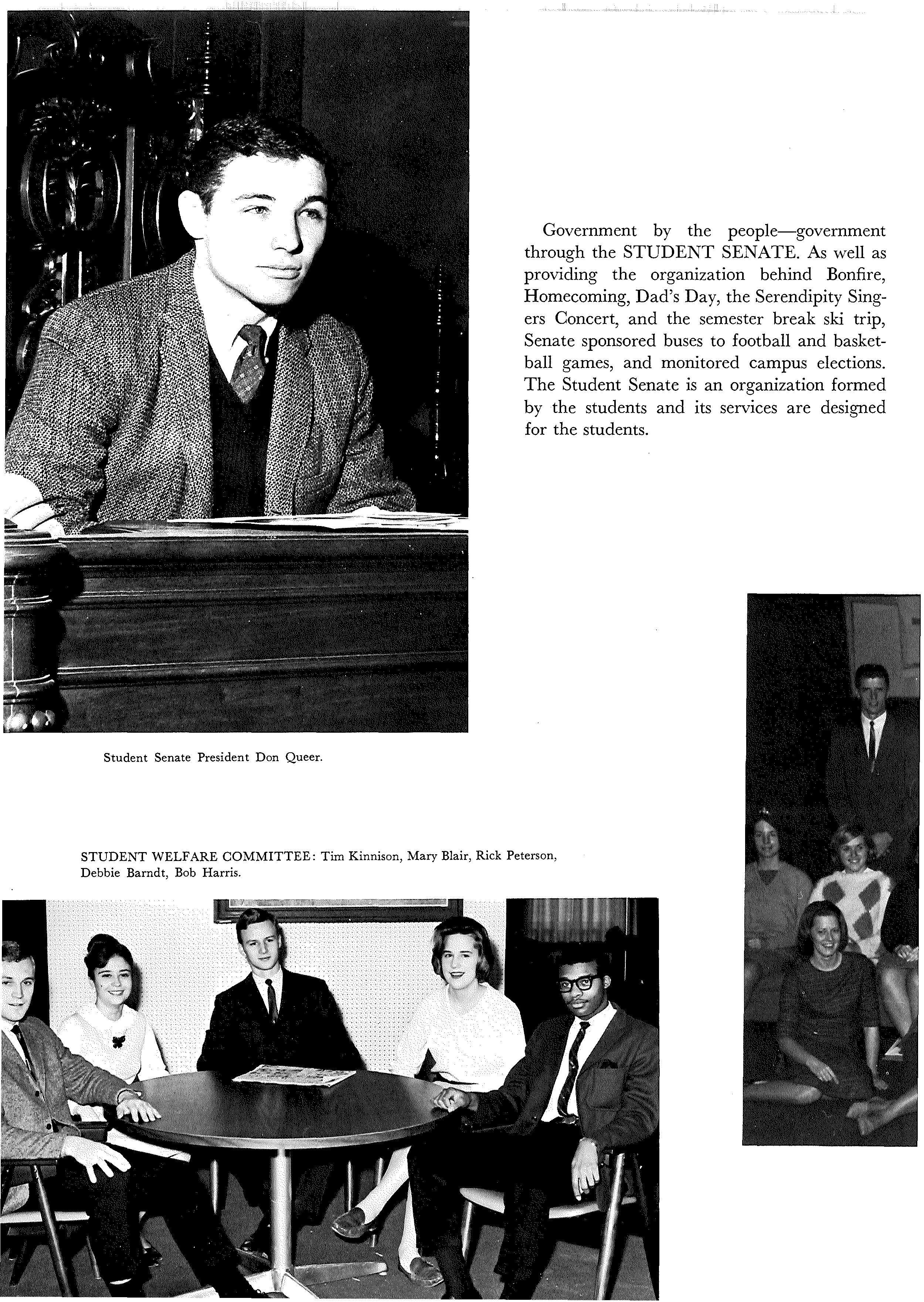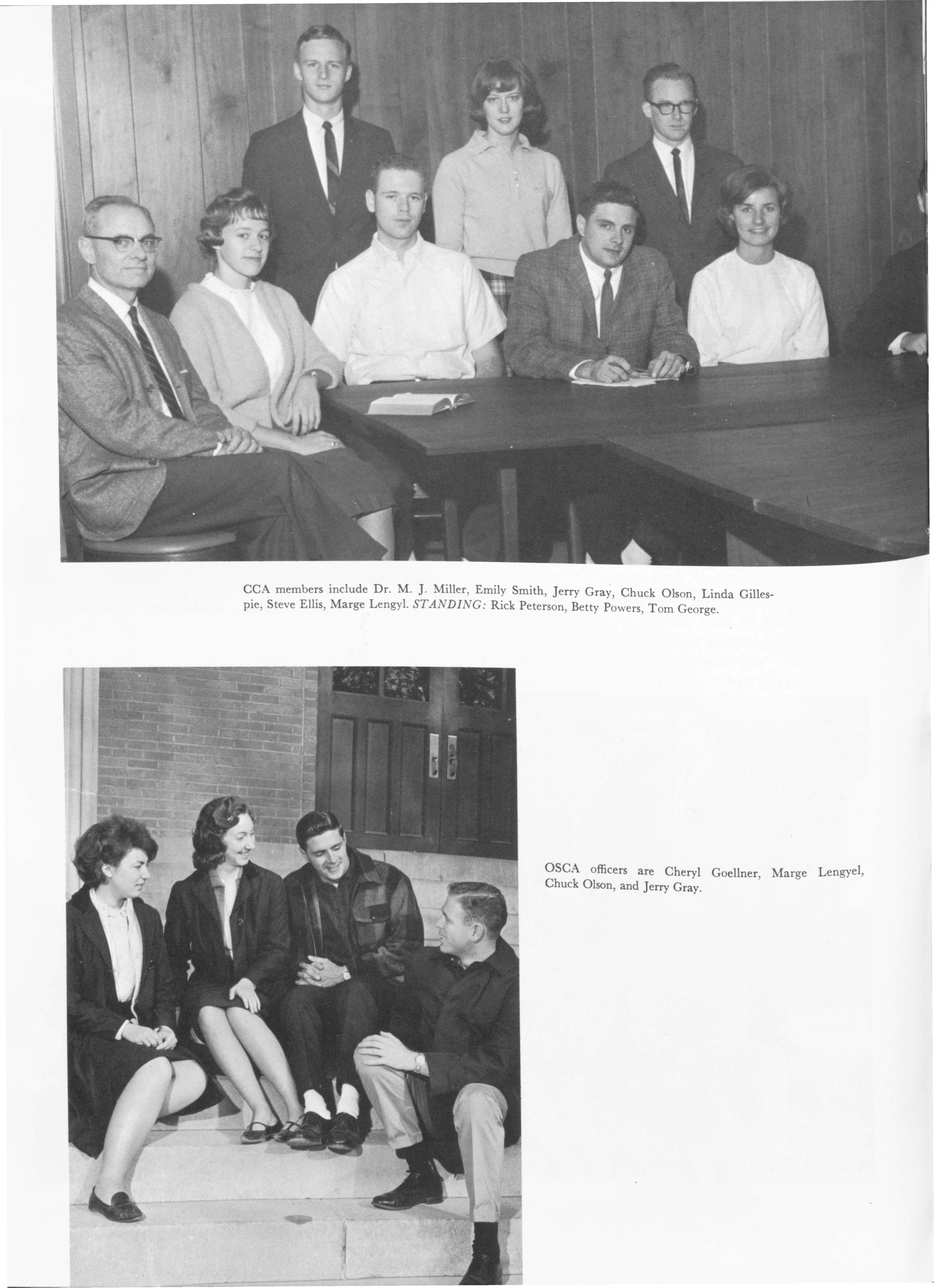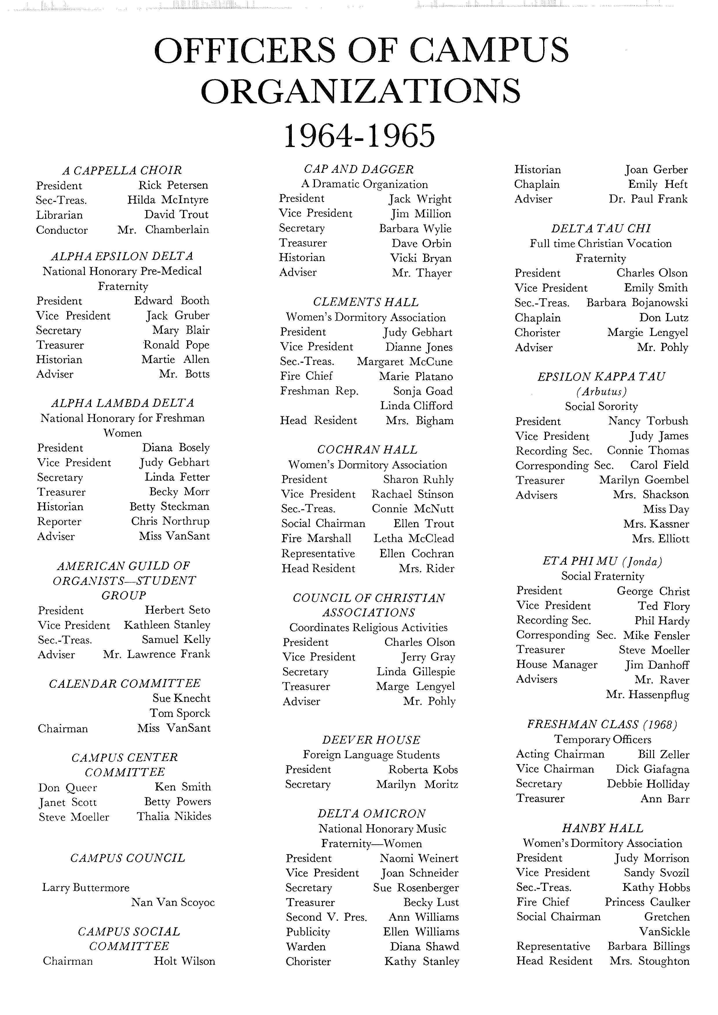 DEAN MILLER, Dean of the College, maintains a position as an advisor to the President on faculty and academic affairs. He is responsible for curriculum study, faculty teaching load, and the cultural and academic enrichment of the college. Rushing from meeting to meeting, office to office, and student to student, DEAN VAN SANT, Dean of Students, is concerned with student needs and problems. In addition to listening to student complaints and advising the President on important issues, Dean Van serves the students in the capacity of adviser to W.S.G.B., the Panhellenic Council, and Alpha Lambda Delta, and the Calendar Committee. DEAN TAYLOR filled a new position this year of Assistant Dean of Students. REV. POHL Y, Director of Religious Activities, is responsible for the Convocation Program and spiritual life on Otterbein Campus. The deans showed a genuine concern for all students. Through common sense and fair play, friendliness and tact, they worked for and with the student as an invaluable link to the administration.