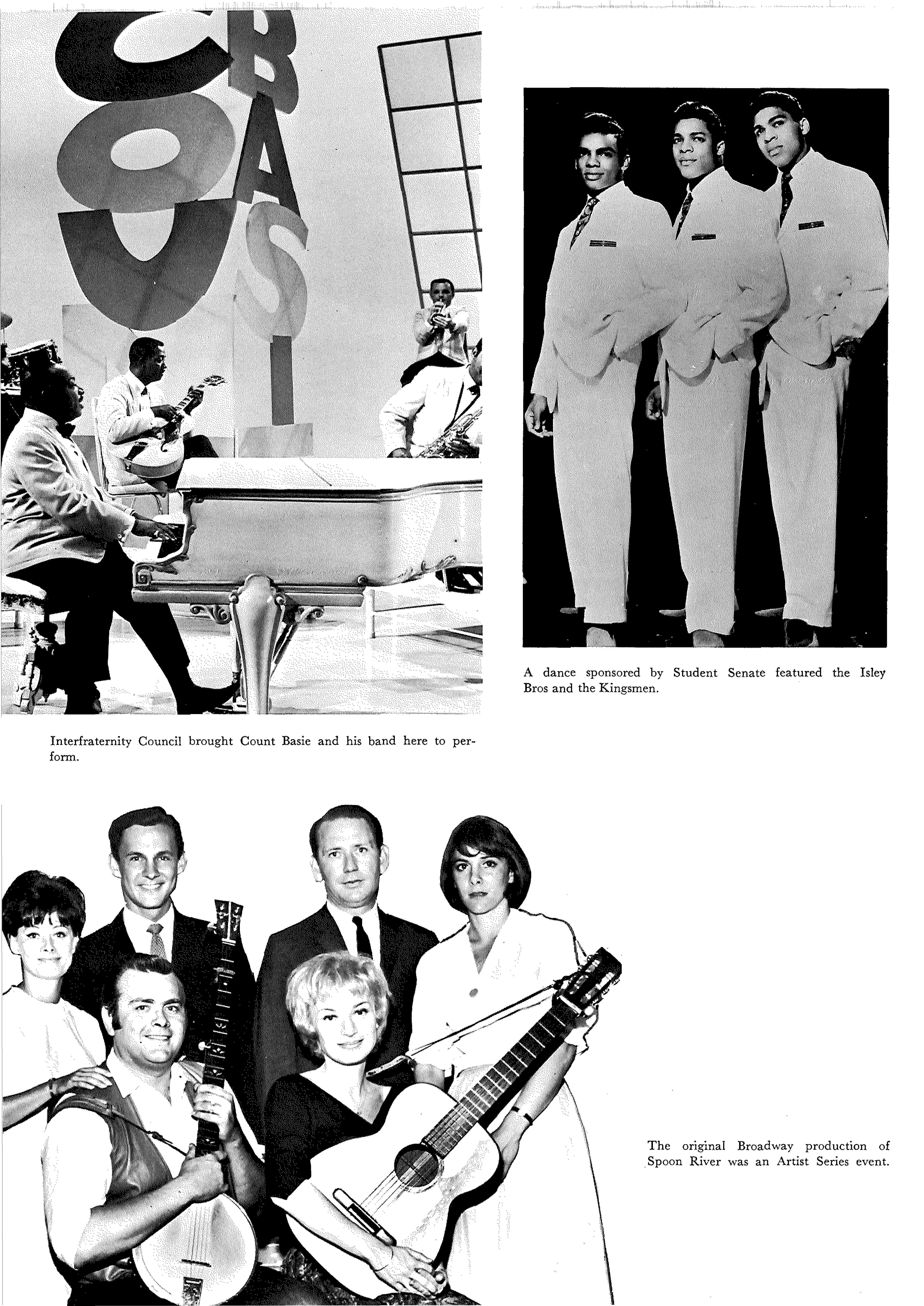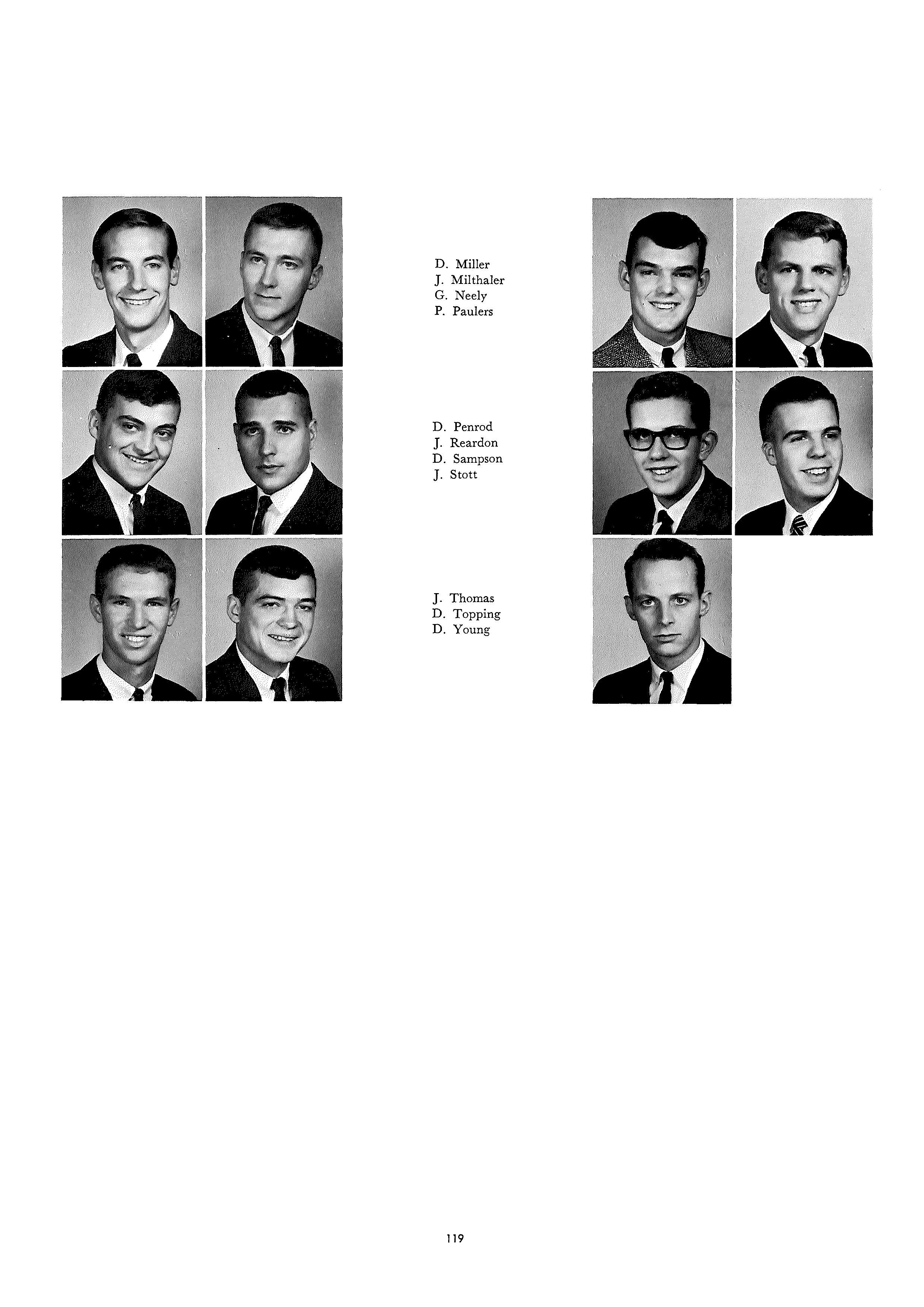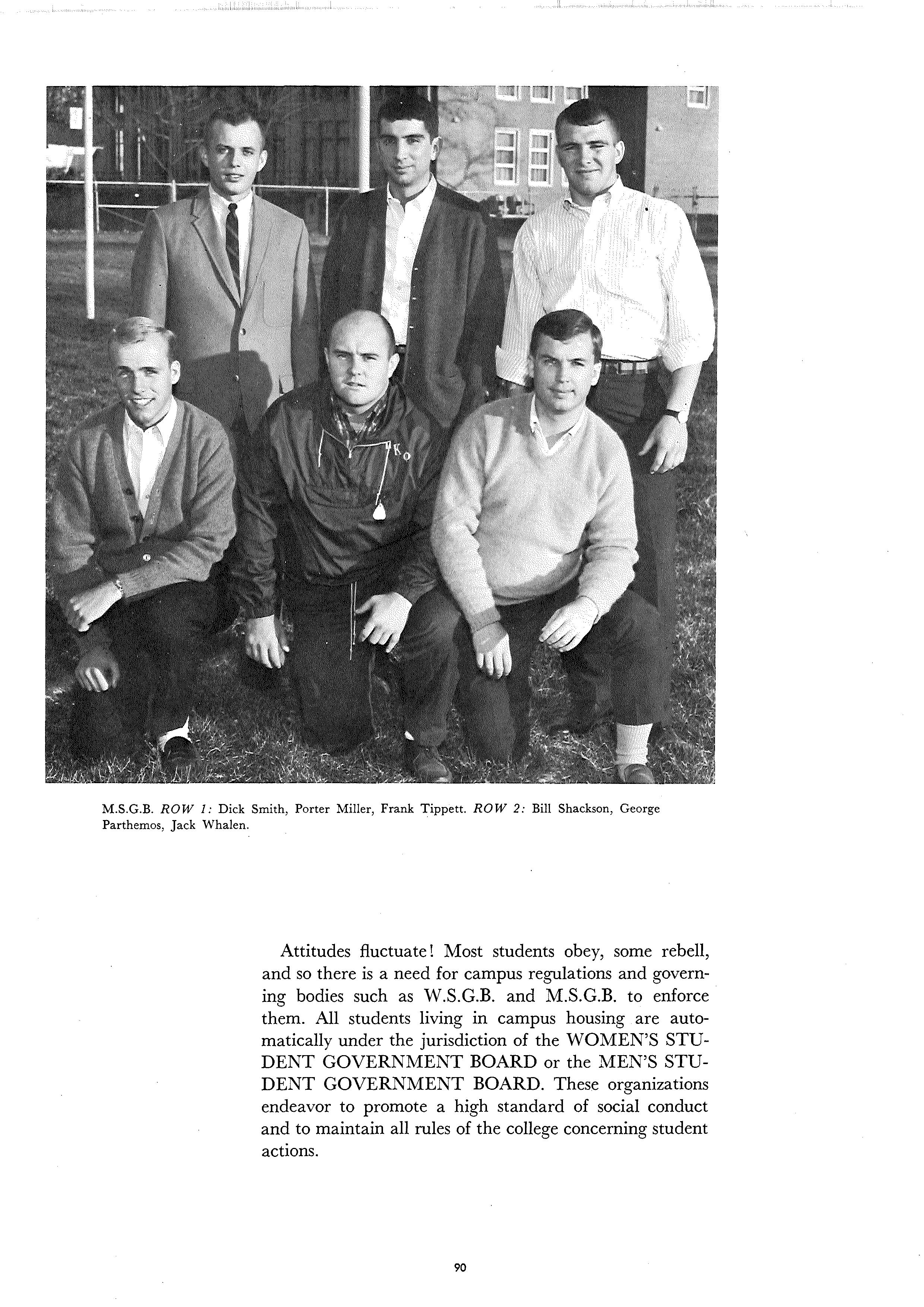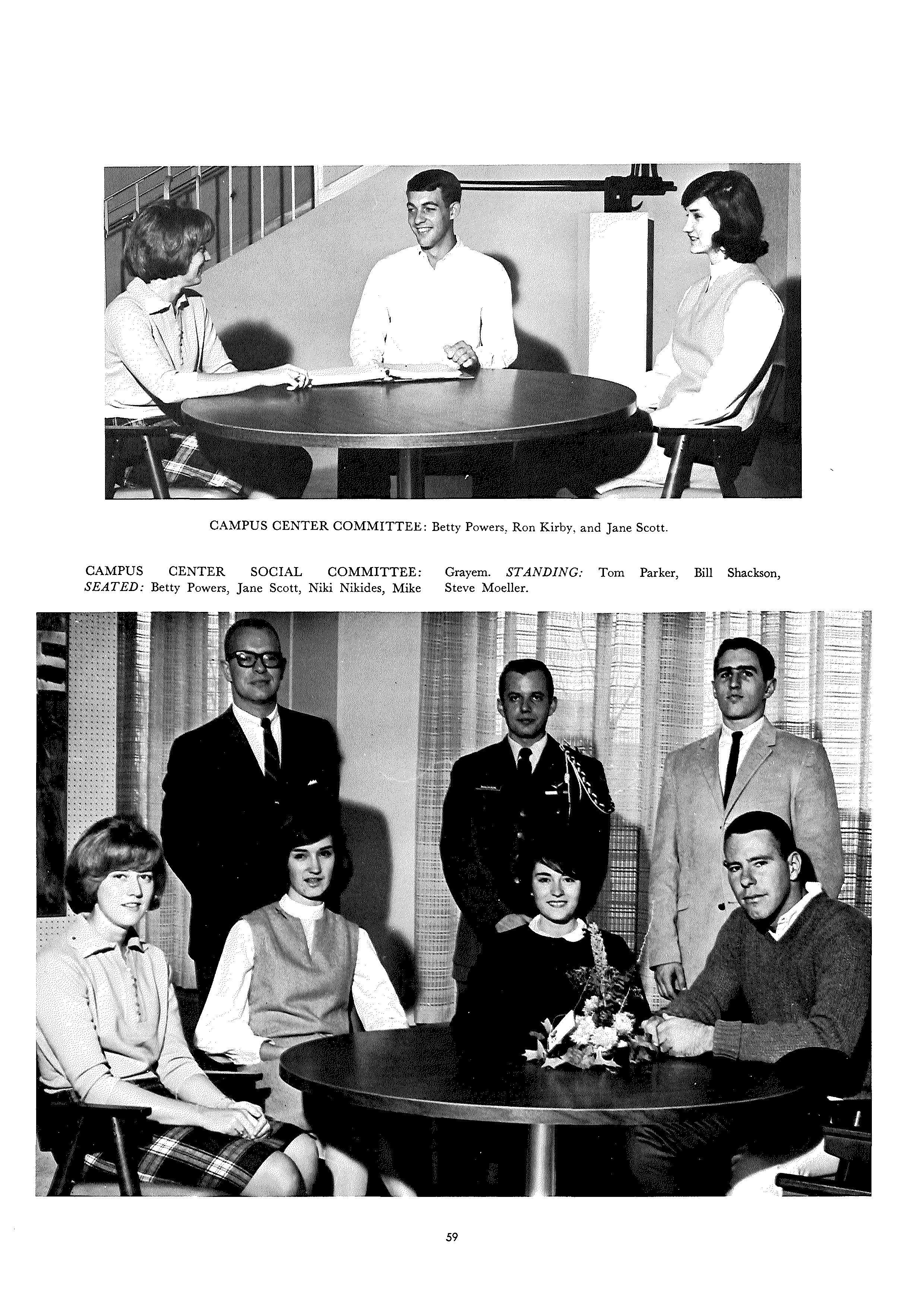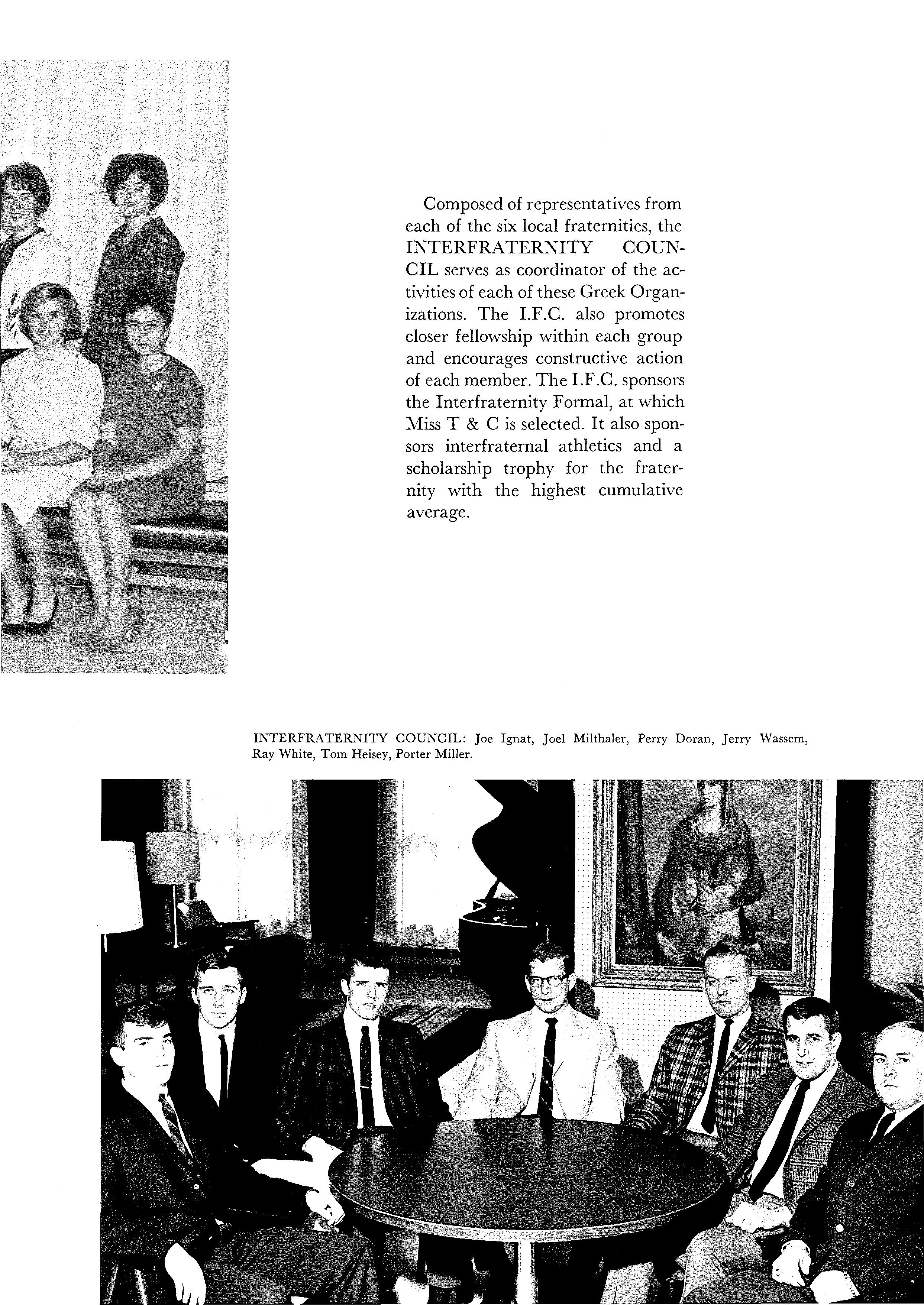 DEAN MILLER, Dean of the College, maintains a position as an advisor to the President on faculty and academic affairs. He is responsible for curriculum study, faculty teaching load, and the cultural and academic enrichment of the college. Rushing from meeting to meeting, office to office, and student to student, DEAN VAN SANT, Dean of Students, is concerned with student needs and problems. In addition to listening to student complaints and advising the President on important issues, Dean Van serves the students in the capacity of adviser to W.S.G.B., the Panhellenic Council, and Alpha Lambda Delta, and the Calendar Committee. DEAN TAYLOR filled a new position this year of Assistant Dean of Students. REV. POHL Y, Director of Religious Activities, is responsible for the Convocation Program and spiritual life on Otterbein Campus. The deans showed a genuine concern for all students. Through common sense and fair play, friendliness and tact, they worked for and with the student as an invaluable link to the administration.