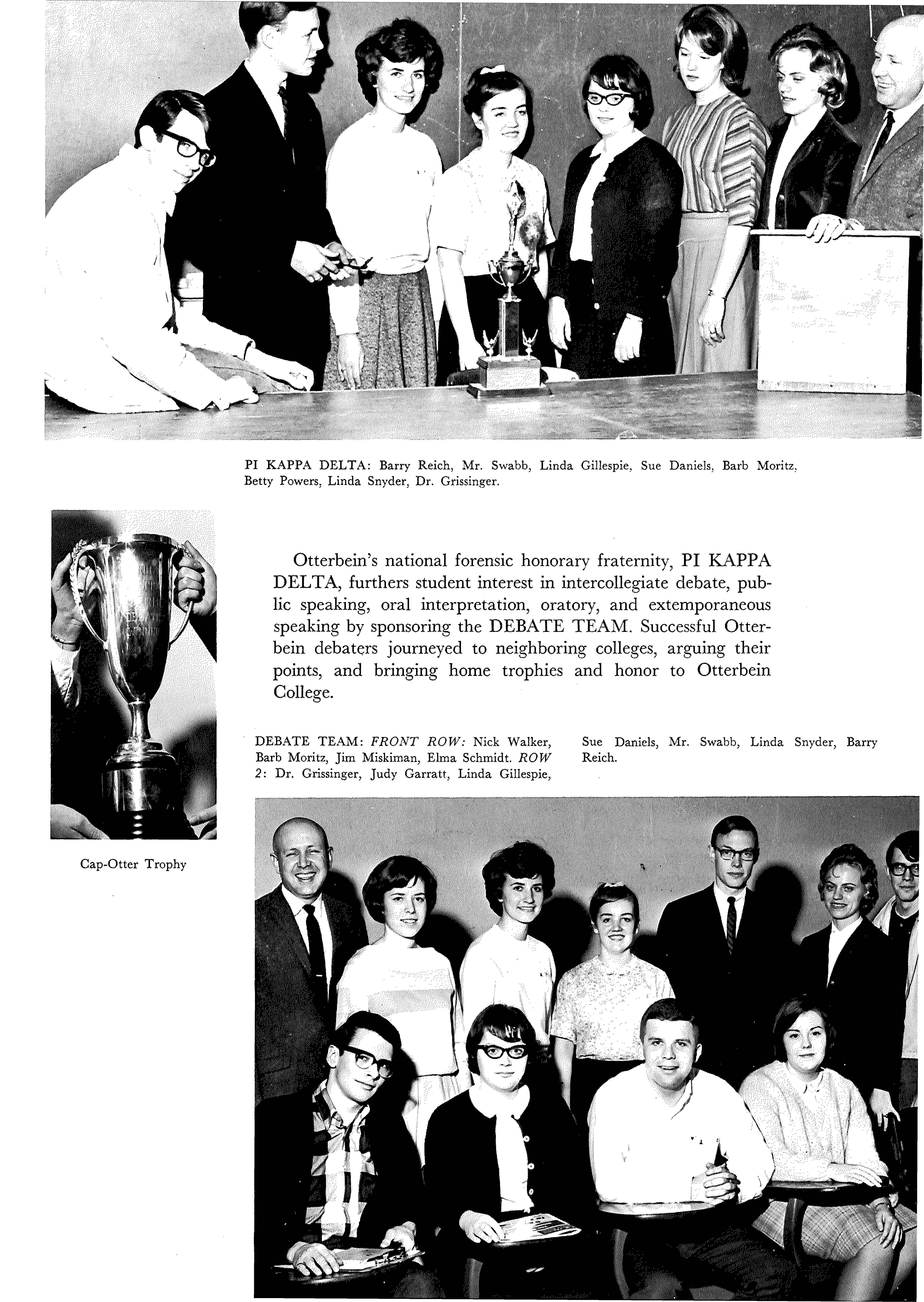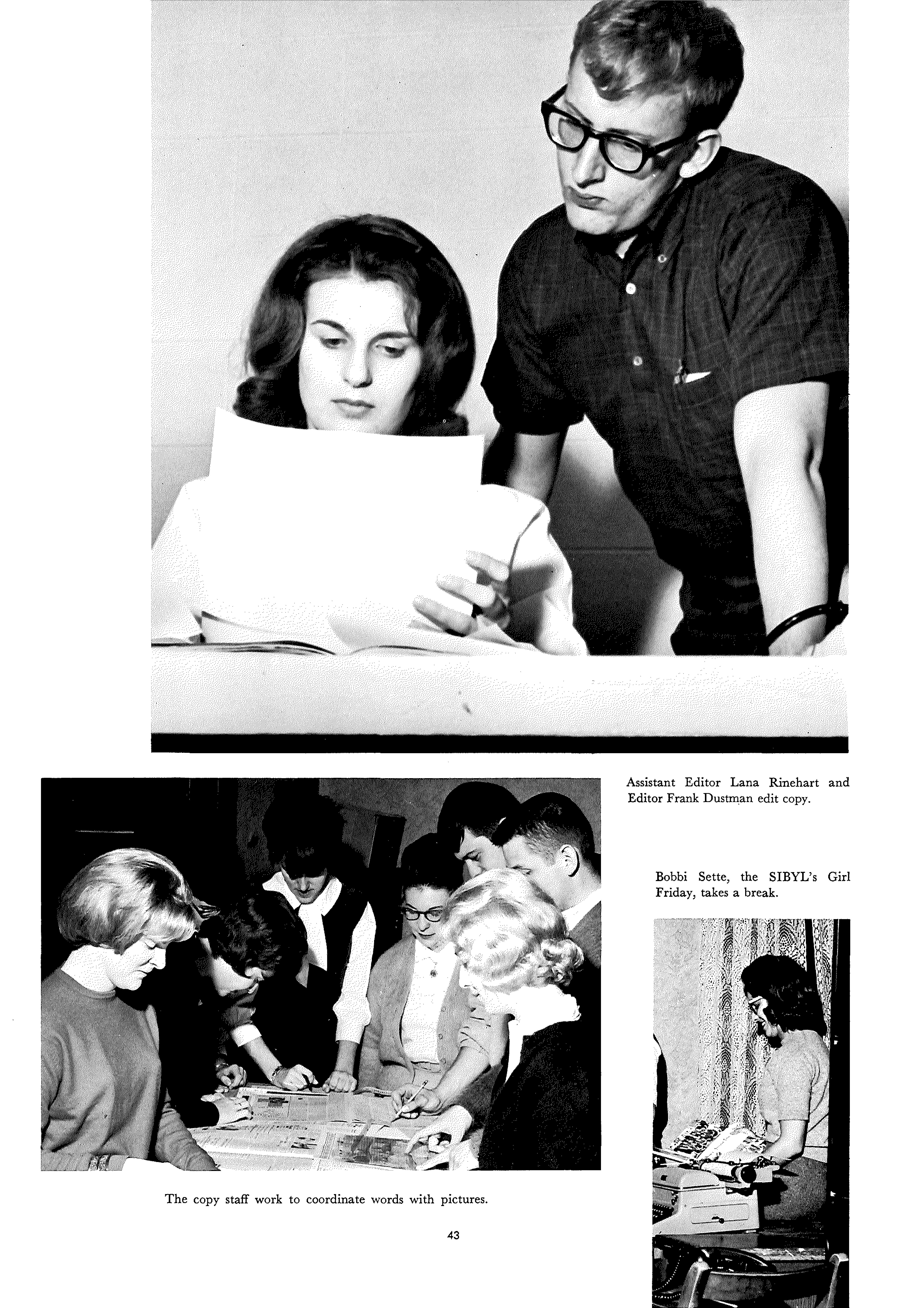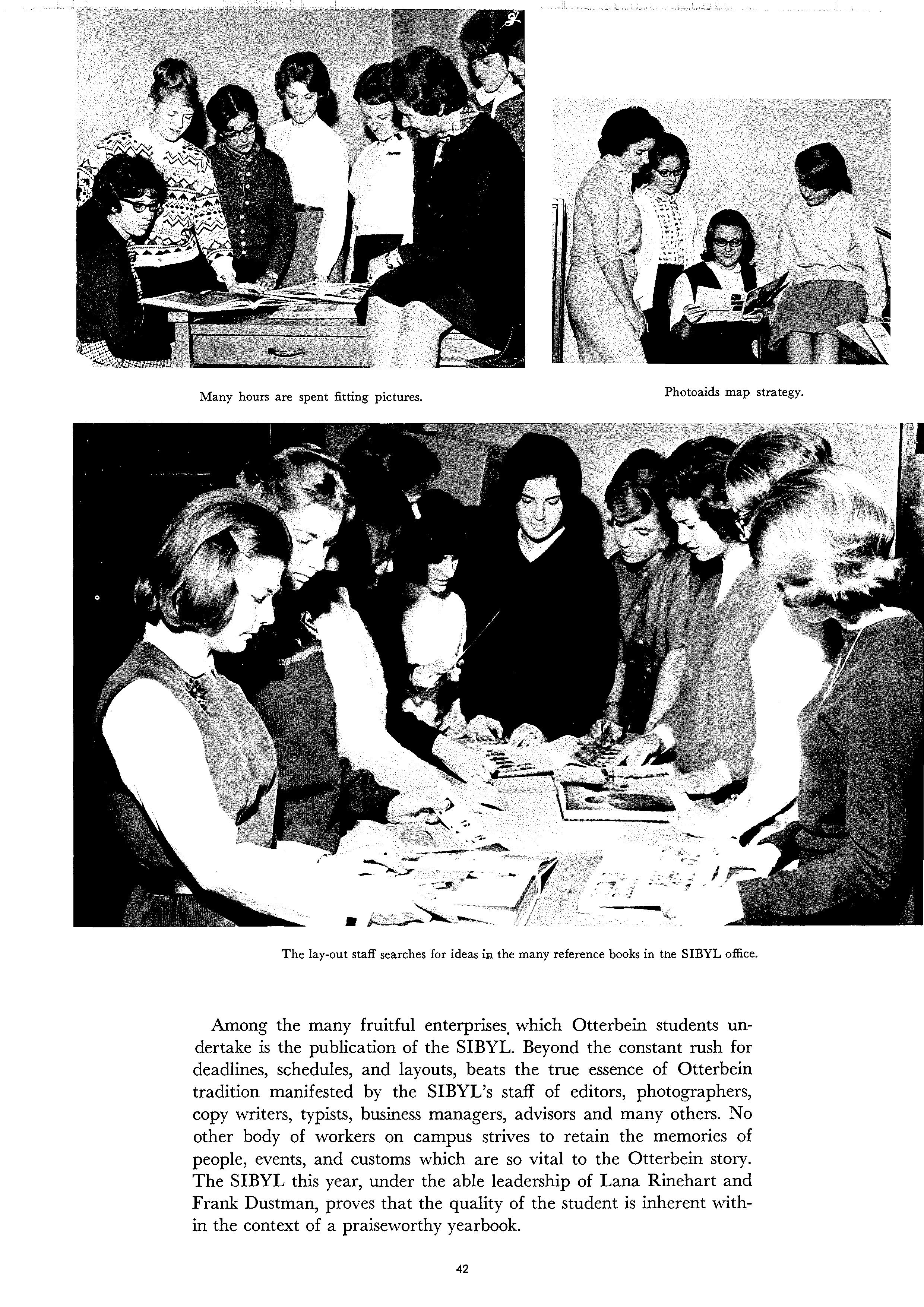 Among the many fruitful enterprises. which Otterbein students undertake is the publication of the SIBYL. Beyond the constant rush for deadlines, schedules, and layouts, beats the true essence of Otterbein tradition manifested by the SIBYL's staff of editors, photographers, copy writers, typists, business managers, advisors and many others. No other body of workers on campus strives to retain the memories of people, events, and customs which are so vital to the Otterbein story. The SIBYL this year, under the able leadership of Lana Rinehart and Frank Dustman, proves that the quality of the student is inherent within the context of a praiseworthy yearbook.