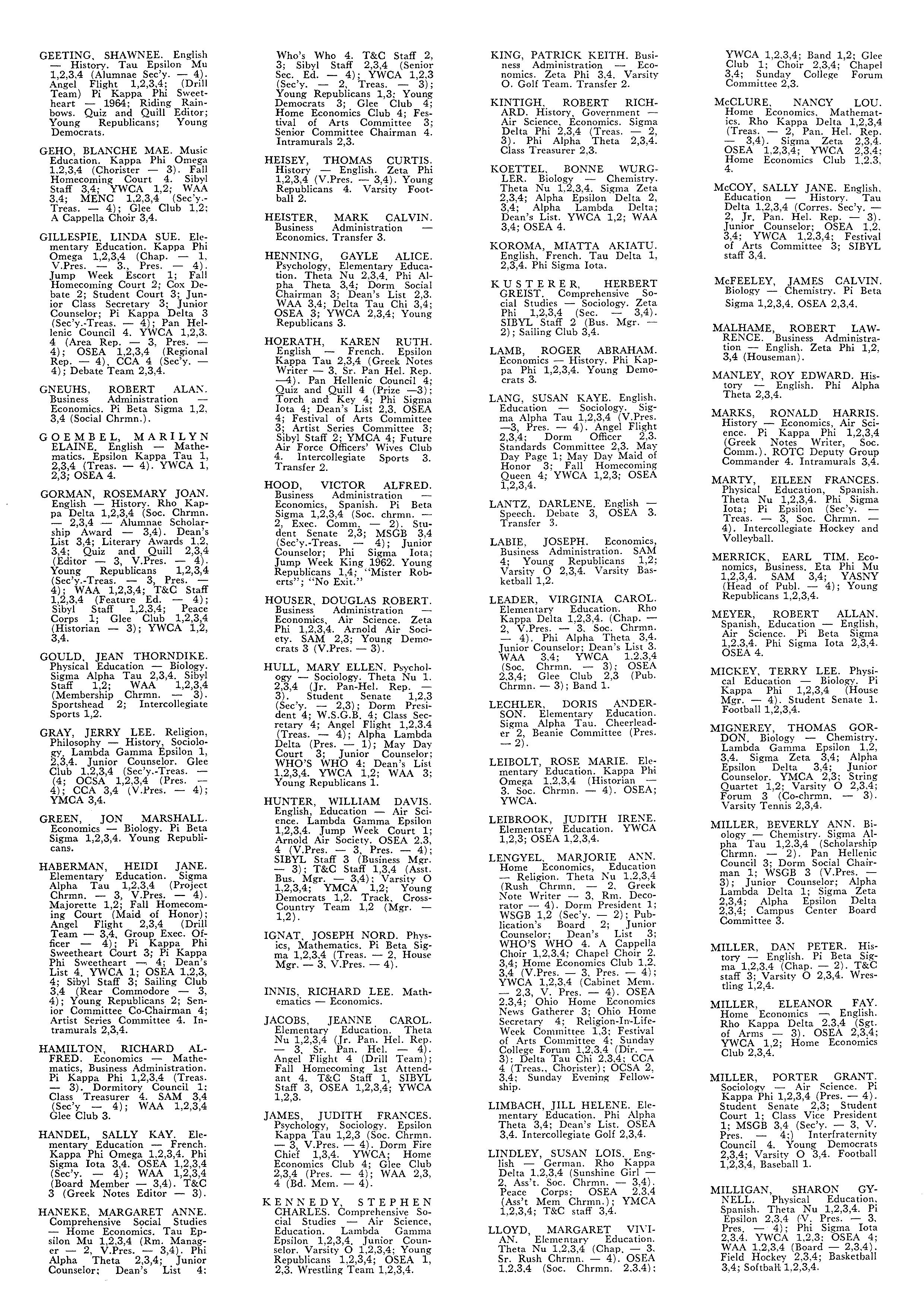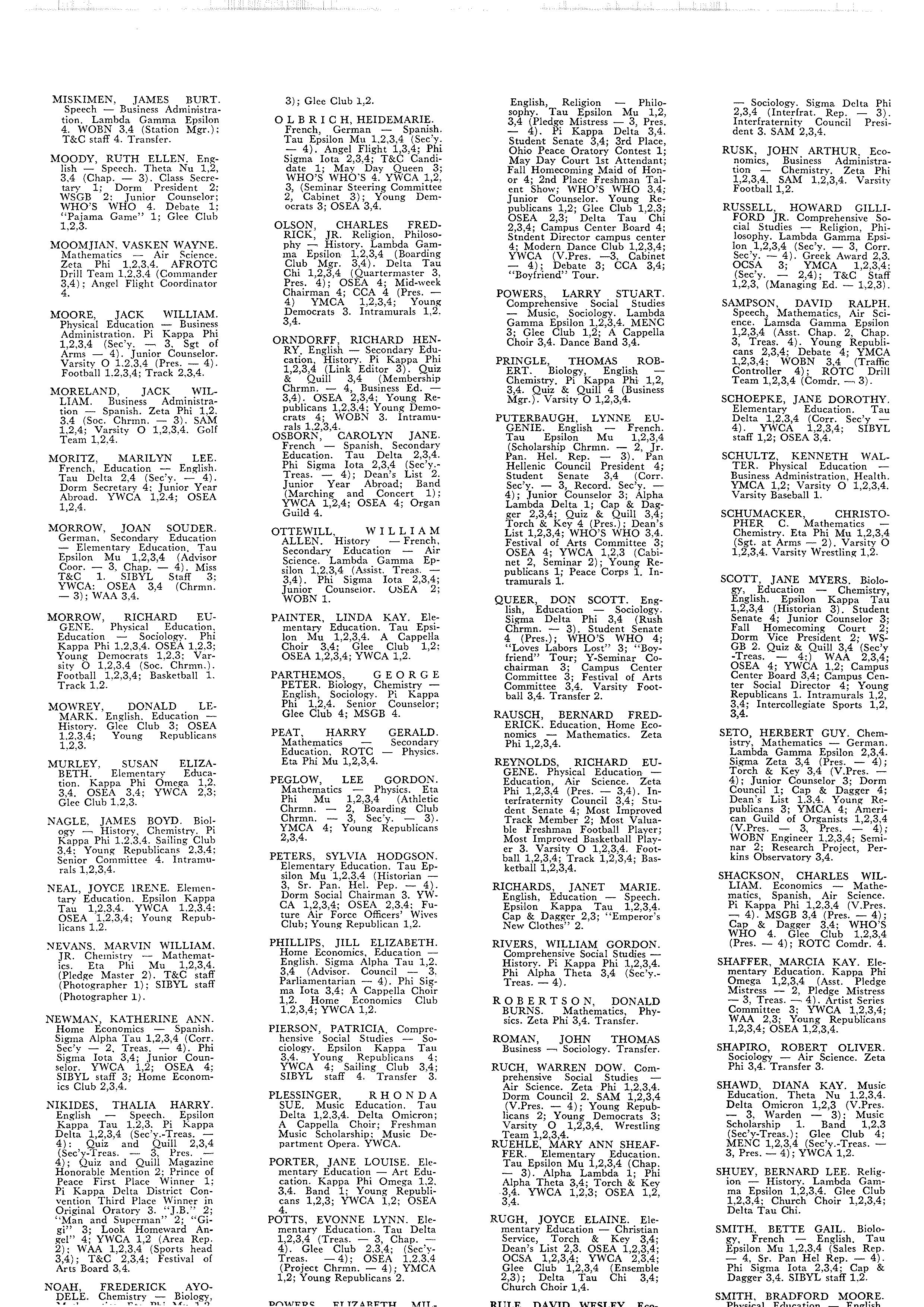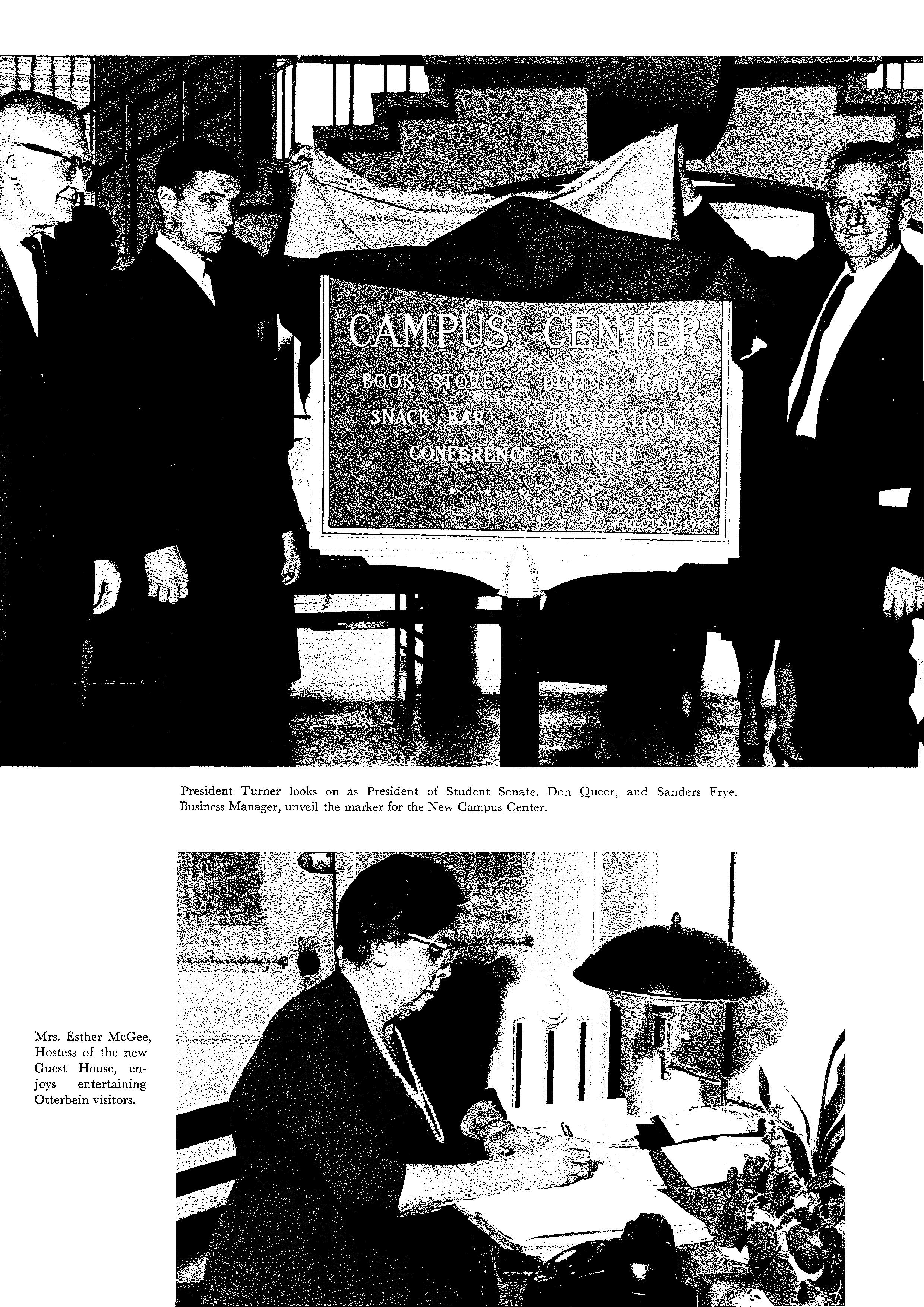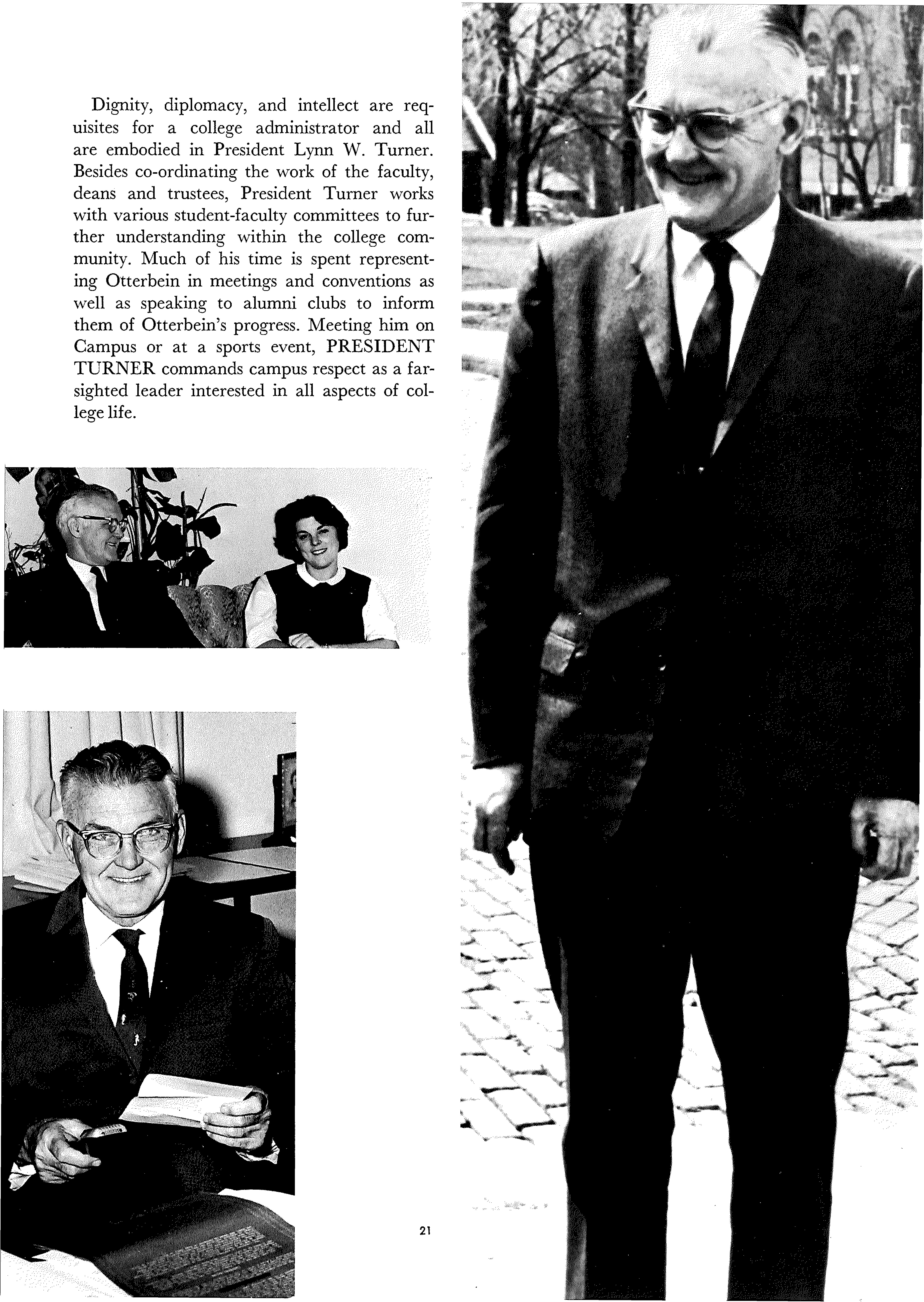 Dignity, diplomacy, and intellect are requisites for a college administrator and all are embodied in President Lynn W. Turner. Besides co-ordinating the work of the faculty, deans and trustees, President Turner works with various student-faculty committees to further understanding within the college community. Much of his time is spent representing Otterbein in meetings and conventions as well as speaking to alumni clubs to inform them of Otterbein's progress. Meeting him on Campus or at a sports event, PRESIDENT TURNER commands campus respect as a farsighted leader interested in all aspects of college life.