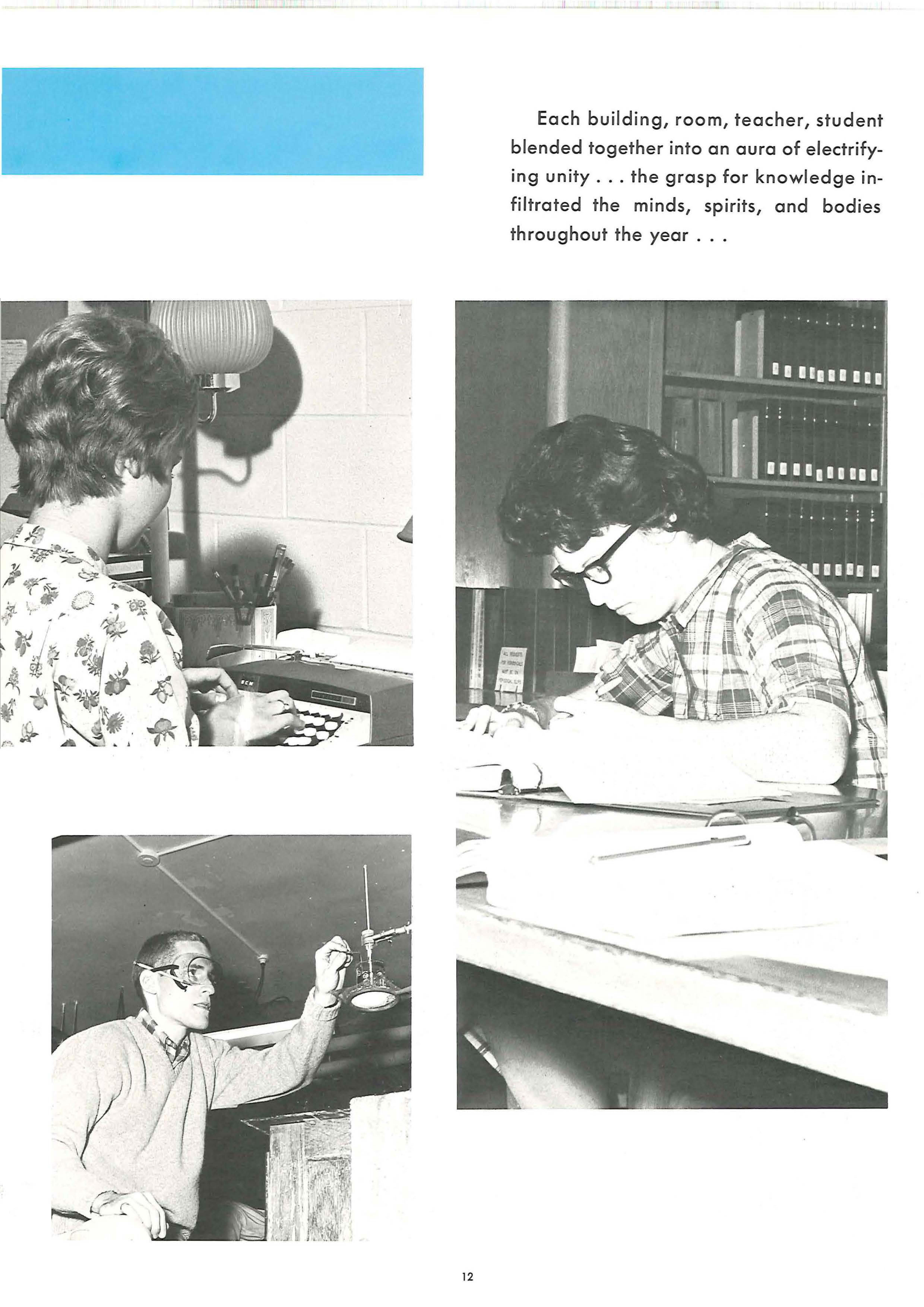 Each building, room, teacher, student blended together into an aura of electrifying unity the grasp for knowledge infiltrated the minds, spirits, and bodies throughout the year ...