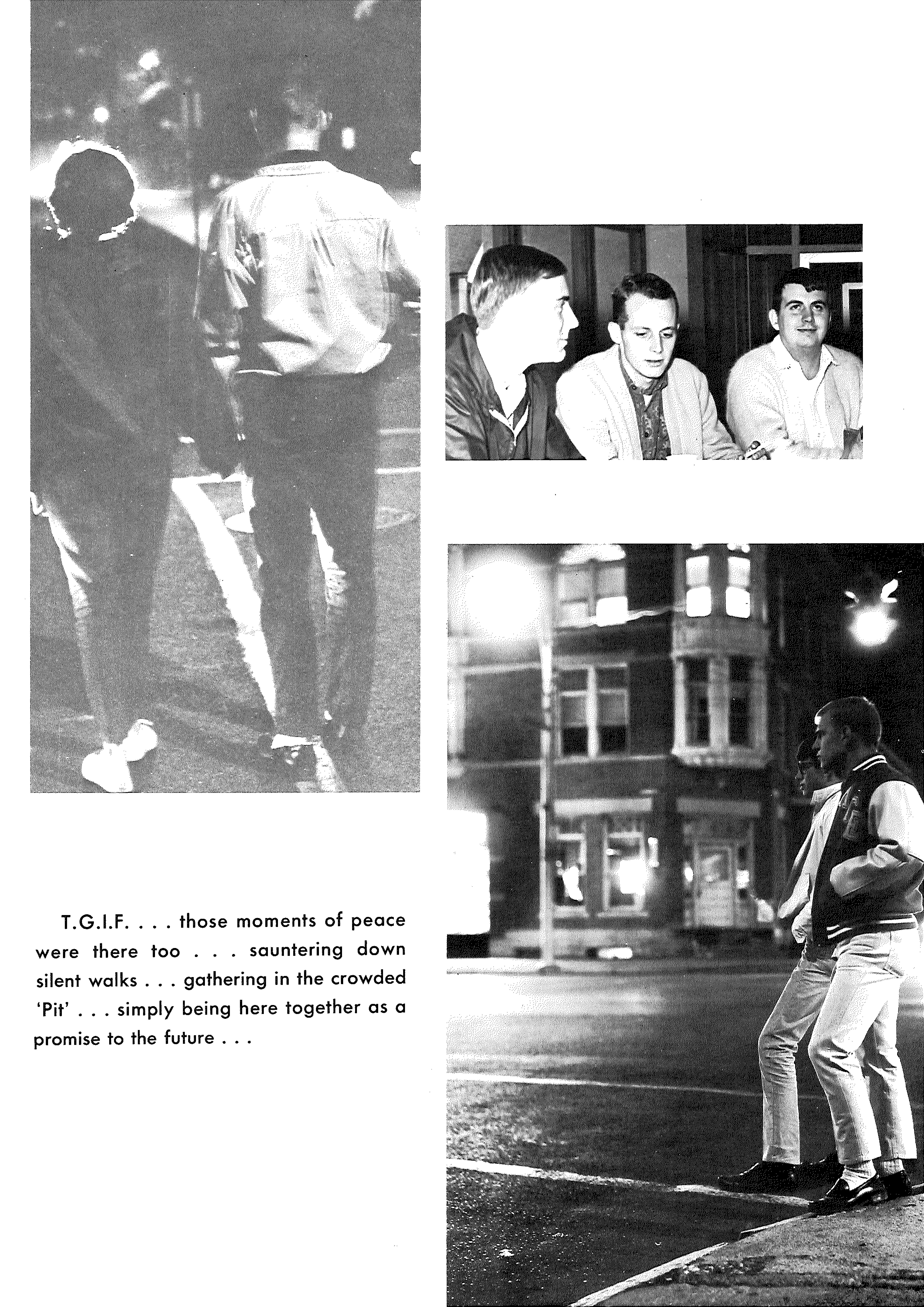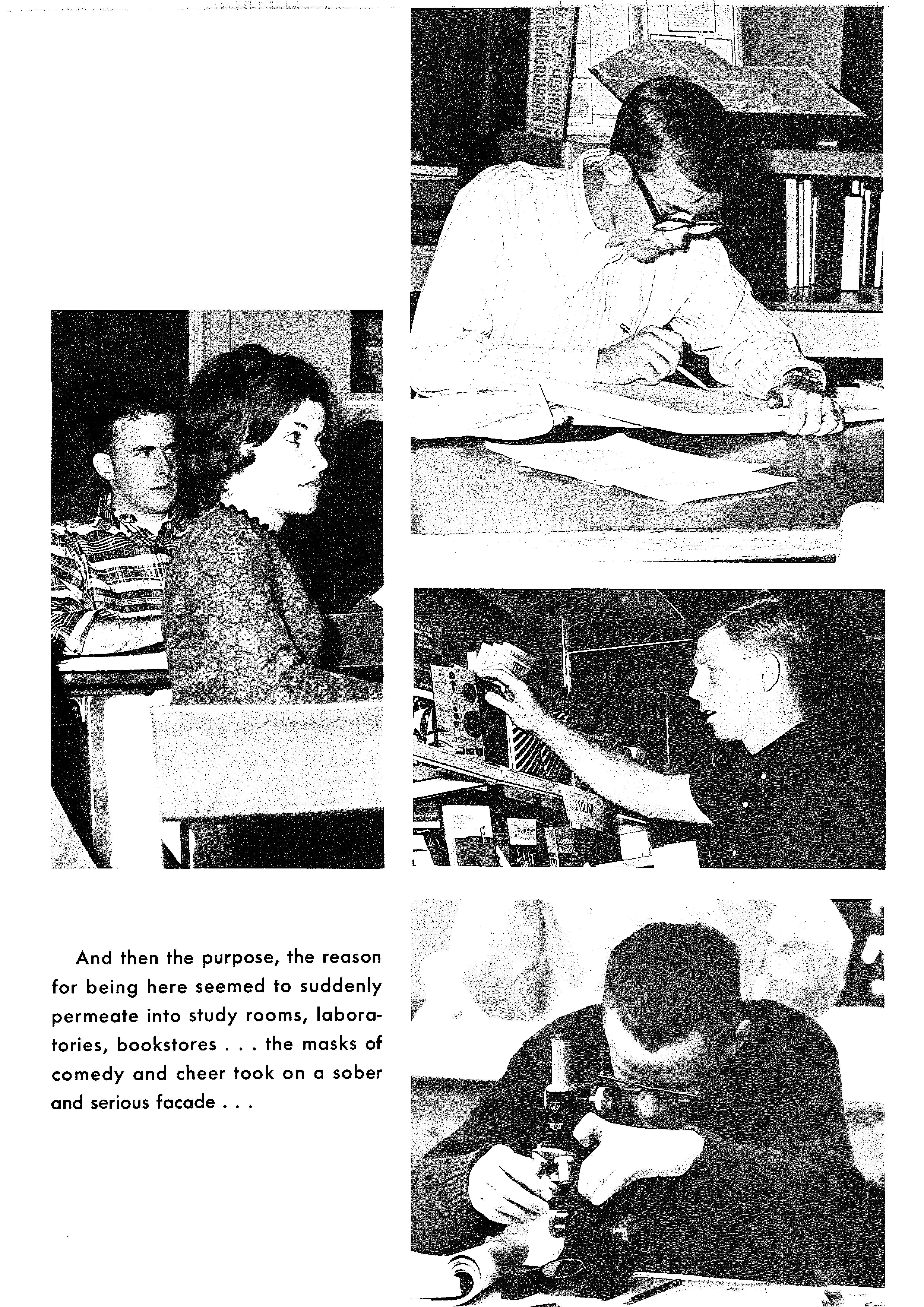 And then the purpose, the reason for being here seemed to suddenly permeate into study rooms, laboratories, bookstores the masks of comedy and cheer took on a sober and serious facade ...