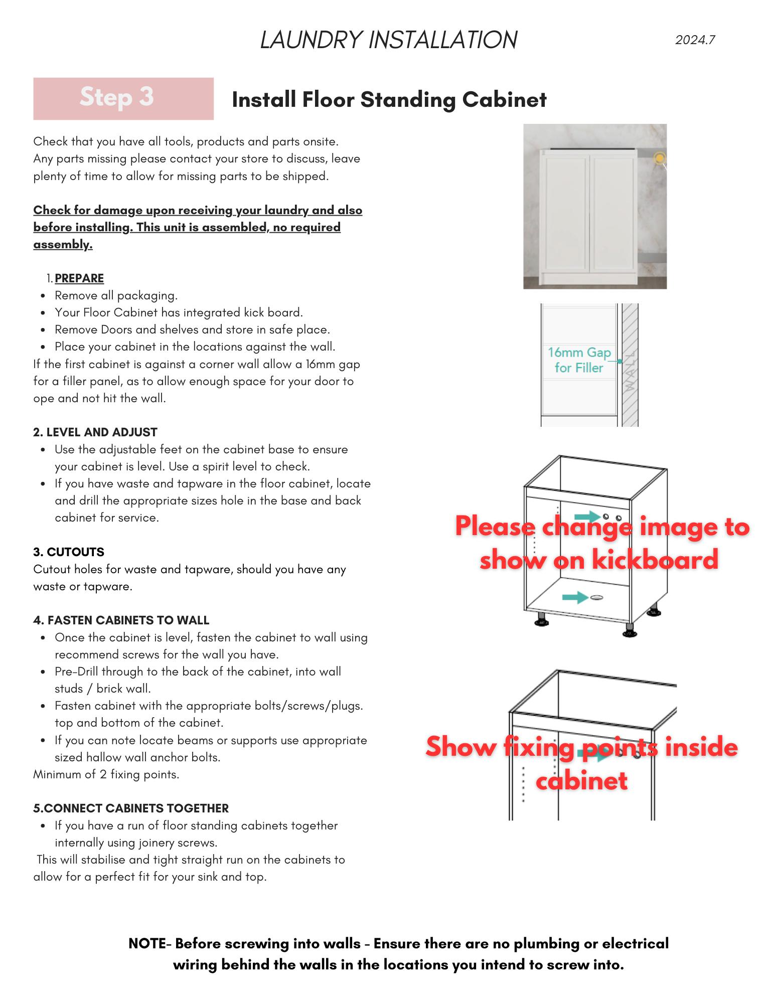 Once the cabinet is level and fastened to the wall; NOTE- Before screwing into walls - Ensure there are no plumbing or electrical wiring behind the walls in the locations you intend to screw into)