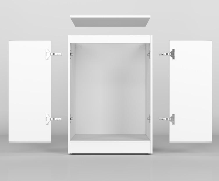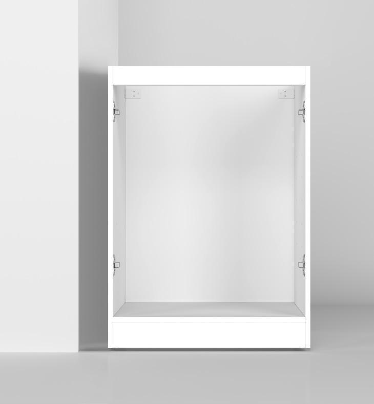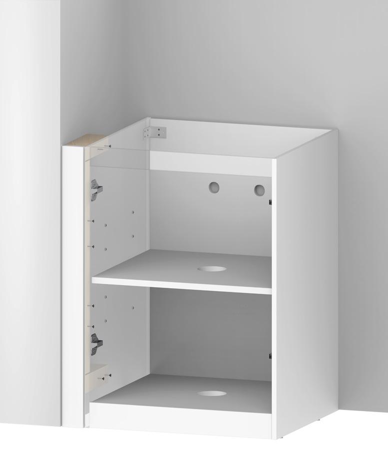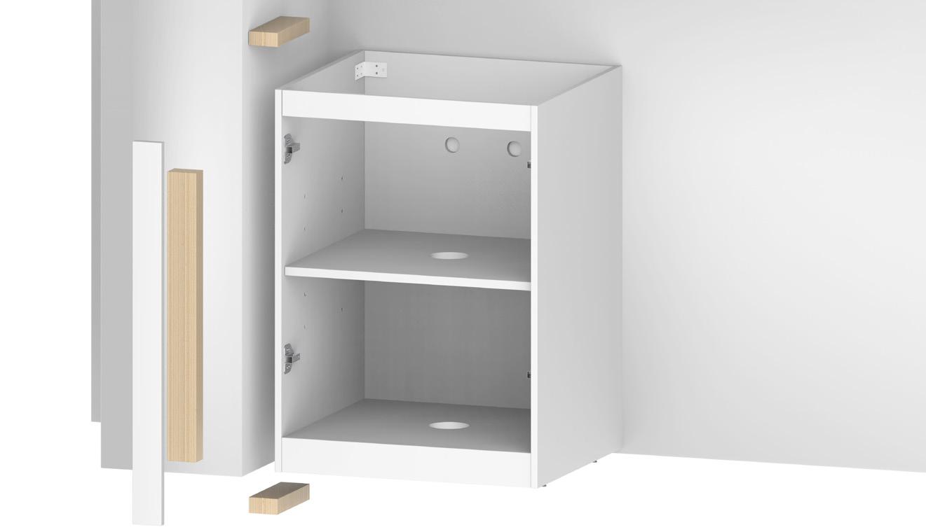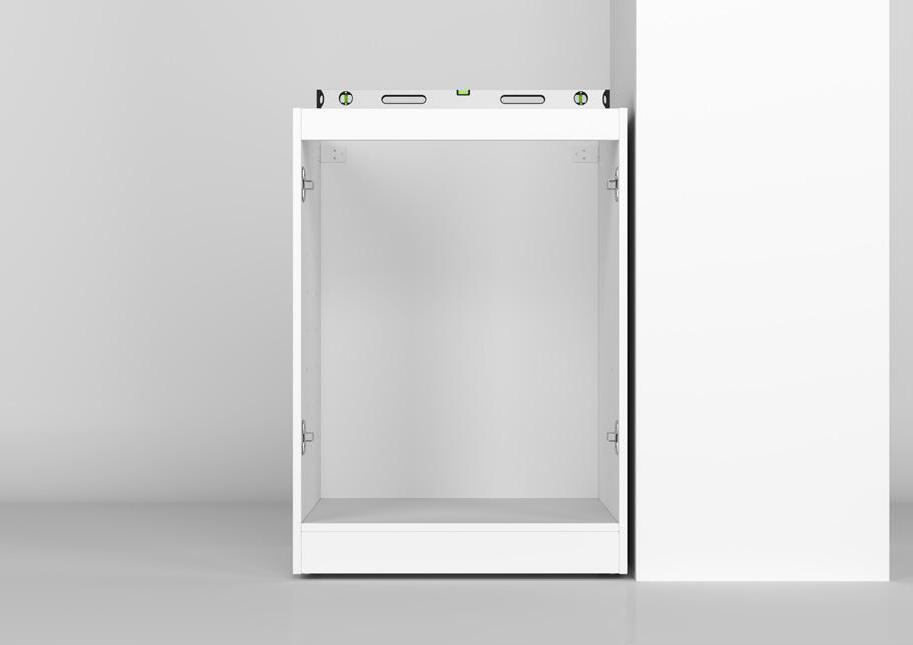 Your Tall Cabinet has integrated kick board. Remove Doors and shelves and store in safe place. Place your cabinet in the locations against the wall If the first cabinet is against a corner wall allow a 16mm gap for a filler panel, as to allow enough space for your door to open and not hit the wall
