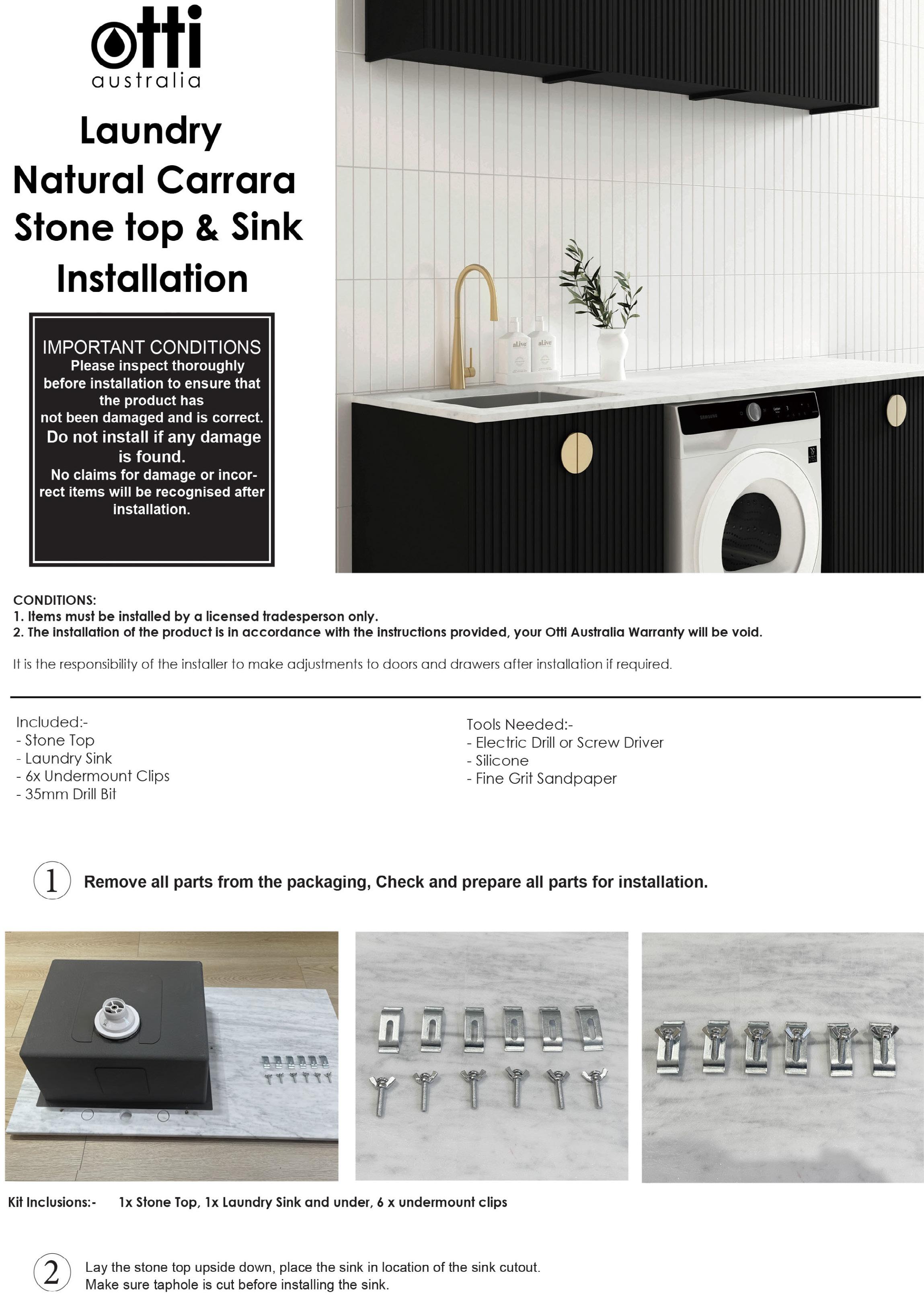 2. The installation of the product is in accordance with the instructions provided, your Otti Australia Warranty will be void. It is the responsibility of the installer to make adjustments to doors and drawers after installation if required.