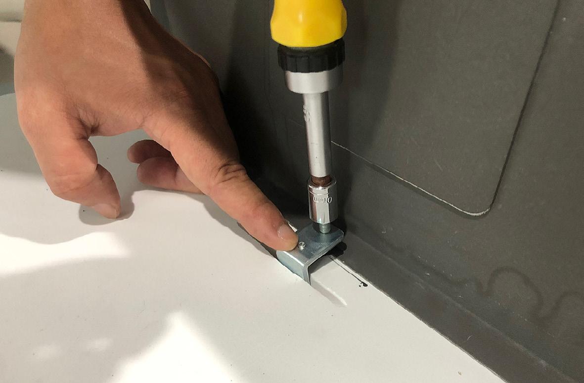 Insert the laundry sink into the hole in the benchtop, and make sure it is sitting straight. With a screwdriver, tighten the brackets so that the sink is secured underneath the benchtop for a tight finish. Repeat this step until all of the brackets are tight and the trough is secure.