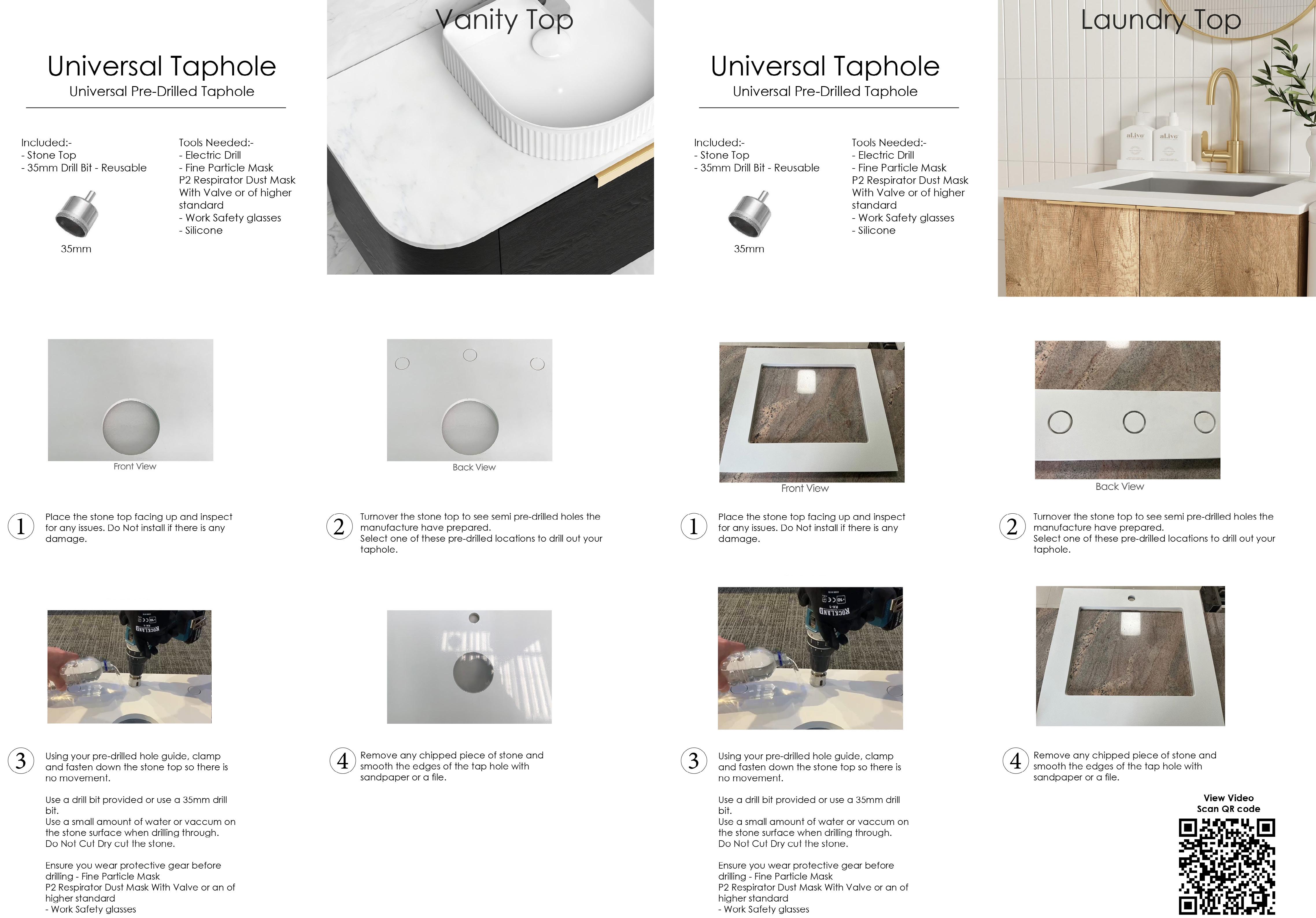 Material:- Italian Natural Carrara Stone Finish:- Polished No Semi-Drilled Tapholes, Taphole must be drilled from top side Taphole Cutting Service $55 per hole cut Waste :- 100mm Diameter