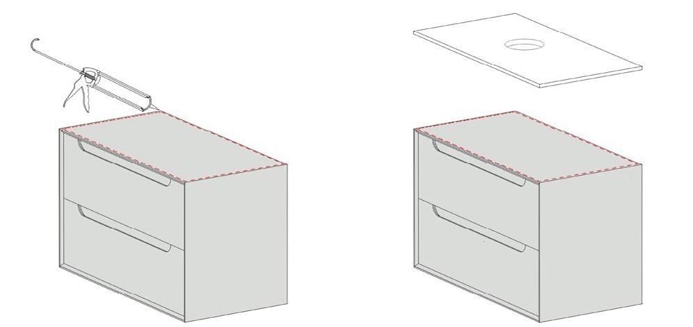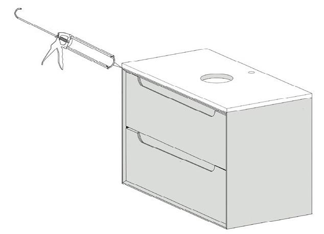 Ensure a bead of antifungal, non- acidic silicone is applied to the top edges of both the front and either side panel of the cabinet prior to the installation of the top.
