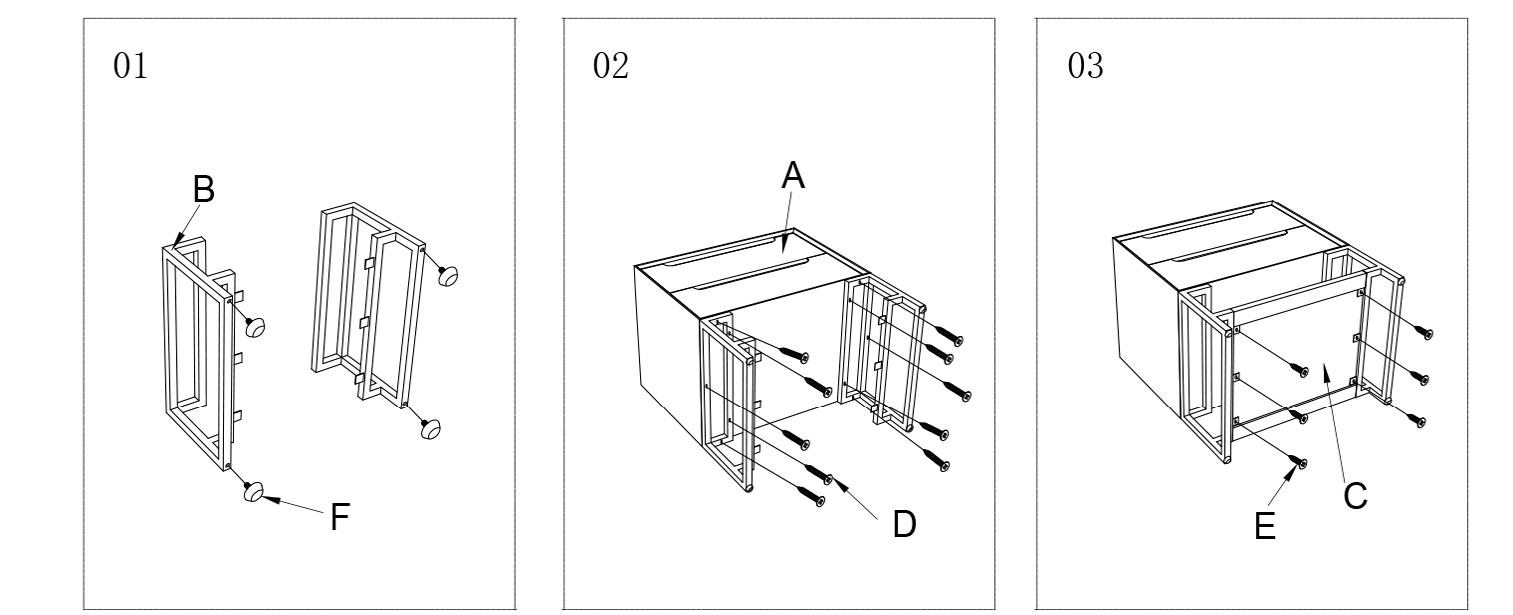 Assemble screws, rings, and parts for mounting. Mount cabinet to wall and install all scews and rings. Ensure all fixing points are secure and tightly screwed in. Add caps to conceal screws.