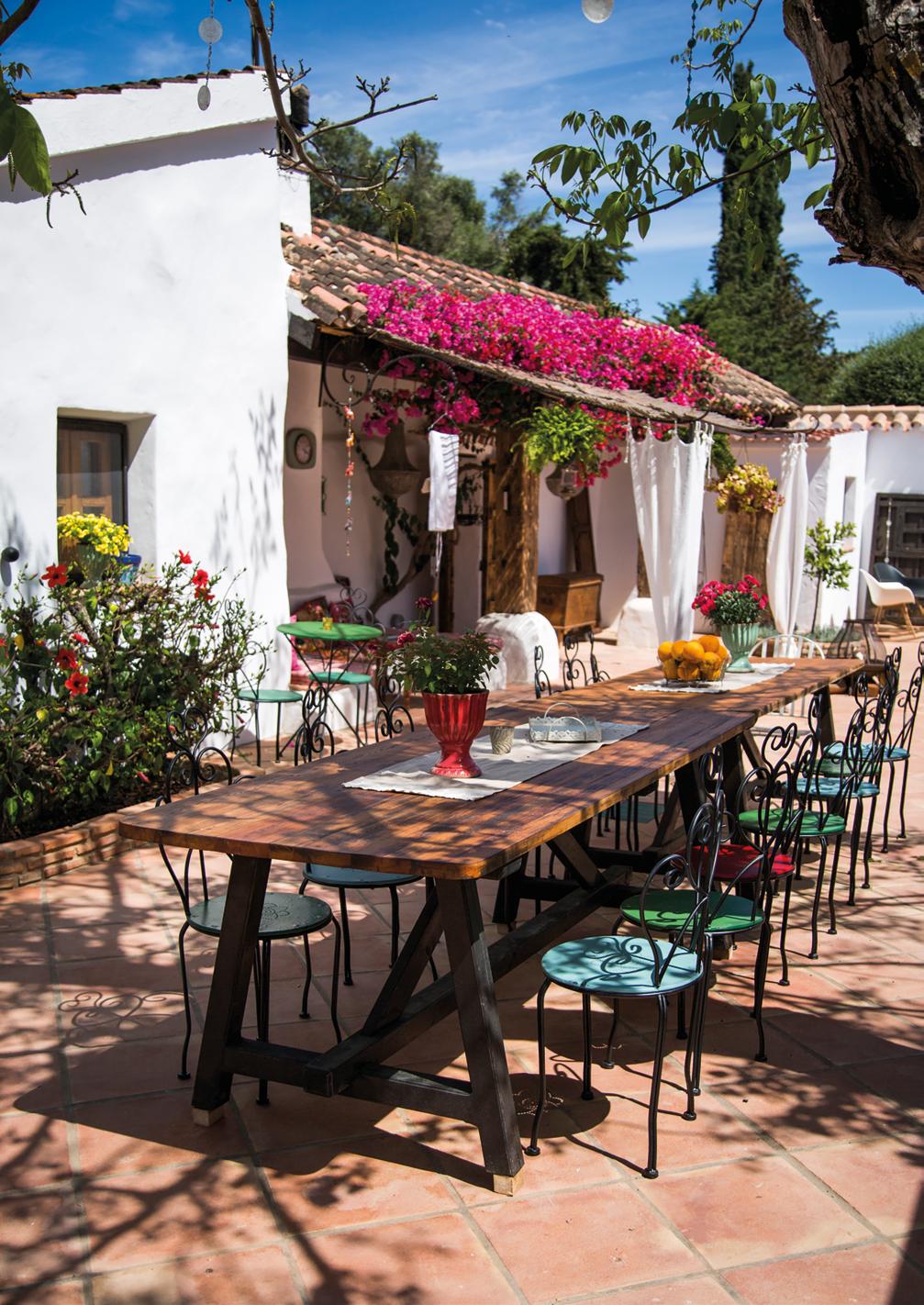 El camino de grava que da acceso a la casa es irregular y está bacheado. En Jimena de la frontera, gire a la derecha hacia el Parque Natural de los Alcornocales, entrando en los bosques salvajes de alcornoques y eucaliptos pasando por un angosto puente de hierro, conduciendo siempre sobre el camino de grava. Al llegar a Rancho Los Lobos, una puerta da acceso a un pequeño paraíso: se trata de un mundo diferente, un lugar especial entre suaves colinas, pastos de cabras, ganado y caballos. Esporádicamente, una comitiva pasa despacio y confiere al lugar un aliento de nostalgia. Nuestro rancho, con su jardín, los coquetos rincones y enramadas que se distribuyen aleatoriamente alrededor de la casa, los prados y sus románticos establos, constituye un refugio genuino situado en el corazón del idílico Parque Natural de los Alcornocales. Se respira una maravillosa tranquilidad entre las palmeras, los caballos y la refrescante piscina. Una pareja suizo-austríaca ha gestionado de manera eficaz la casa durante más de 40 años y en 2018 nosotros la convertimos en una pequeña joya repleta de artesanía y atención a los detalles. Reformamos asimismo unos cimientos que tienen más de cien años de antigüedad.