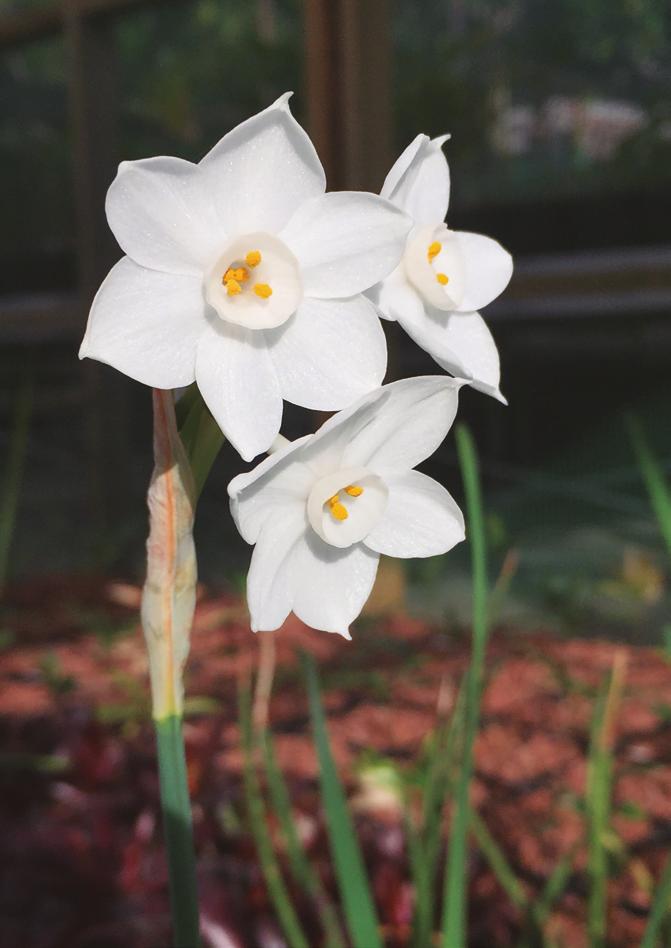 Muchas de las plantas del género Narcissus se denominan comúnmente narcisos. El narciso silvestre, grande y amarillo, Narcissus pseudonarcissus, en sus muchas formas cultivadas, es la especie que asociamos con el nombre de narciso. Sin embargo, hay muchas otras, todas ellas bulbosas. Los gibraltareños están muy familiarizados con otra especie de Narcissus, quizás sin darse cuenta de que también es una forma de narciso. El Narcissus papyraceus es una especie blanca más pequeña que produce flores muy fragantes. Las flores aparecen durante el otoño y principios del invierno en Gibraltar, por lo que la especie se asocia con la Navidad. Es común en todo Gibraltar y especialmente en la Reserva Natural de Gibraltar. Debido al sustrato muy poroso de la piedra caliza de Gibraltar, las flores de las plantas se marchitan mucho antes que las de los suelos arcillosos de la cercana España, que pueden durar hasta marzo. Los narcisos se distribuyen por el Mediterráneo y Europa Central. El sur de la Península Ibérica es un centro de diversidad de Narcissus y se pueden encontrar muchas especies de diferentes tamaños, formas y colores (blanco o amarillo, o ambos) en el interior, especialmente en las montañas cercanas a Ronda y Grazalema. Una segunda especie, el Narcissus tazetta, es rara en Gibraltar y puede haber sido introducida por el hombre.