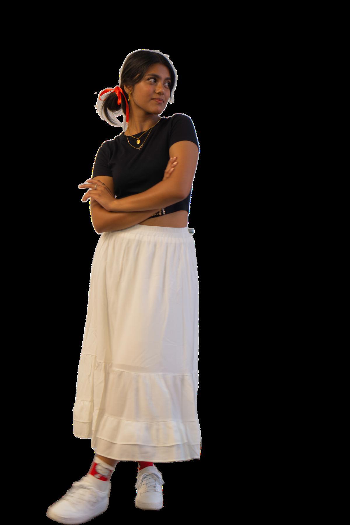 The Anarkali is a form of women's formal wear, originating from the Indian subcontinent. The word "Anarkali" translates to "the delicate bud of the pomegranate flower." This particular dress - the Salwar Kameez - contains three parts: the Salwar (trousers), the Kameez (dress), and the Dupatta (scarf). Additionally, this Anarkali Salwar Kameez is accompanied by a tikli, aheadaccessoryplacedinthemiddlepartofthehair.