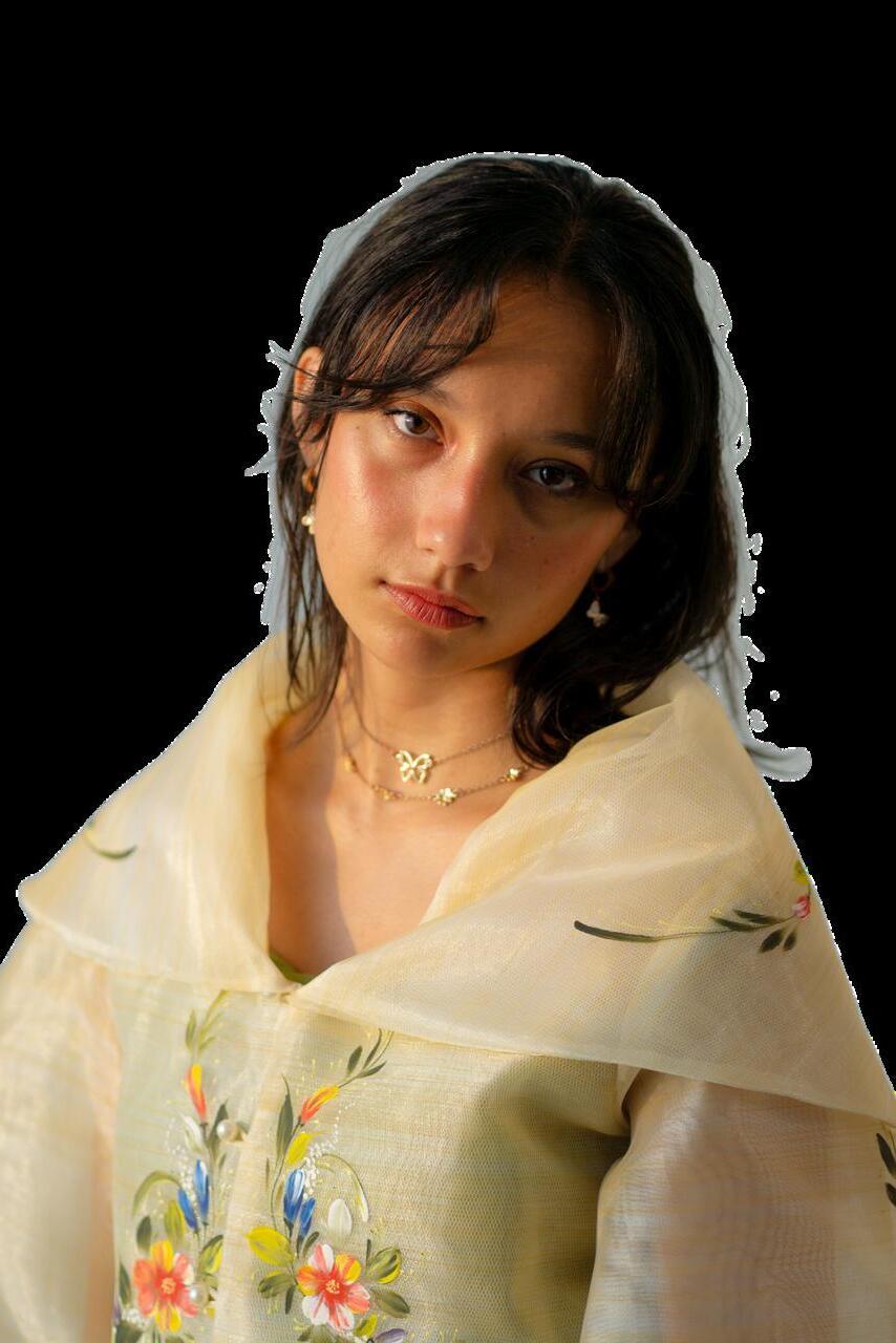 The Filipiniana Maria Clara Shawl is worn with a dress or skirt, representing historical Maria Clara traditional wear made from pineapple organza. With hand painted flowers and butterfly sleeves, this design was popularized in the early 20th century and has become a symbolofurbanFilipinotraditionalwear.