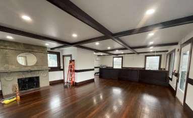 Original hardwood floors found under carpet New Council Dias, refinished floors, refurbished fire place, and new beams