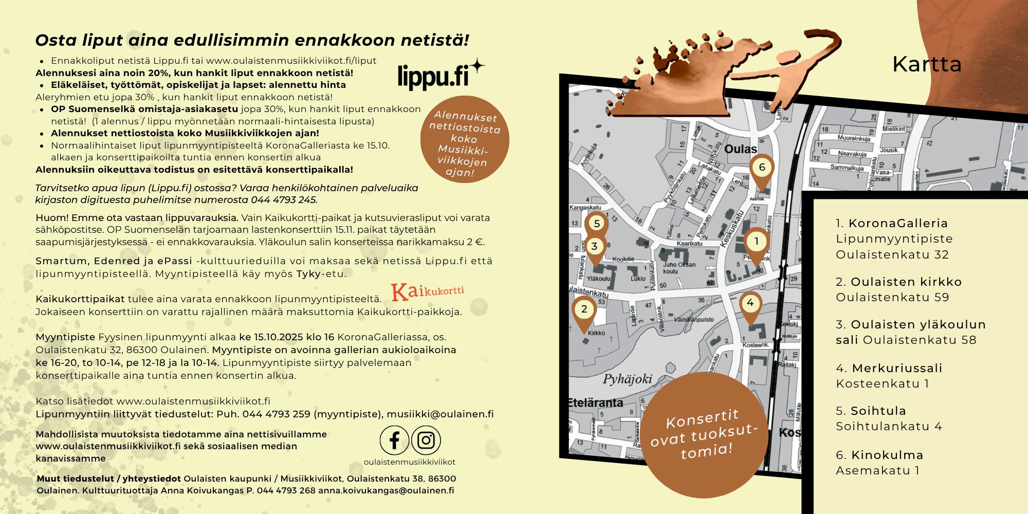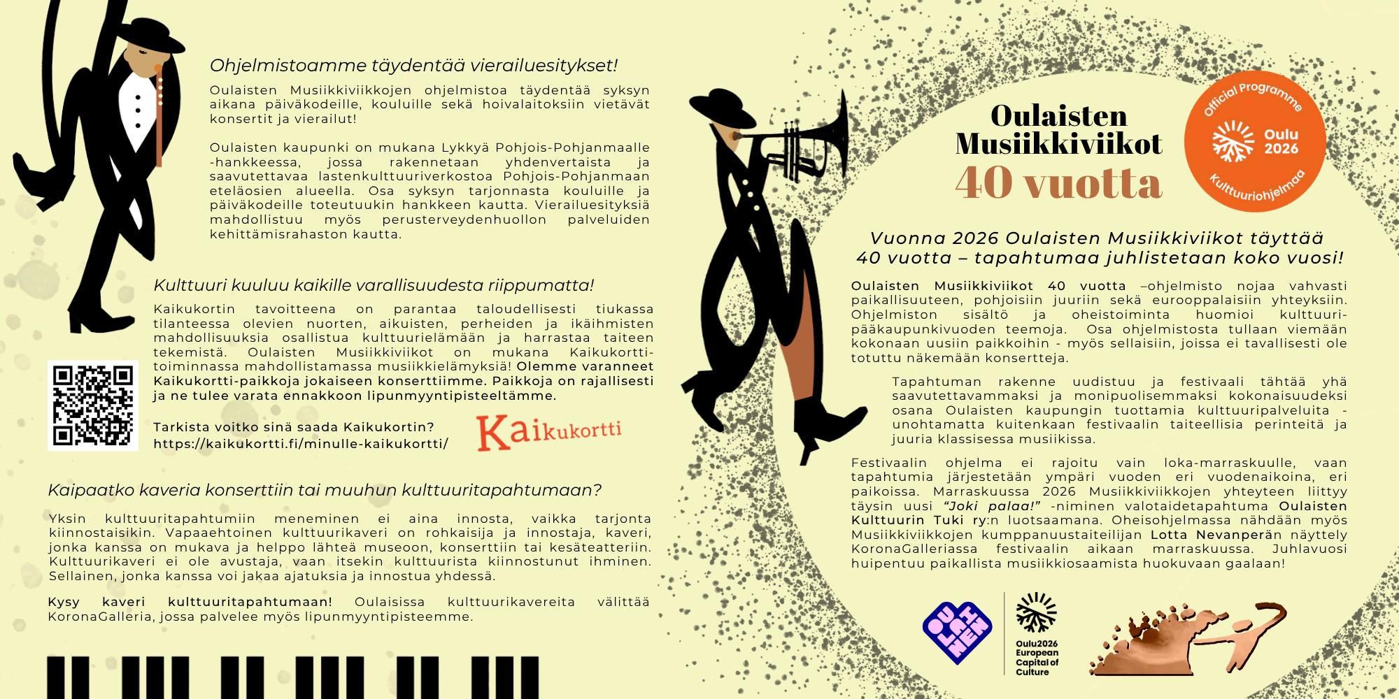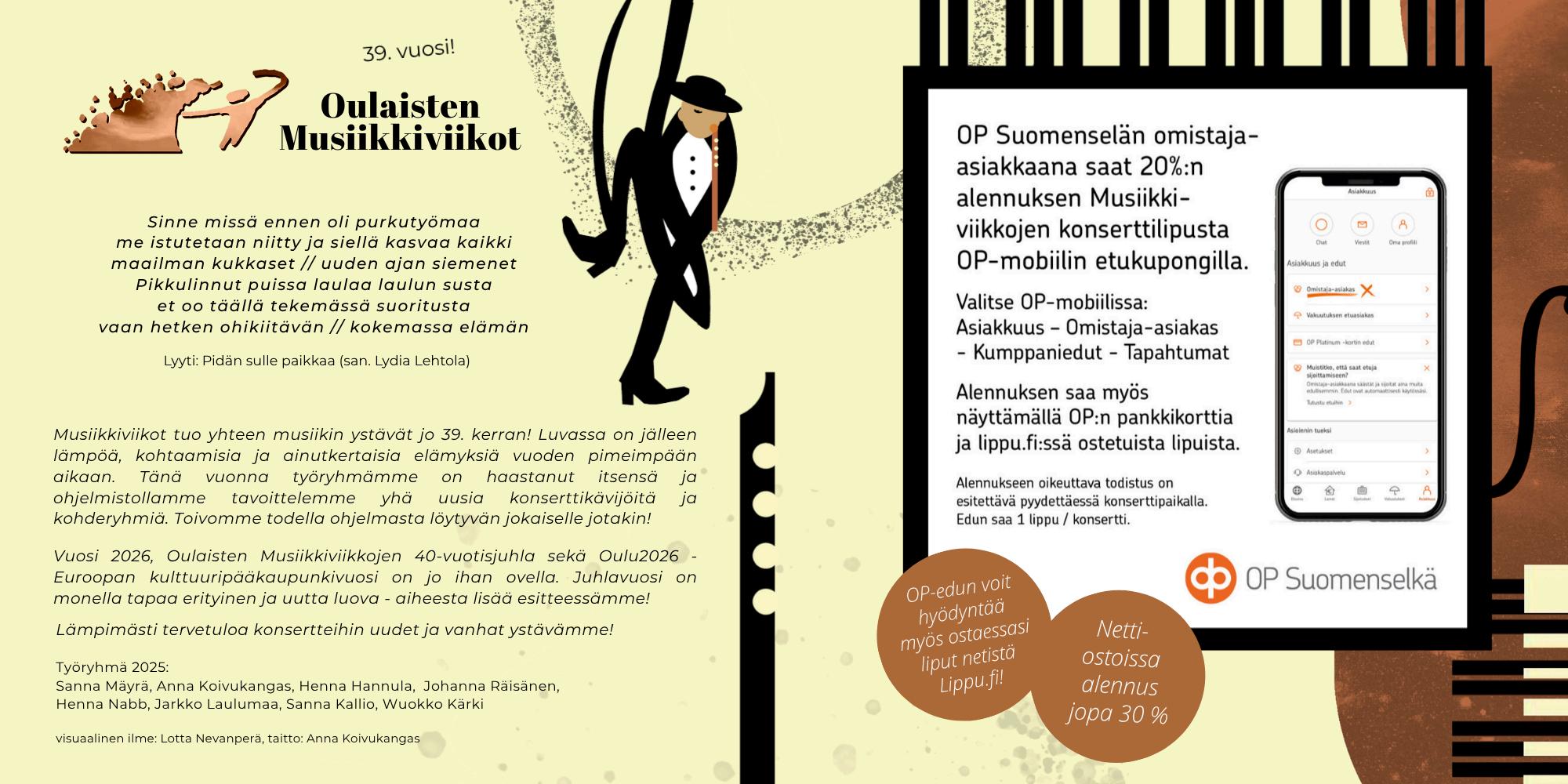 Oulaisten Musiikkiviikot tuovat yhteen musiikin ystävät jo 39. kerran! Luvassa on jälleen lämpöä, kohtaamisia ja ainutkertaisia elämyksiä vuoden pimeimpään aikaan.