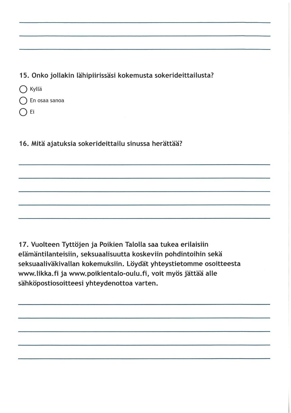 Sokerideittailu -selvitystyöhanke on sijoittunut koko Pohjois-Pohjanmaan alueelle ja selvitystyöstä saatu tieto ja materiaali ovat koko alueen käytössä. Ilman yhteistyötä alueen nuoria kohtaavien ammattilaisten kanssa selvitystyö olisi jäänyt suppeaksi. Tahdomme kiittää oikeusministeriötä selvitystyön mahdollistamisesta, kaikkia selvitystyöhön liittyvien materiaalien jakaneita, kyselyihin vastaamiseen rohkaisijoita ja koulutuksiin osallistuneita yhteistyöstä ja mielenkiinnosta ilmiötä kohtaan.