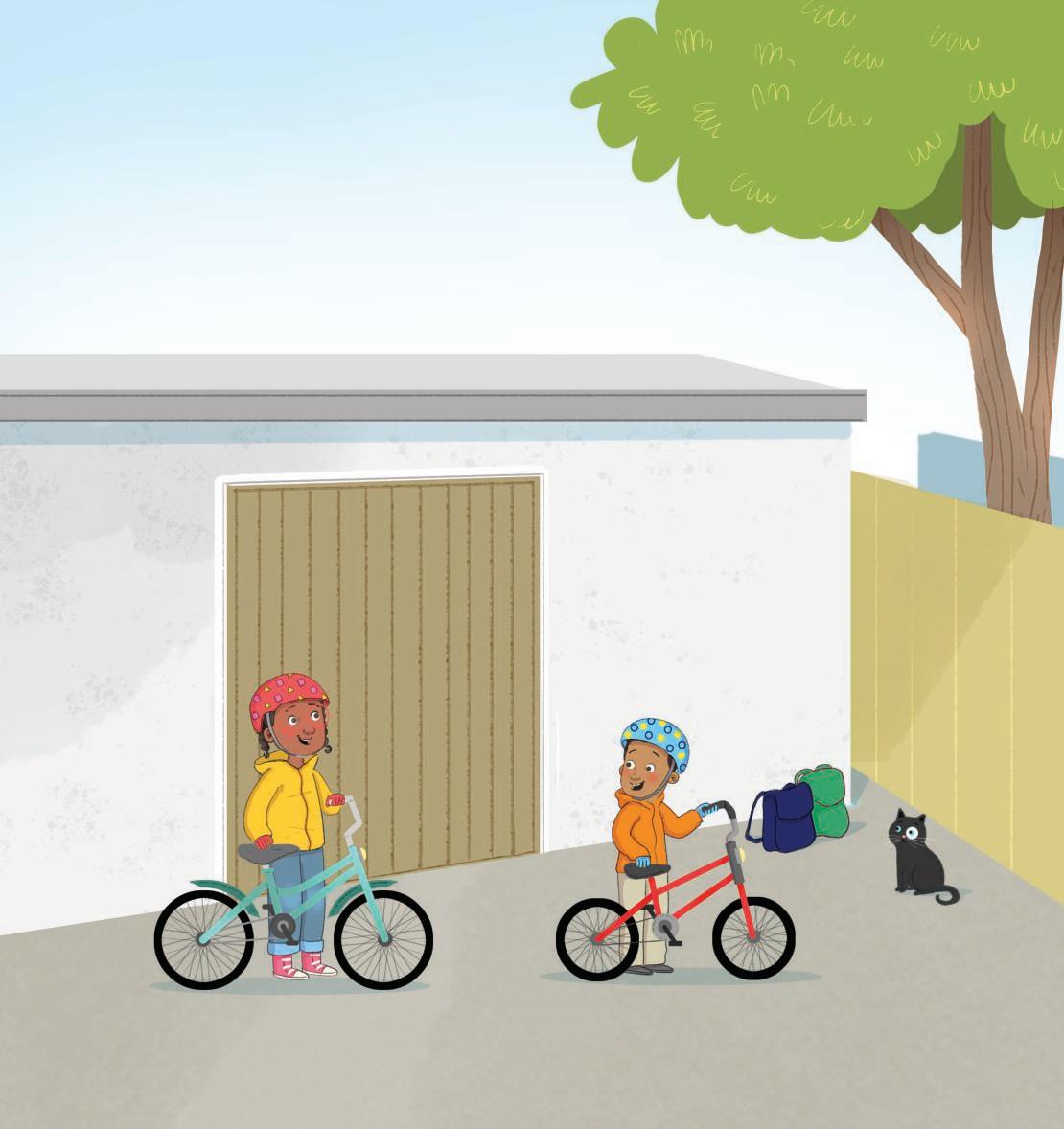 Nadia and Omar put on their coats and gloves. Then they ran to get their bikes from the yard.