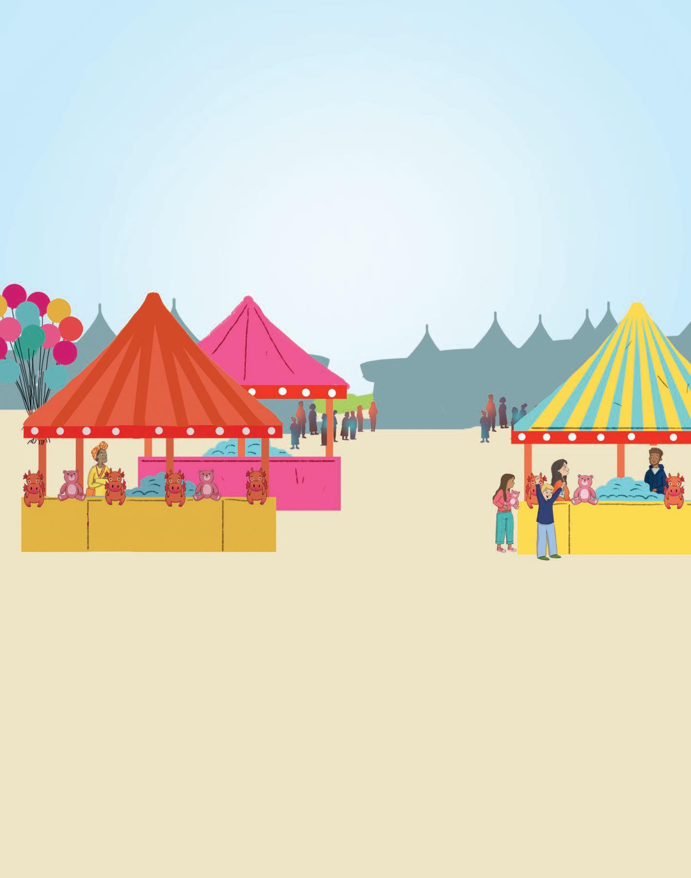 Children are learning to connect their understanding of equal groups to division. They focus on grouping objects into specif ic amounts rather than sharing them equally. They also encounter the division symbol for the f irst time. In this book, children will see various examples of grouping in the games and rides at the fair.