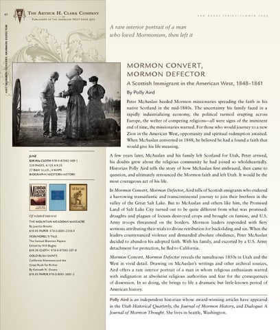 Mormon Convert, Mormon Defector A Scottish Immigrant in the American West, 1848–1861 By Polly Aird Peter McAuslan heeded Mormon missionaries spreading the faith in his native Scotland in the mid-1840s. The uncertainty his family faced in a rapidly industrializing economy, the political turmoil erupting across Europe, the welter of competing religions—all were signs of the imminent end of time, the missionaries warned. For those who would journey to a new Zion in the American West, opportunity and spiritual redemption awaited. When McAuslan converted in 1848, he believed he had a found a faith that would give his life meaning. June $39.95s Cloth 978-0-87062-369-1 320 pages, 6.125 x 9.25 27 b&w illus., 4 maps Biography/Western History