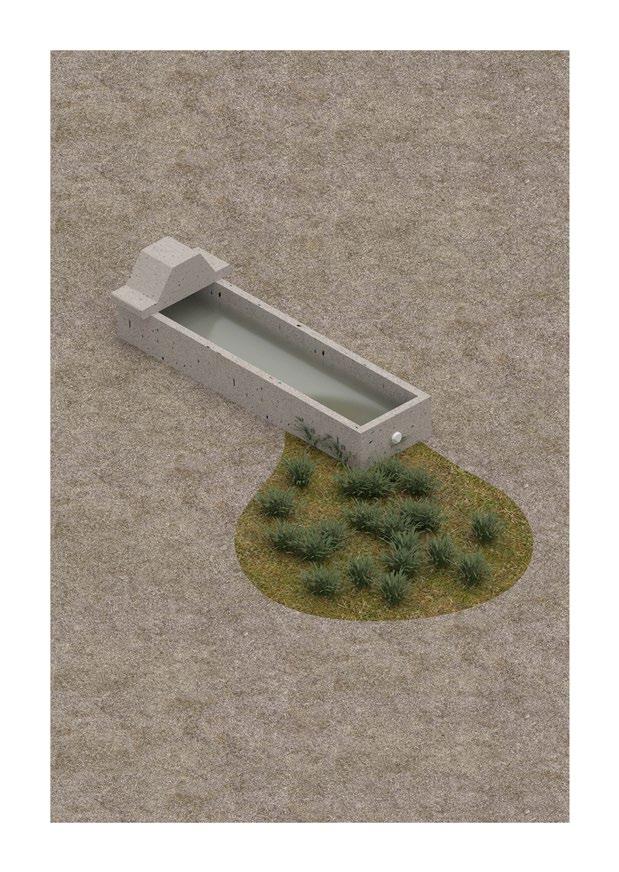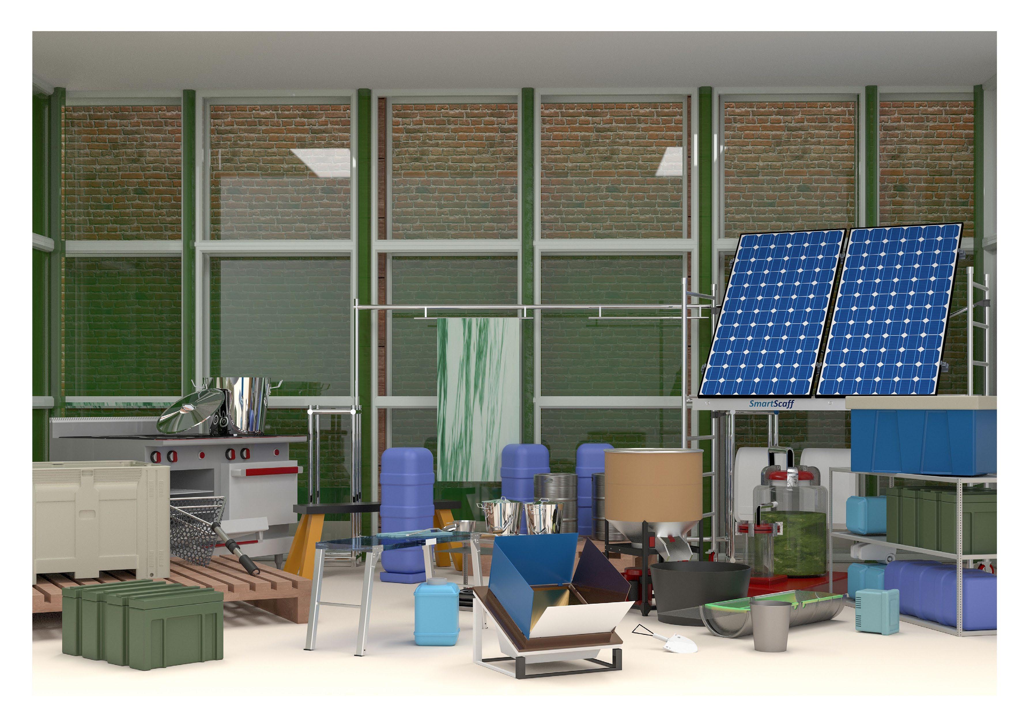 The strategies of recycling materials are primarily divided into two categories: algae and straw. The green component in pervious slide involves the algae from the site and mixing with waste plastics to create bioplastic and fabrics.