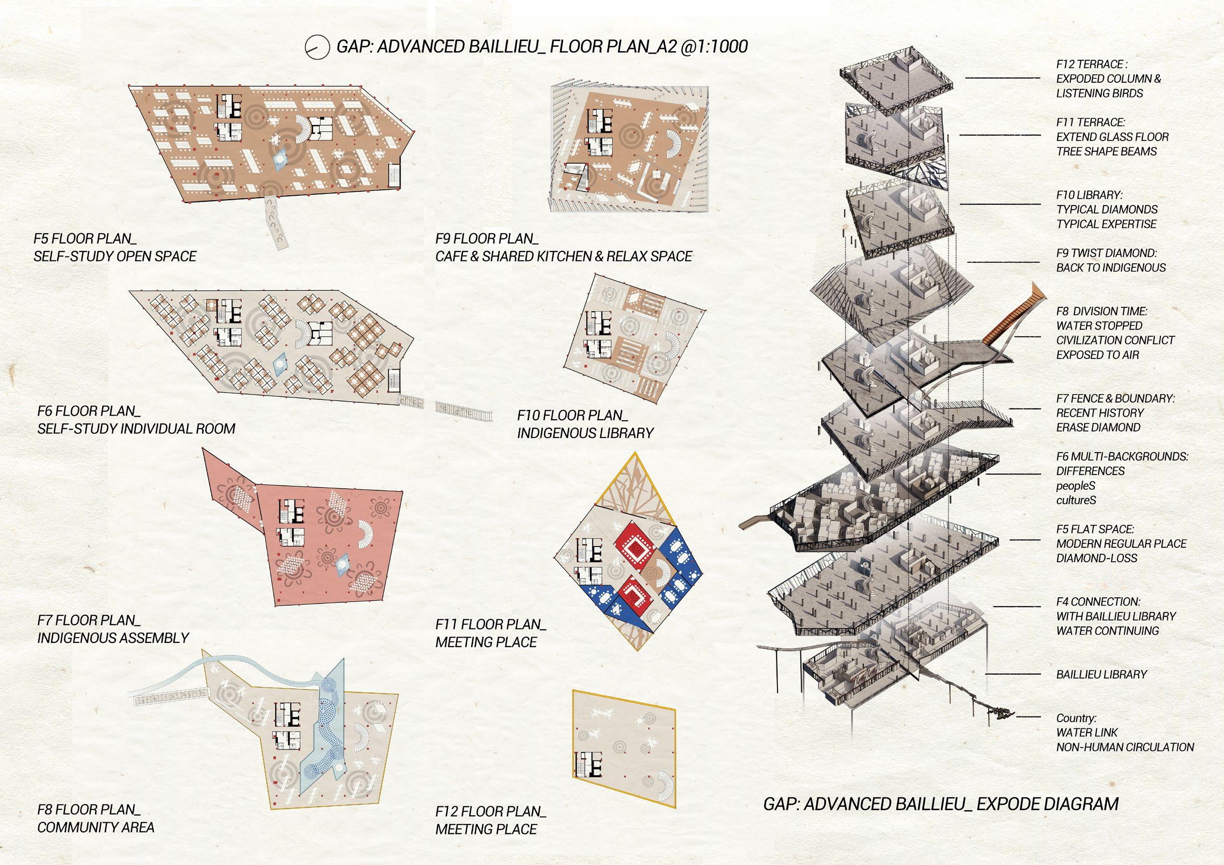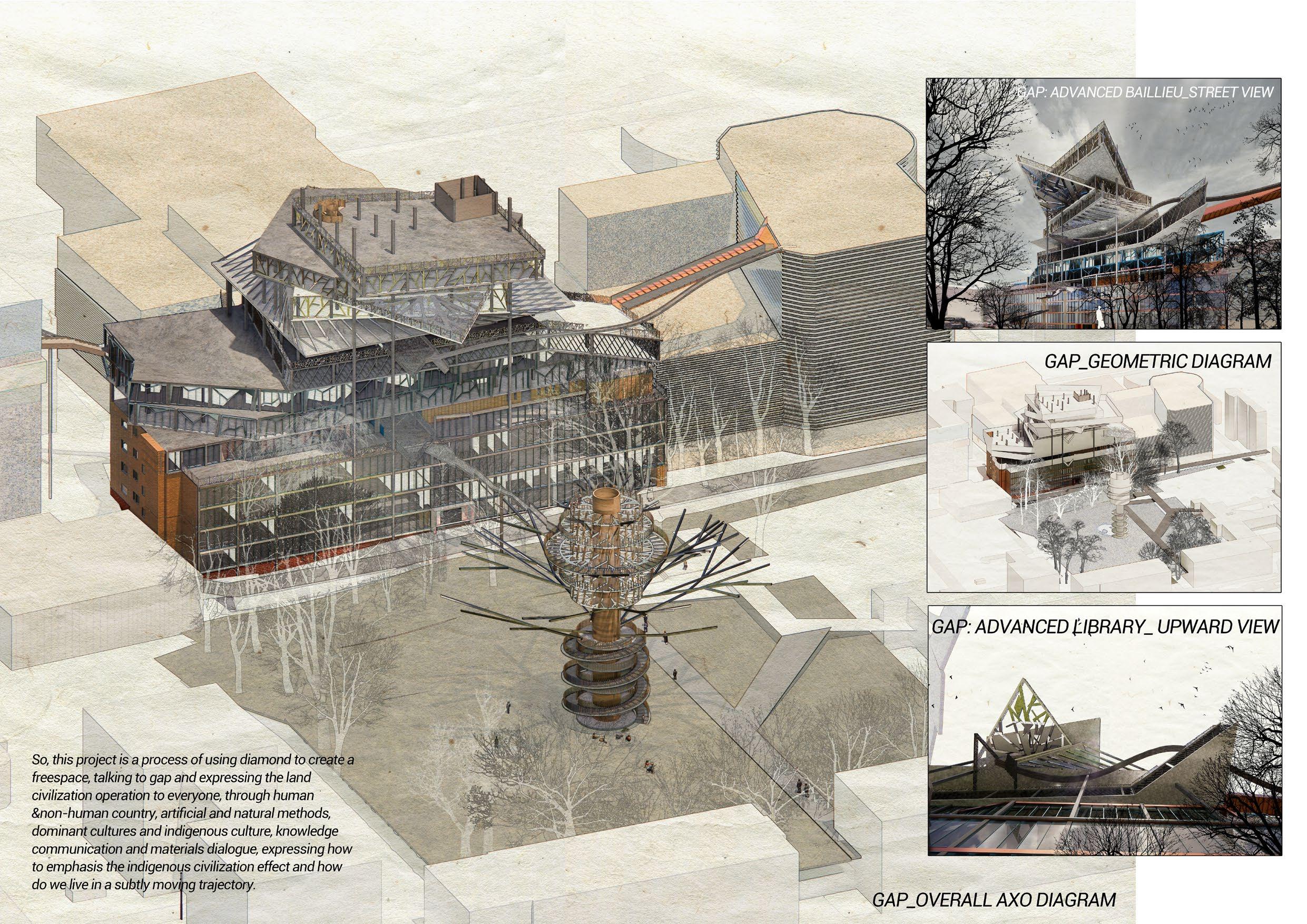 The exterior and interior architectural language, including a pavilion and some physical ways to echo the importance of livings, sky, country and water, creating an opportunity for modern people to dialogue with Kulin nation.